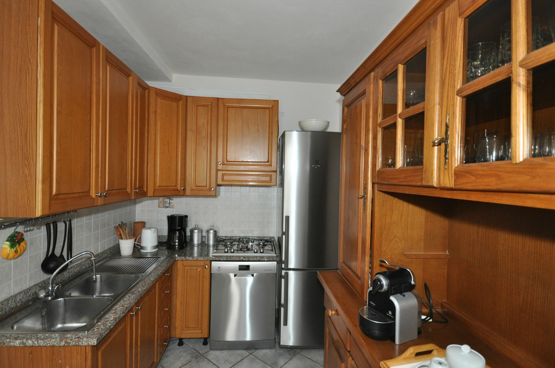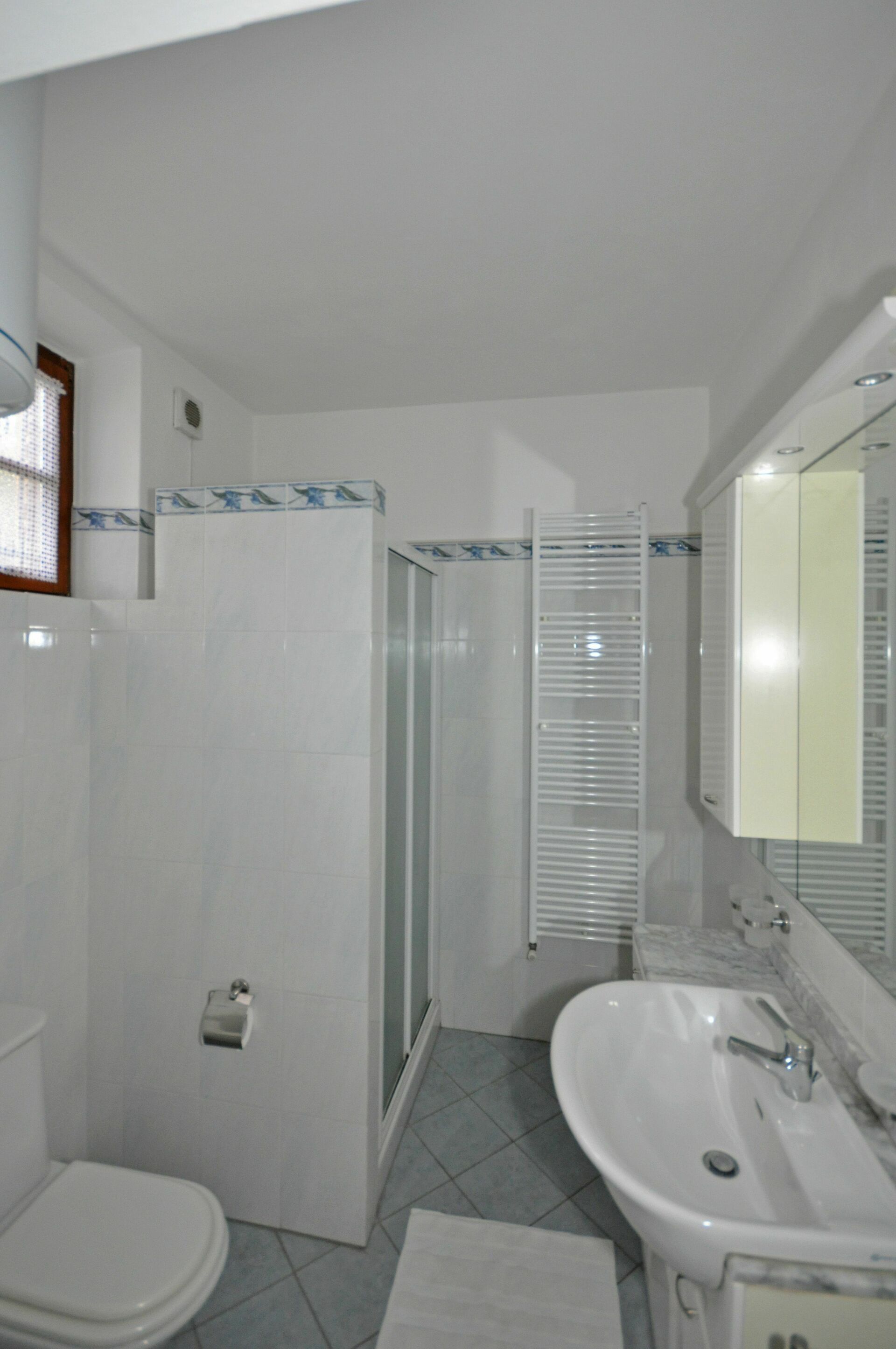 1 gradino più in alto: camera di passaggio con 2 letti singoli, cucina (fornino elettrico, lavastoviglie, freezer, bollitore, macchina da caffè americano, macchinetta da caffè espresso), camera matrimoniale, bagno con doccia (senza bidet).