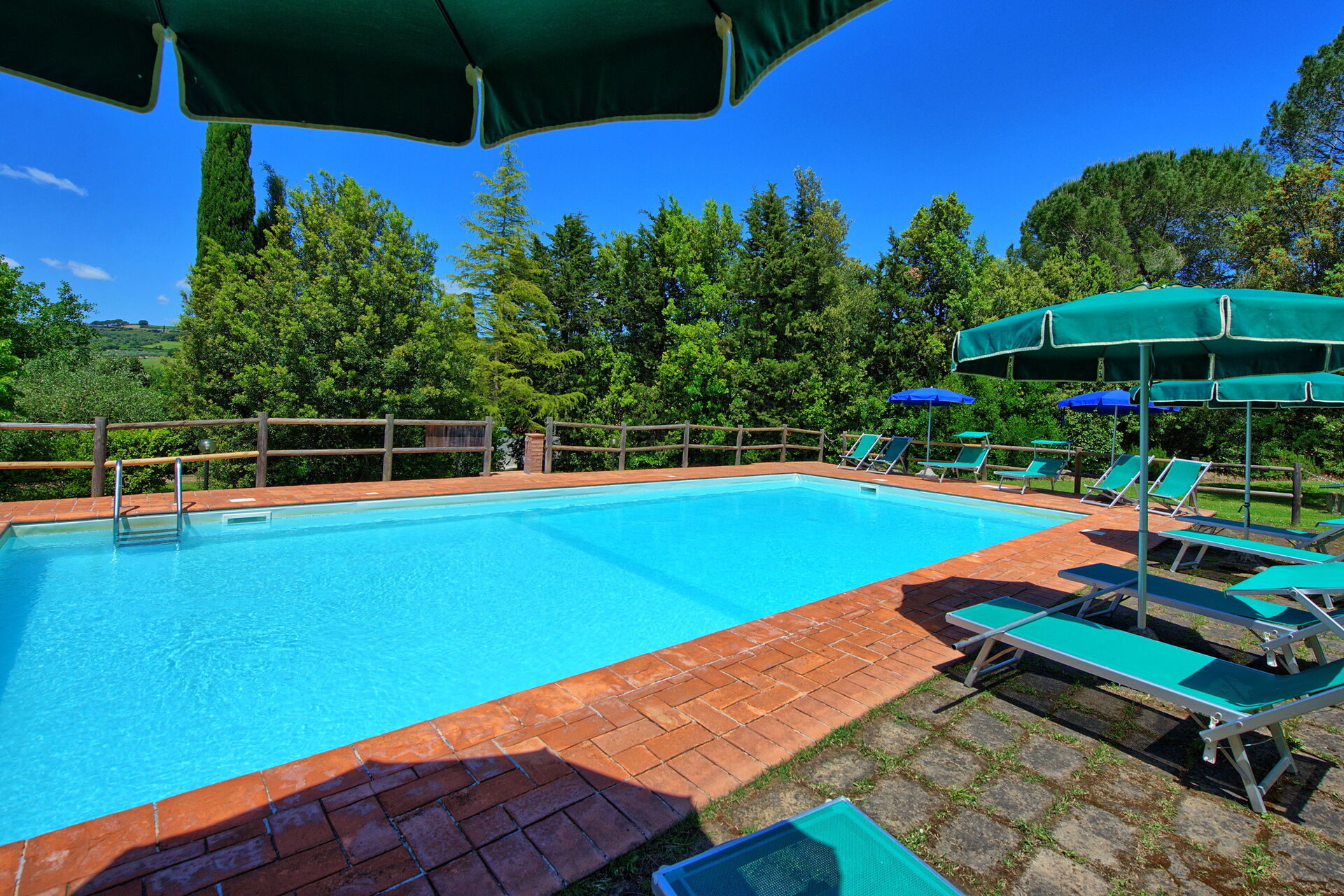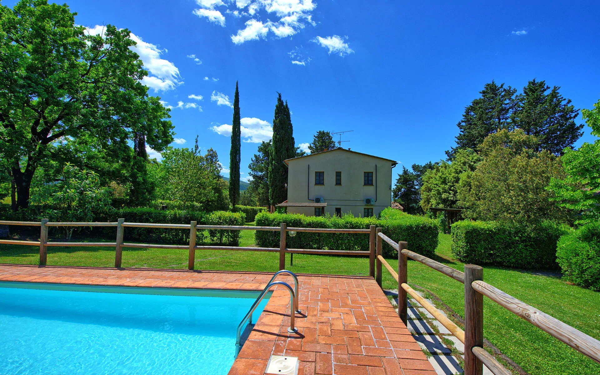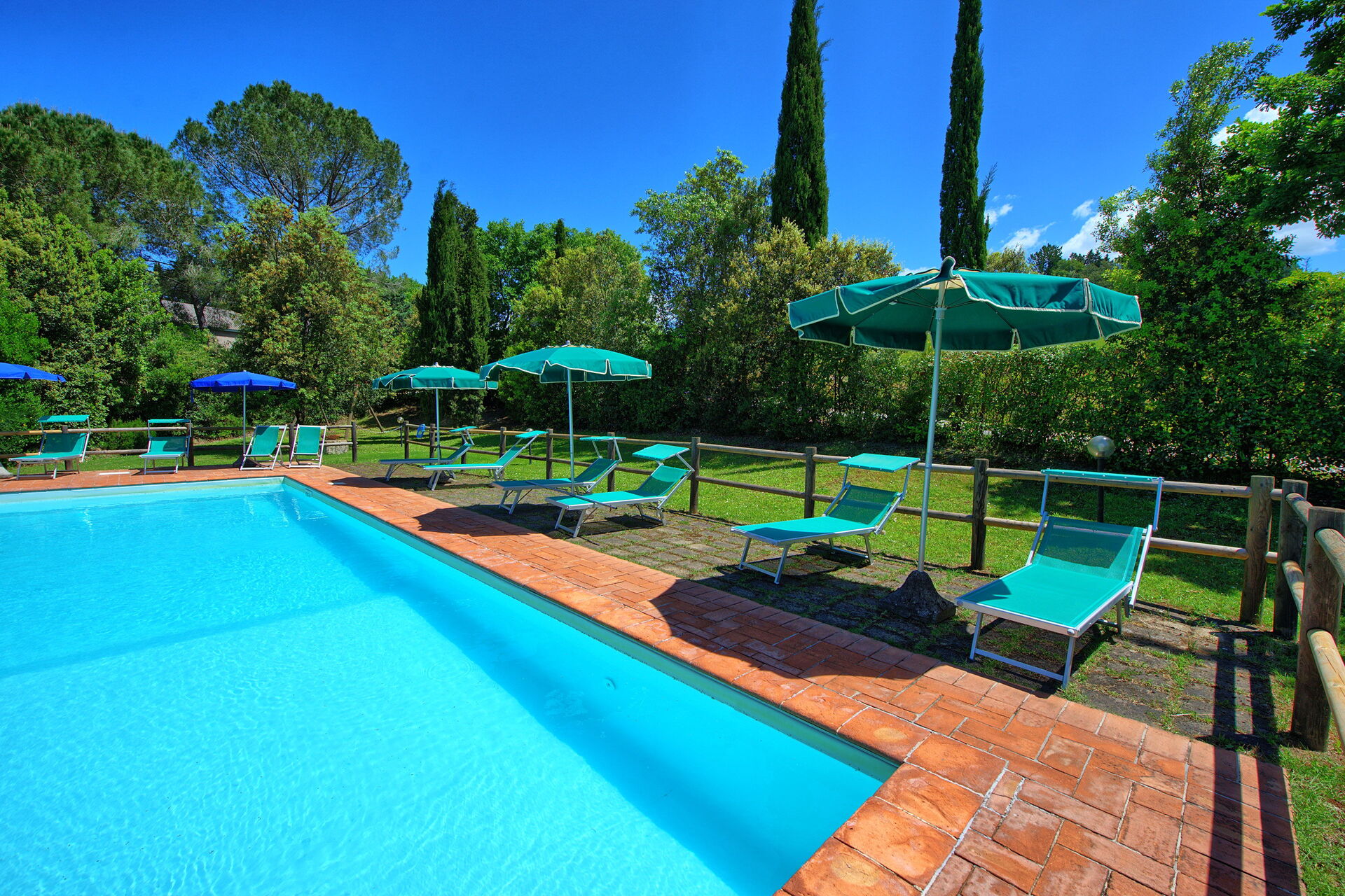 Questa casa in affitto in Chianti è immersa nella campagna toscana e campi coltivati circondano la proprietà. Il giardino curato ospita una bella piscina privata dotata di solarium con lettini ed ombrelloni: un luogo perfetto in cui rilassarsi e rinfrescarsi nelle calde giornate estive in compagnia di amici e familiari.