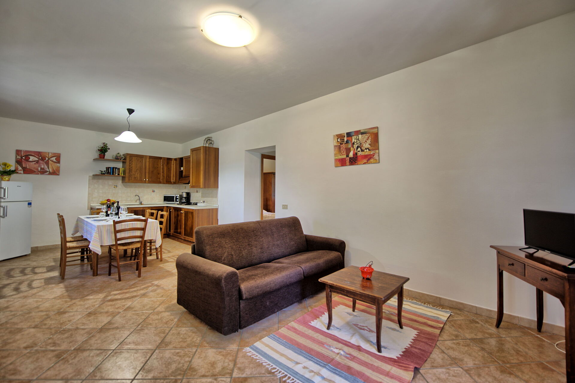 Primo piano: soggiorno (TV satellitare) con divano letto matrimoniale e zona pranzo con angolo cottura, camera matrimoniale, camera con 2 letti singoli, bagno con doccia.