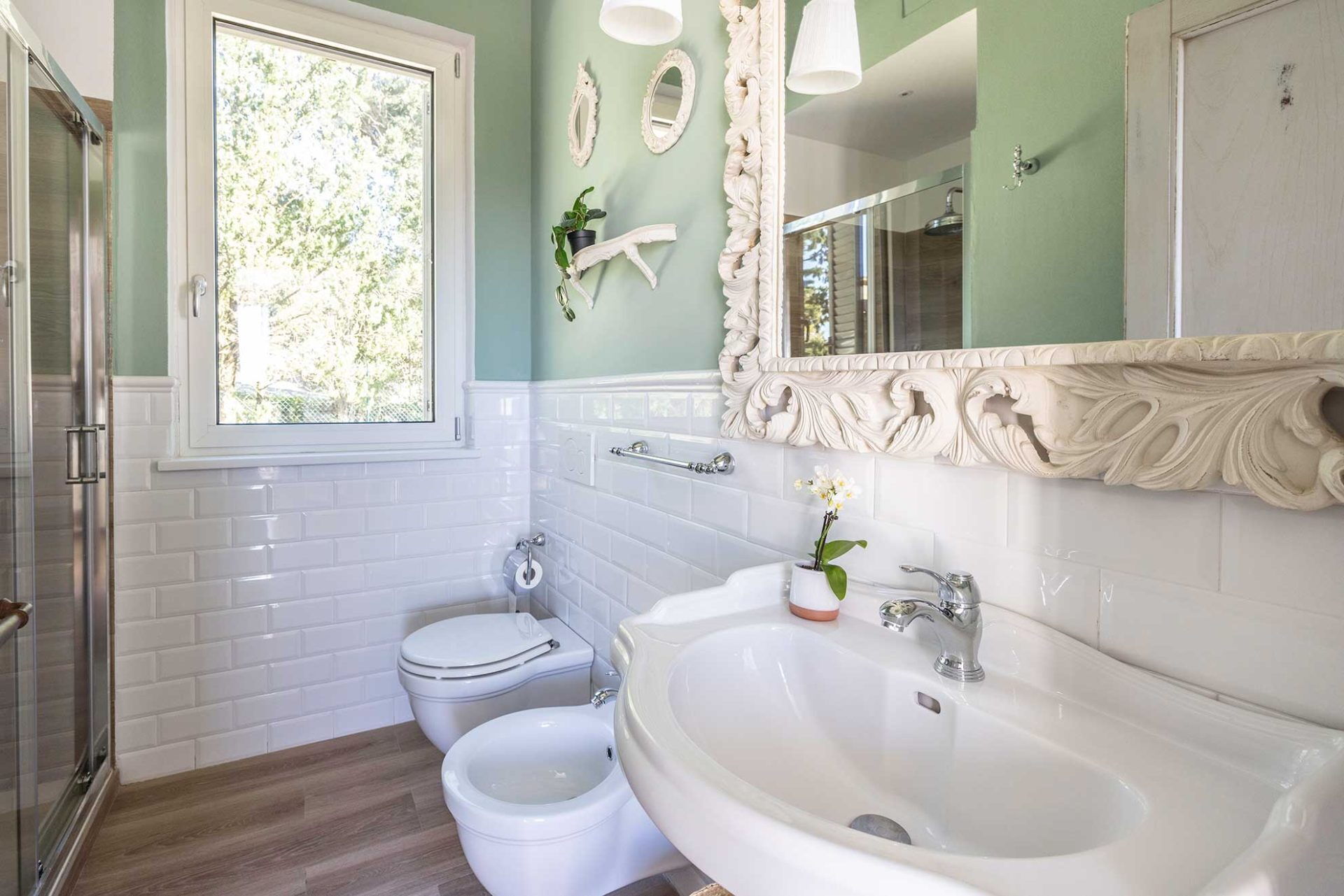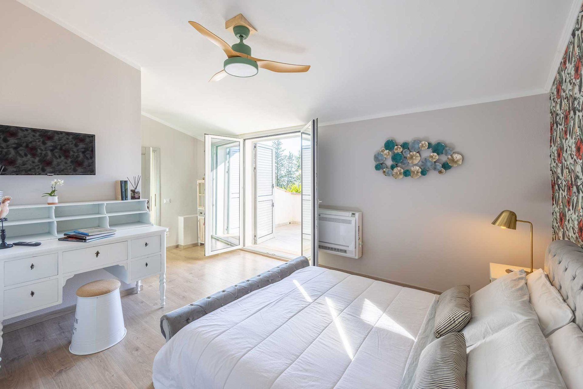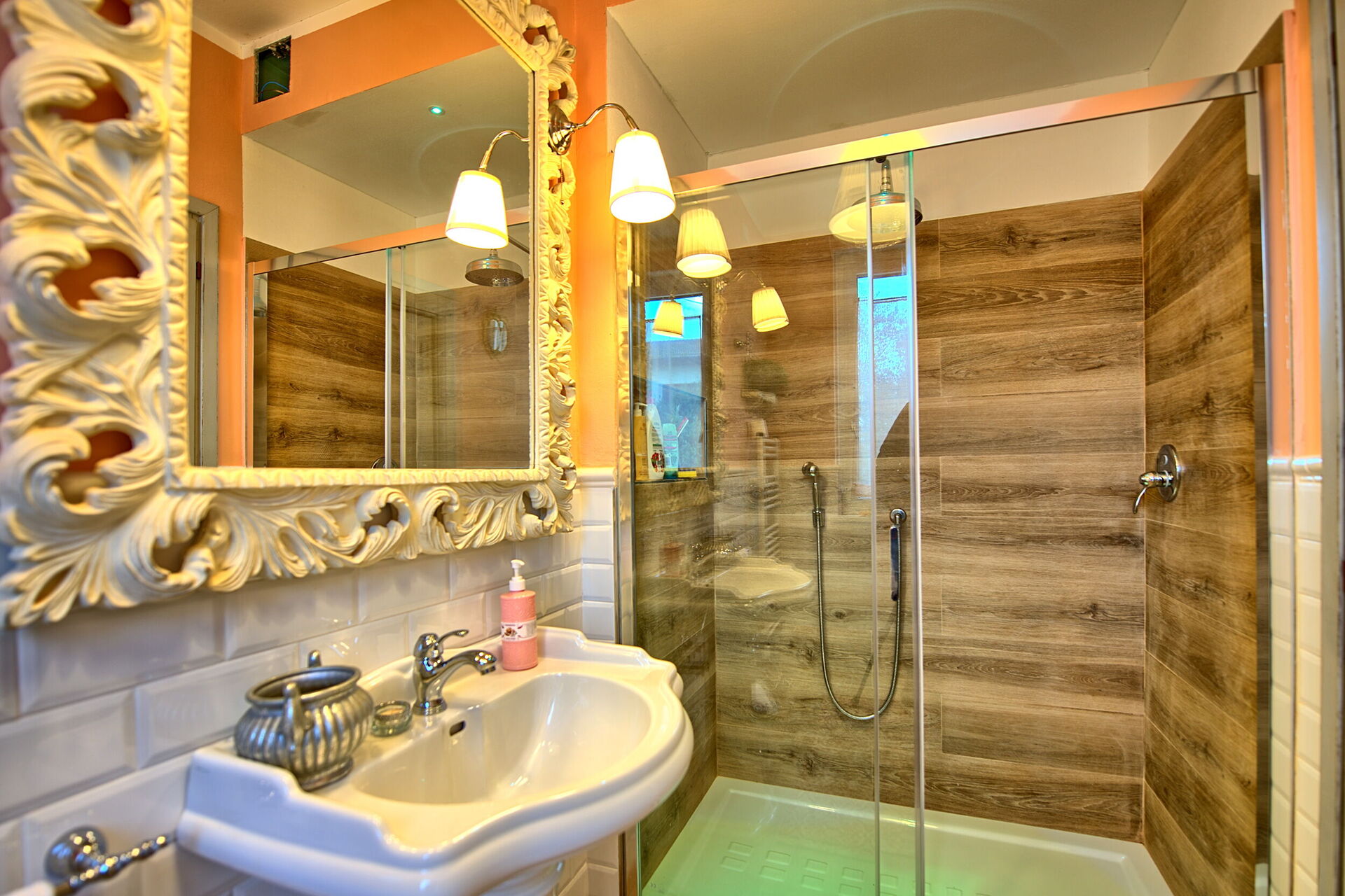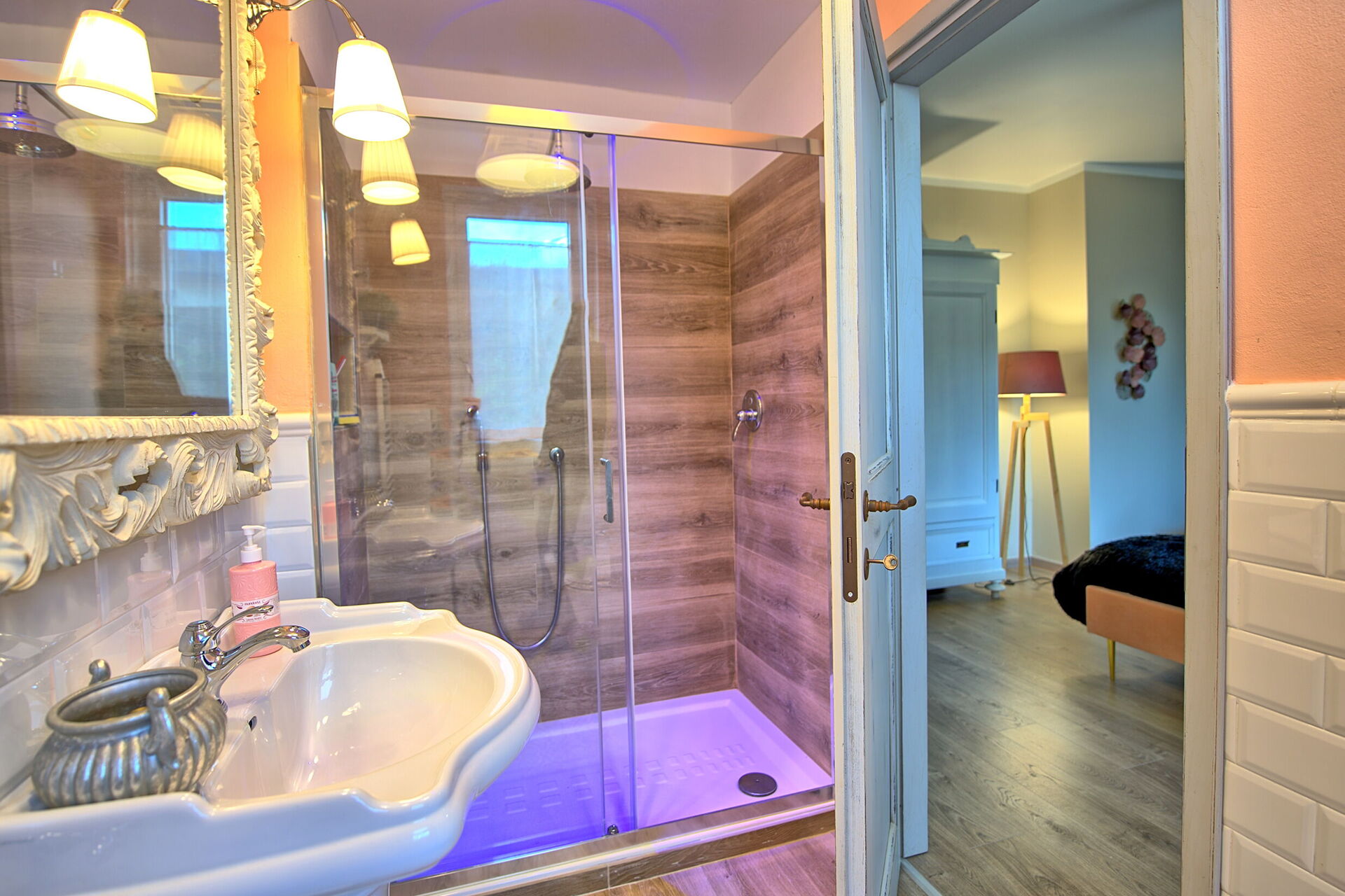 Primo piano: camera matrimoniale con bagno privato con doccia e accesso a panoramica terrazza privata.
