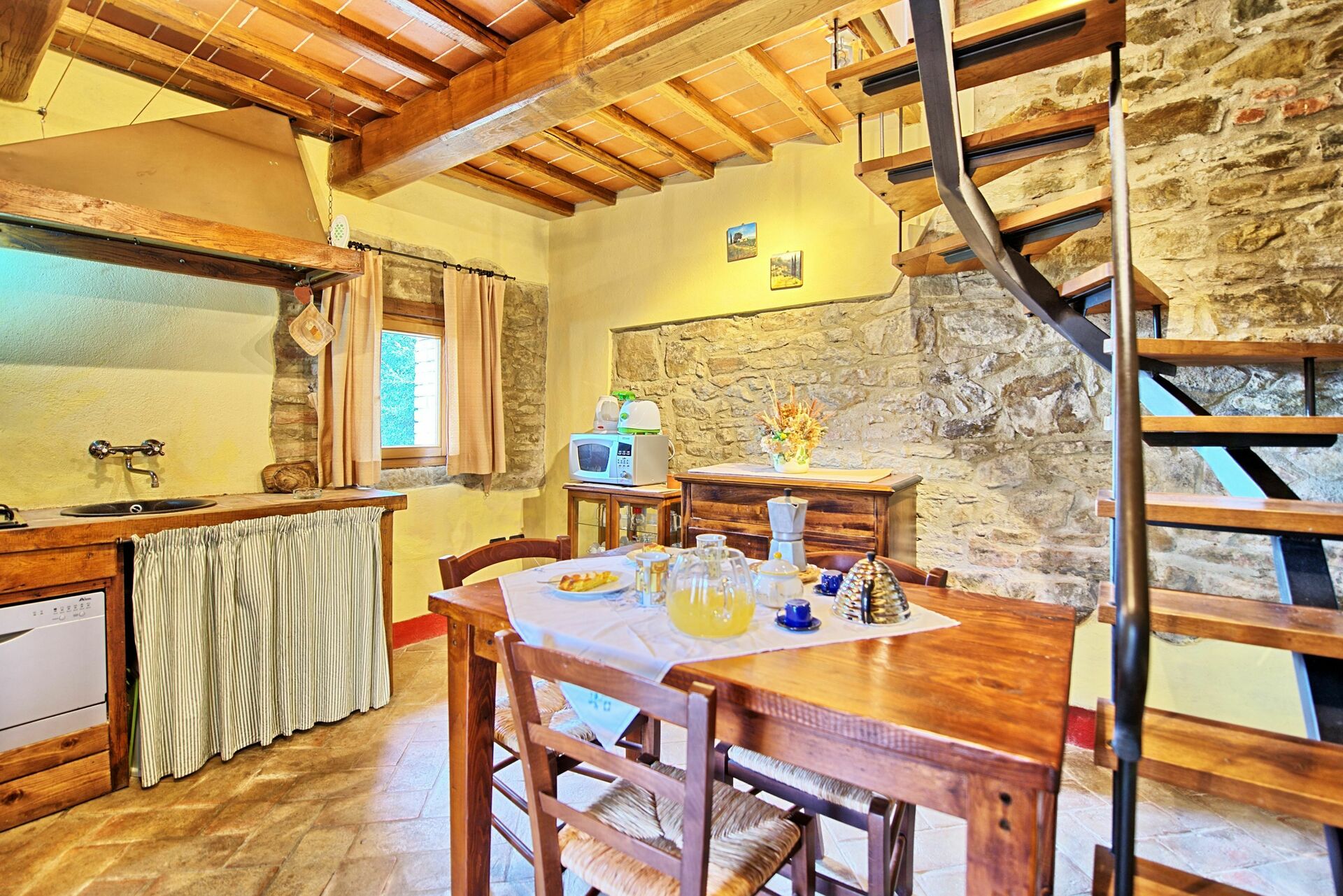 Piano terreno: piccolo soggiorno con zona pranzo e angolo cottura (lavastoviglie, microonde).