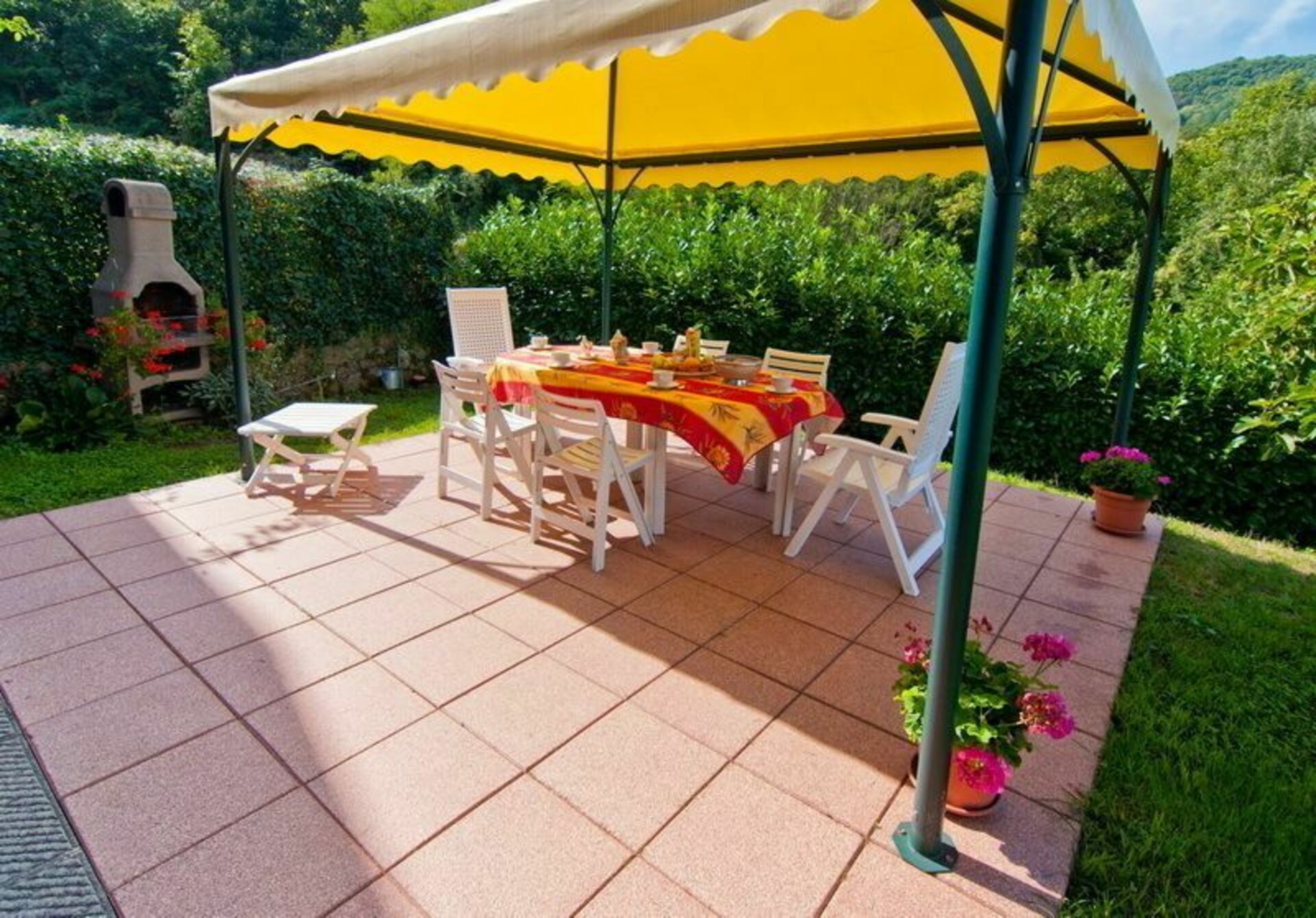 Spazioso giardino attrezzato con barbecue, tavolo e sedie.