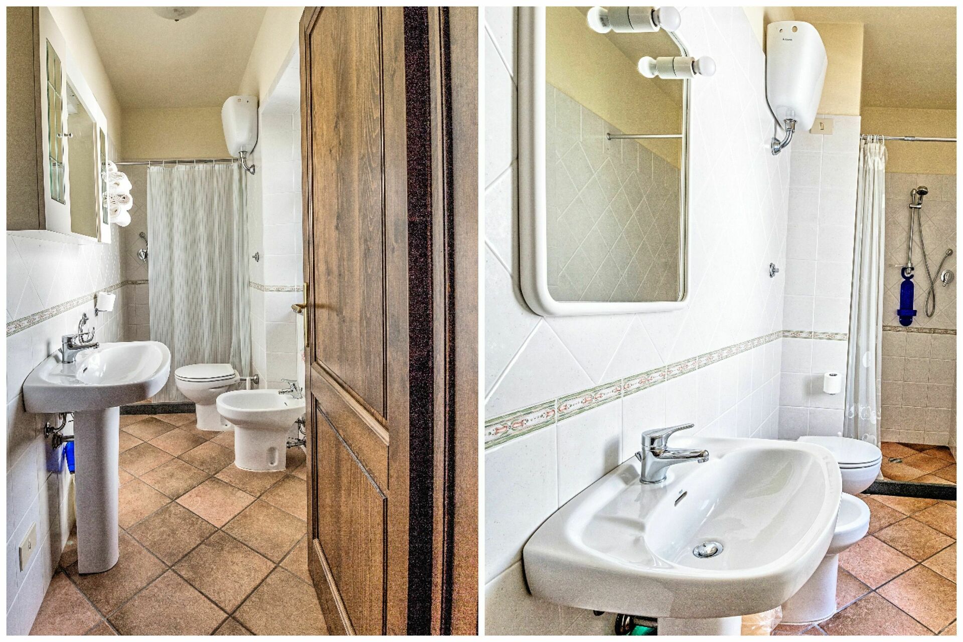 Primo piano: camera matrimoniale con bagno privato con doccia, camera con 2 letti singoli e bagno privato con doccia.