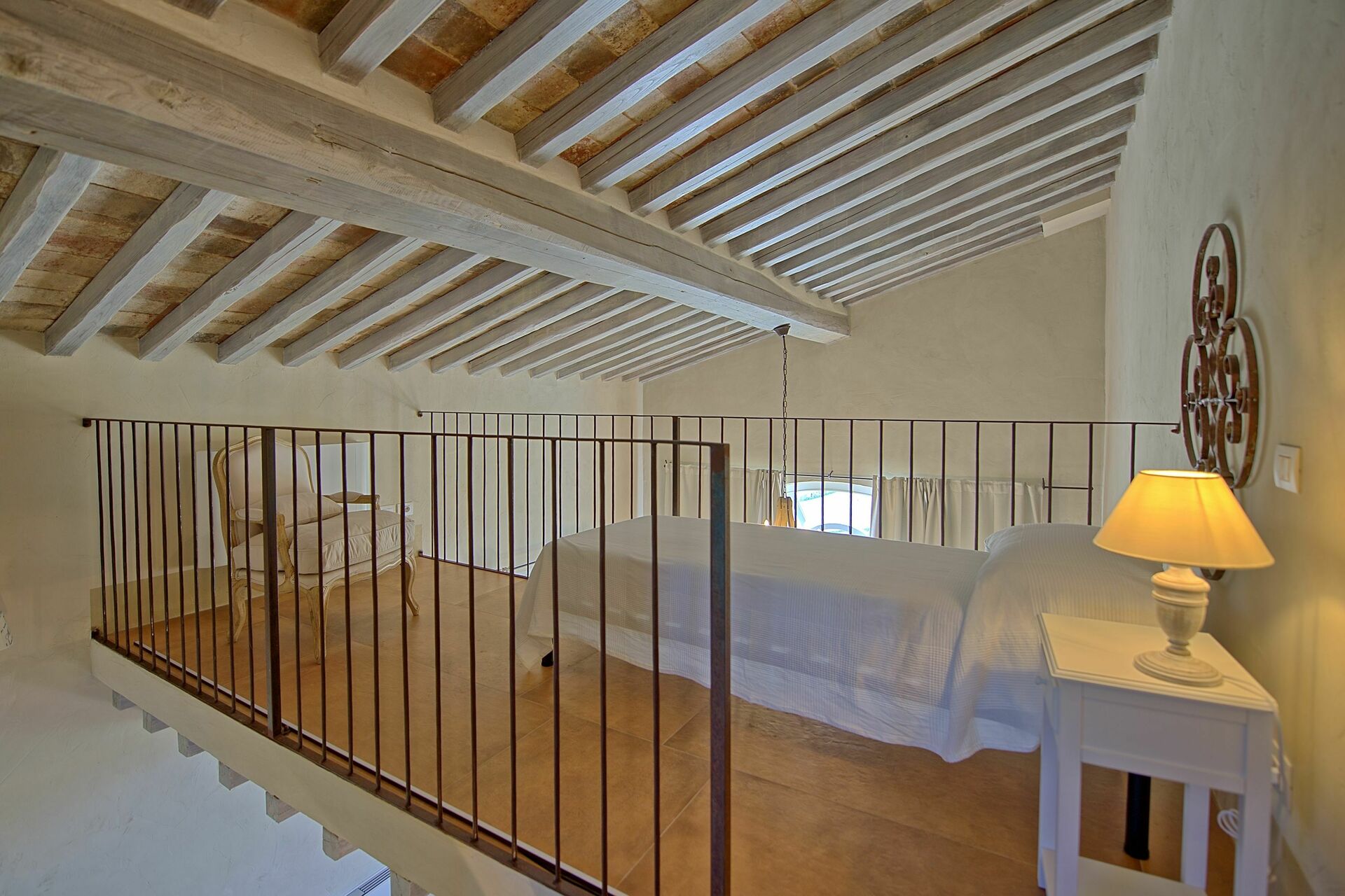 Primo piano: camera (aperta sulla zona sottostante) con 2 letti singoli e bagno con doccia. Questa camera può essere messa in comunicazione con la casa principale tramite l'apertura di una porta che la collega ad una delle camere matrimoniali descritte al primo piano.