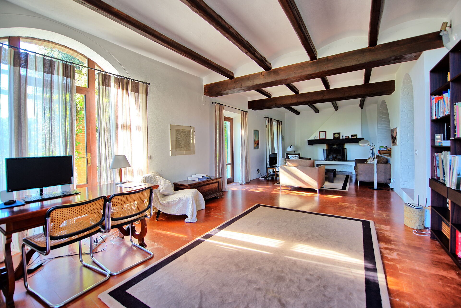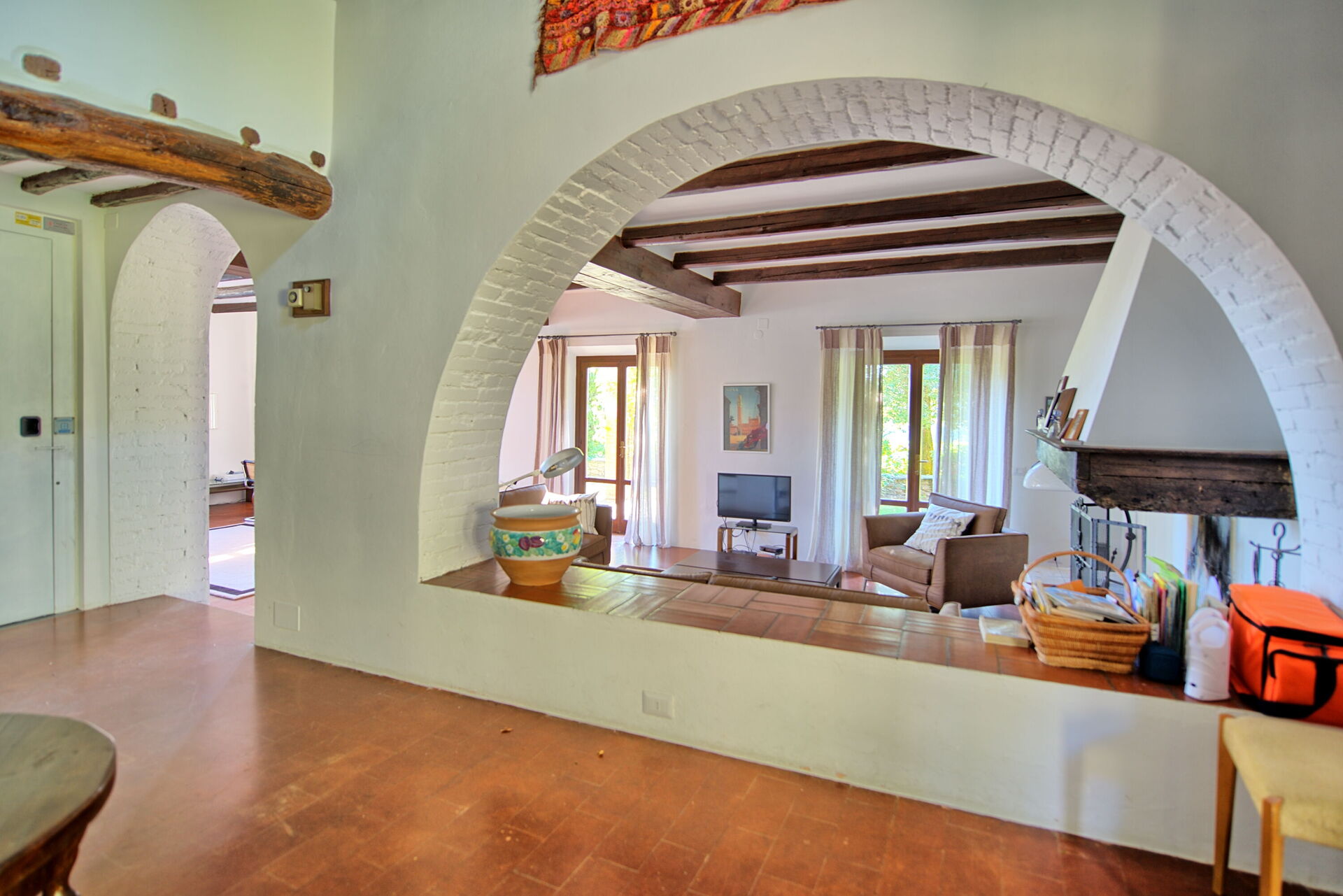 2 gradini giù: ampia zona soggiorno con camino funzionante, arredata con divano e poltrone, TV LCD satellitare, nel lato opposto si trova la scrivania con il computer e la stampante a disposizione degli ospiti. Il soggiorno ha grandi porte finestre che danno sulla veranda attrezzata con tavoli e sedie per cene all’aperto.
