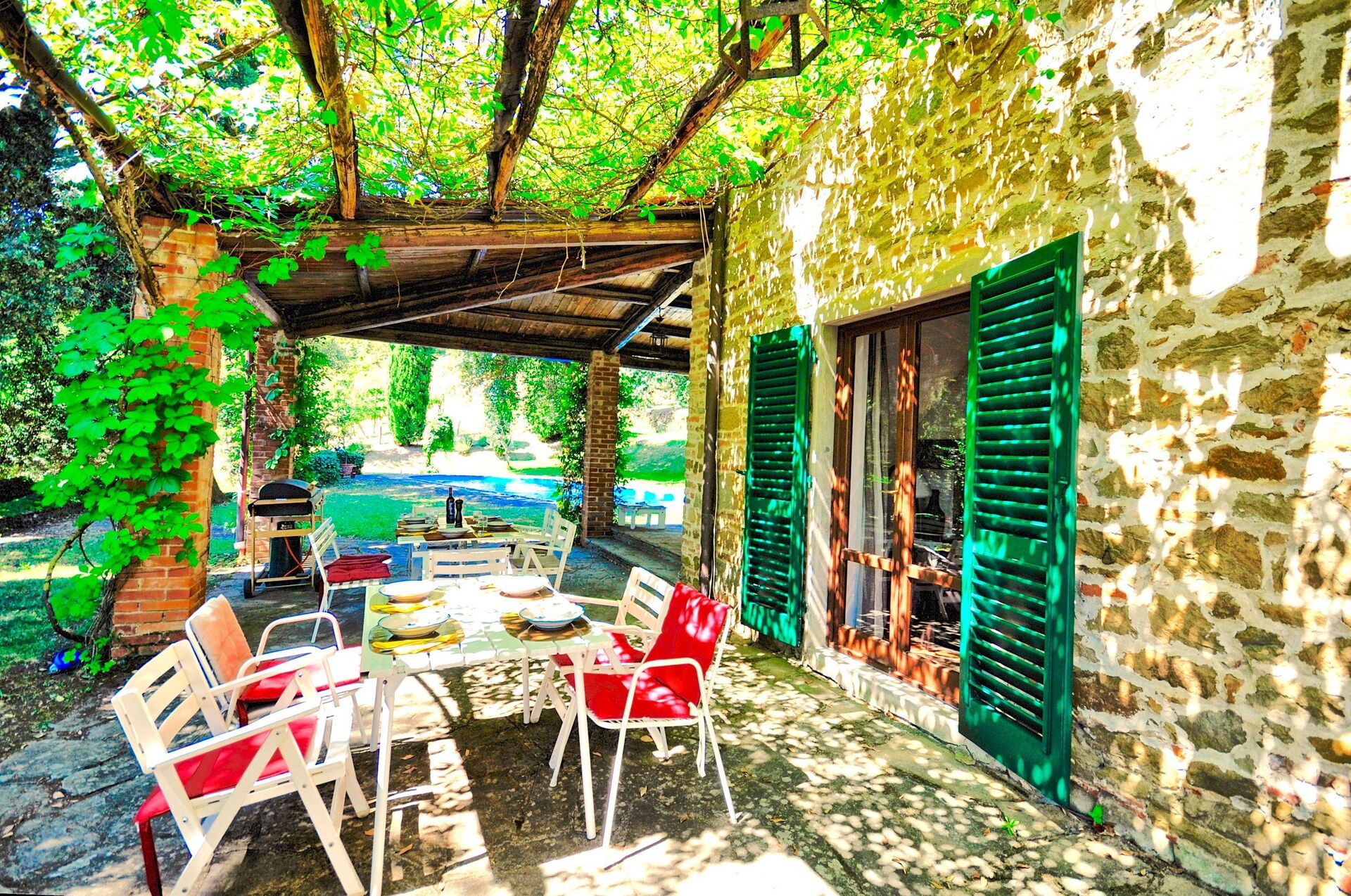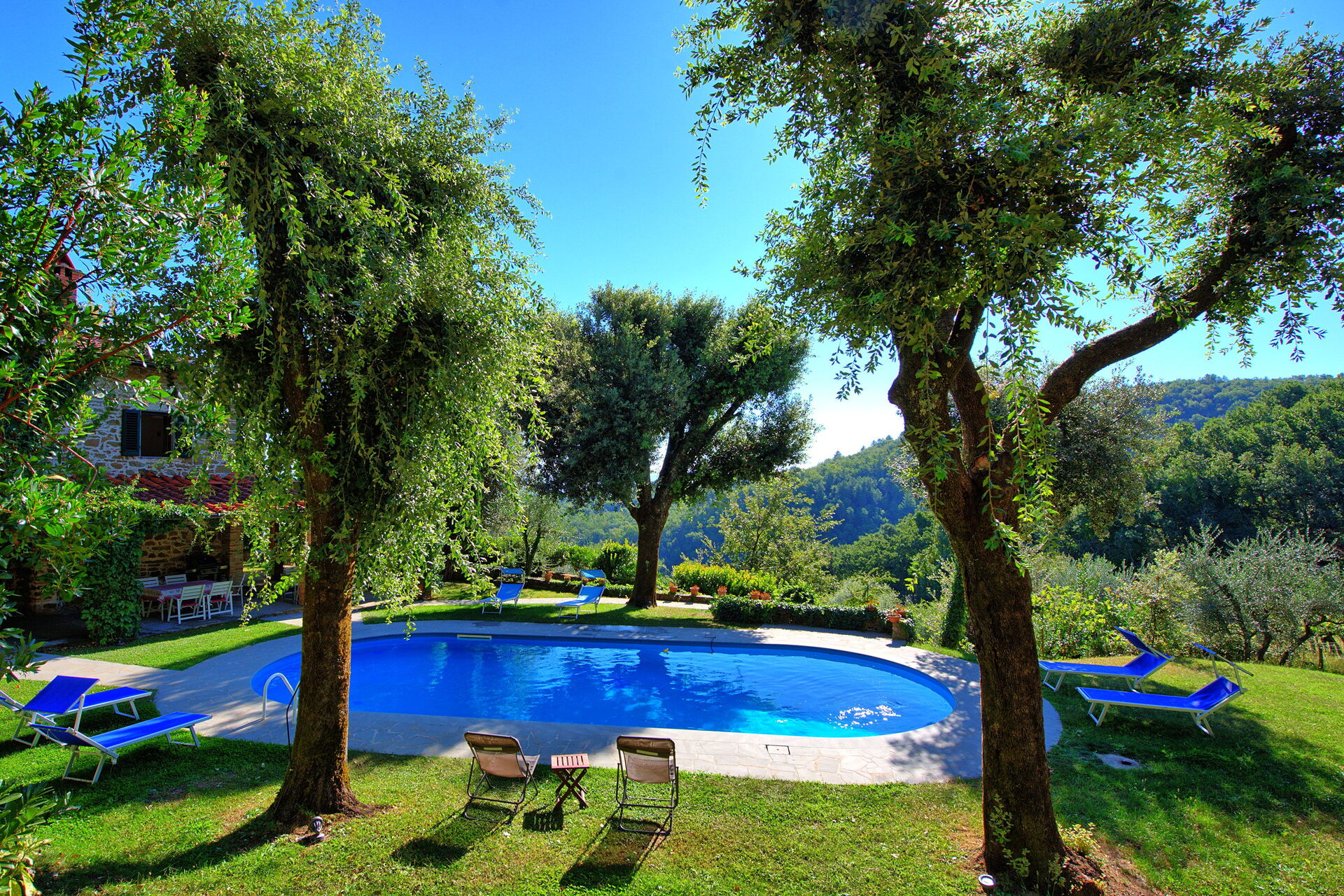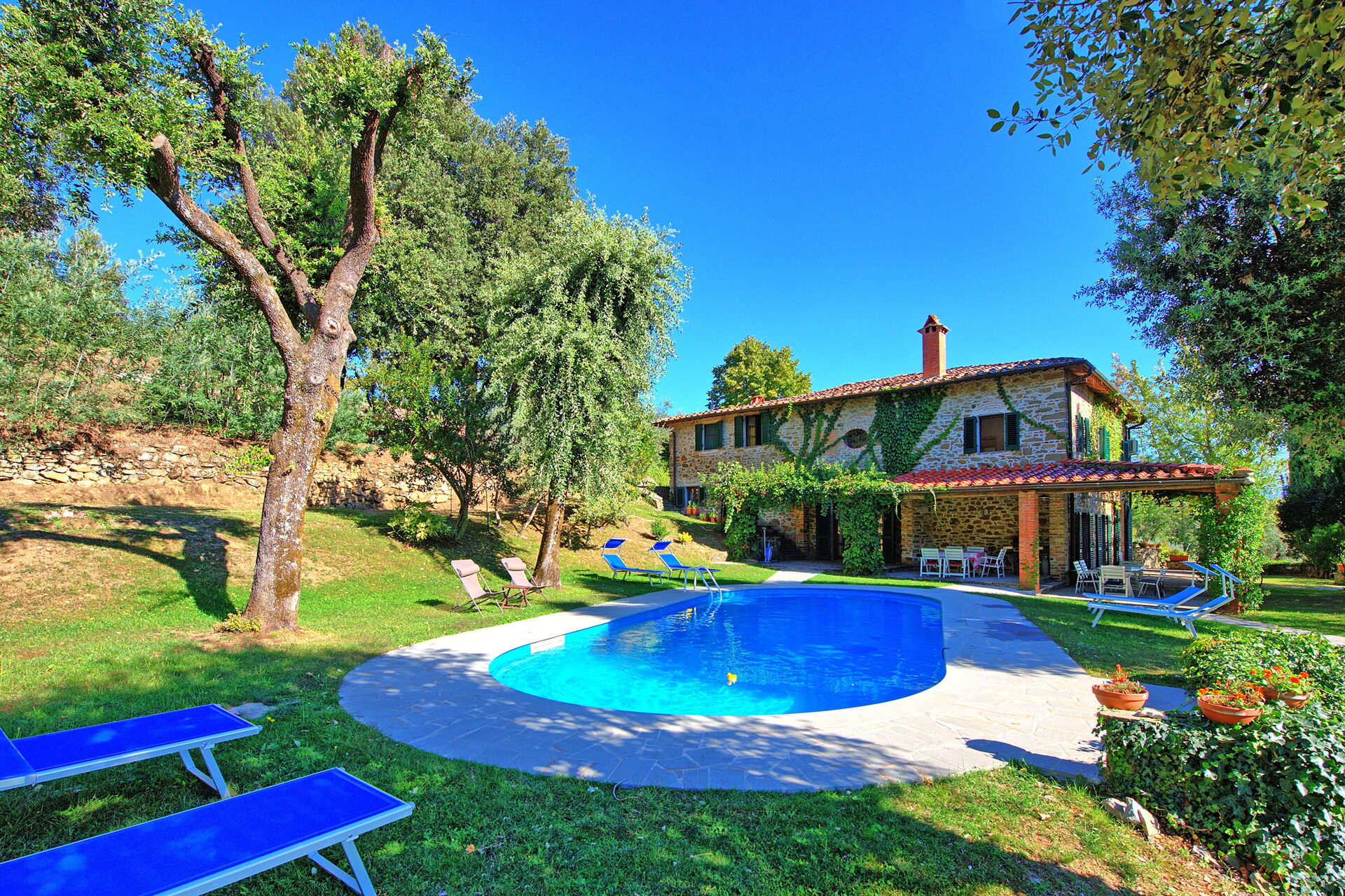 All'esterno, un grande giardino curato e abbellito da piante e fiori mette a disposizione degli ospiti una grande e bellissima piscina privata e un'area coperta e attrezzata con tavoli e sedie per poter comodamente mangiare all'aperto in compagnia di amici e familiari. La stupenda vista panoramica sul paesaggio circostante renderà gradevole una vacanza in tutte le stagioni dell'anno.