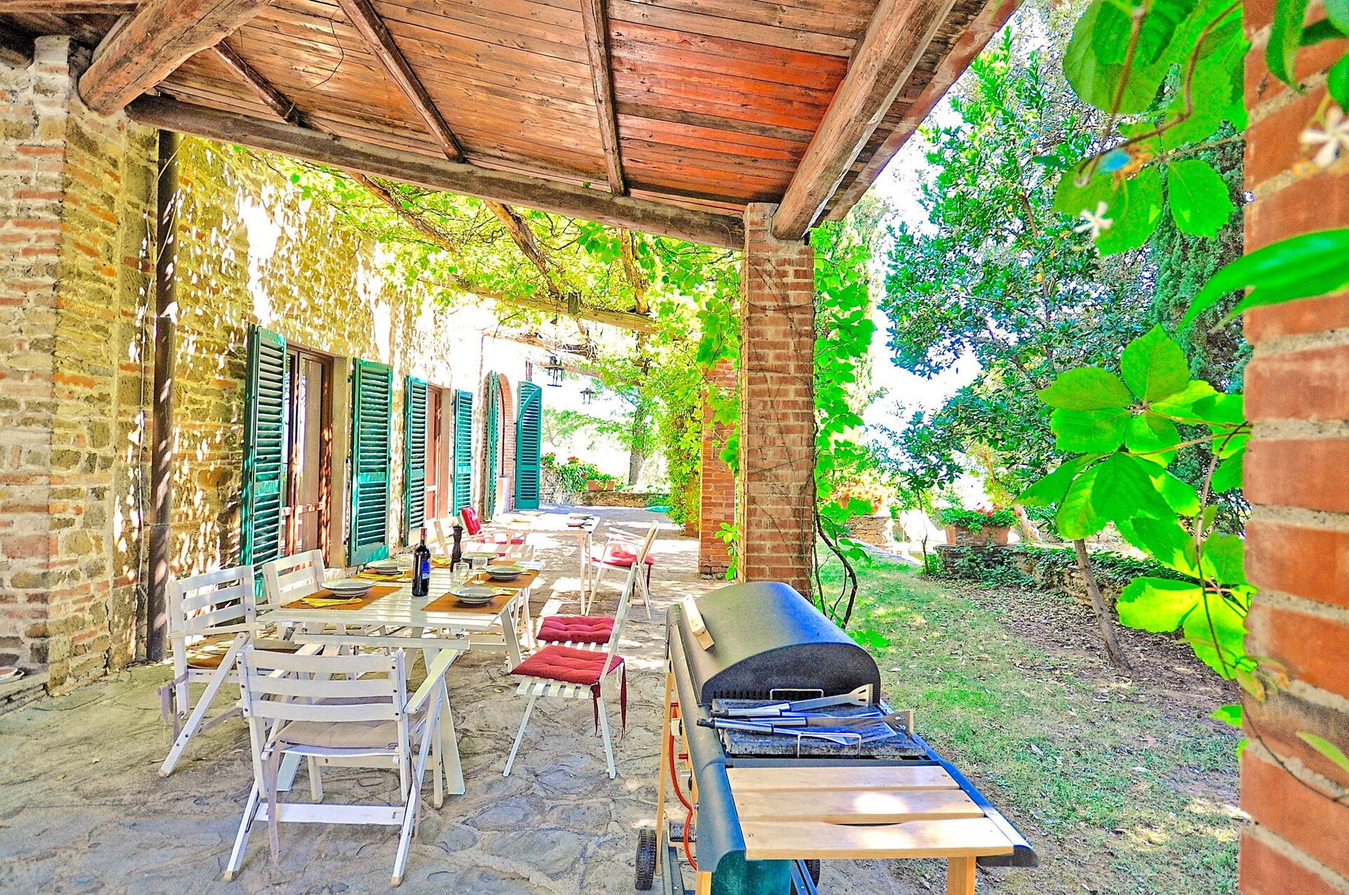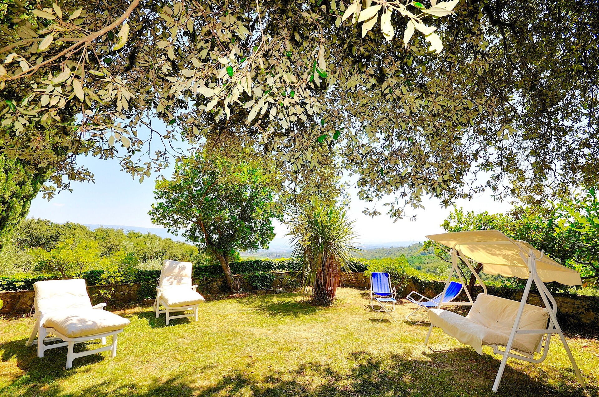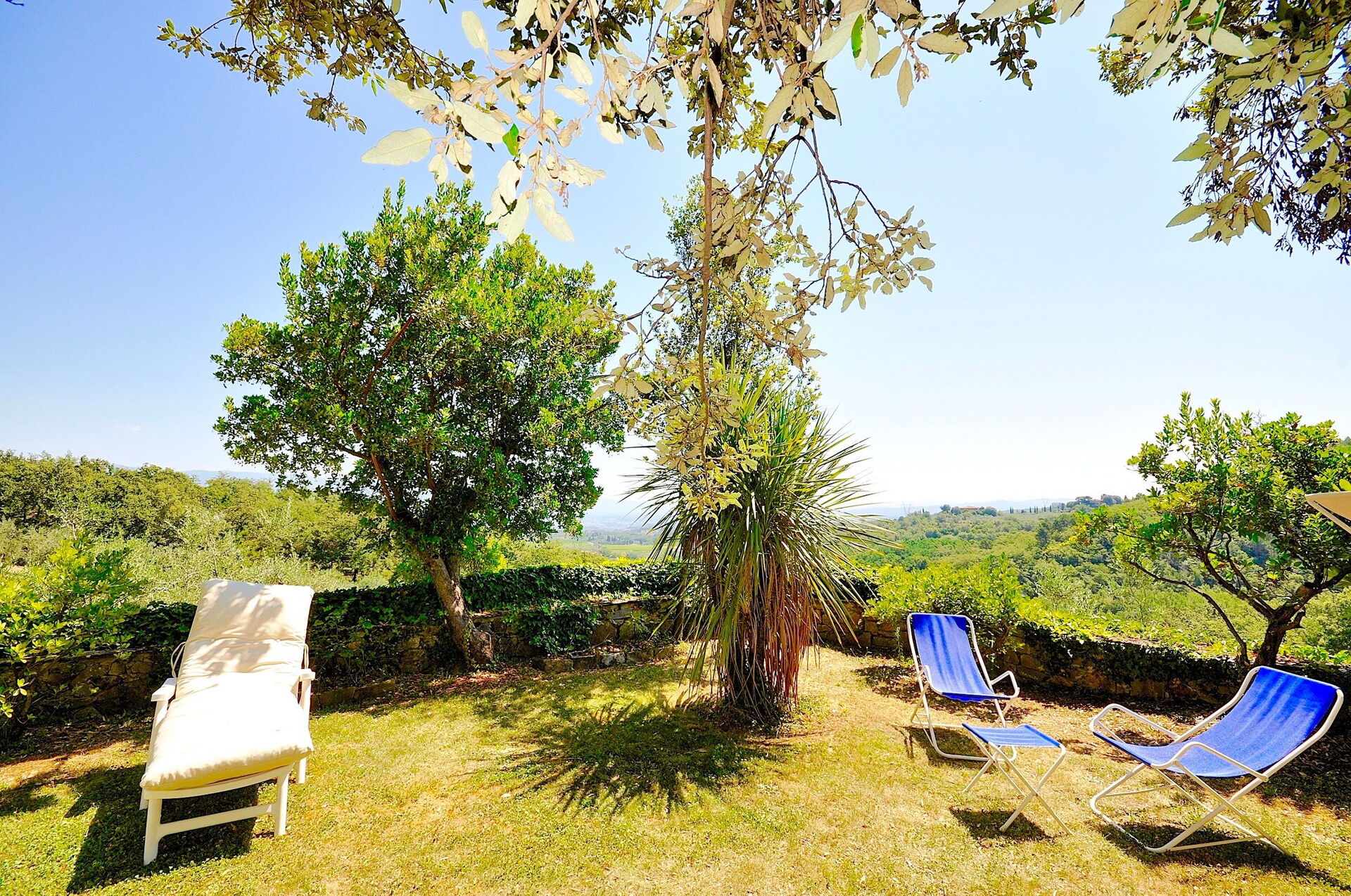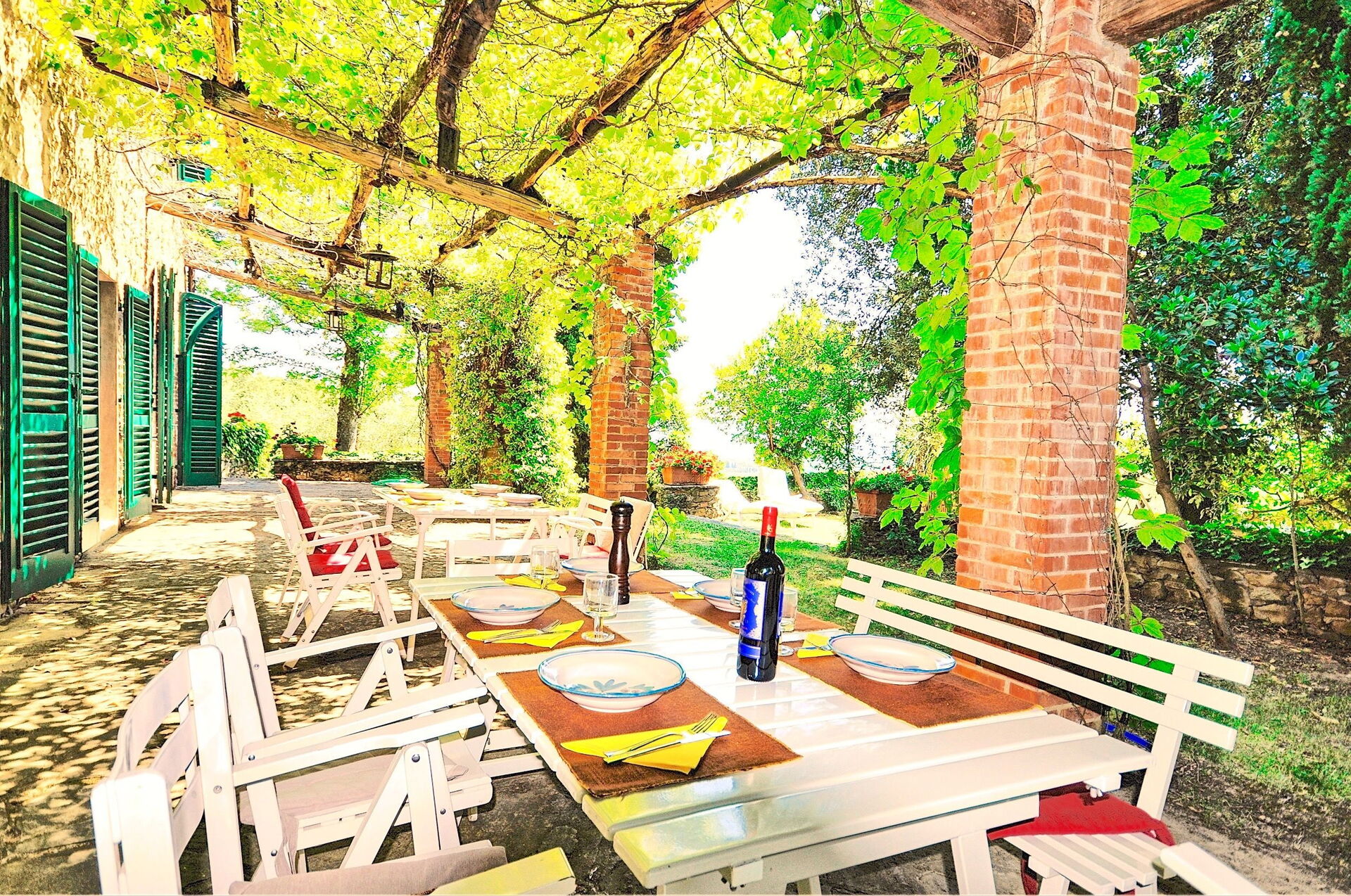 All'esterno, un grande giardino curato e abbellito da piante e fiori mette a disposizione degli ospiti una grande e bellissima piscina privata e un'area coperta e attrezzata con tavoli e sedie per poter comodamente mangiare all'aperto in compagnia di amici e familiari. La stupenda vista panoramica sul paesaggio circostante renderà gradevole una vacanza in tutte le stagioni dell'anno.