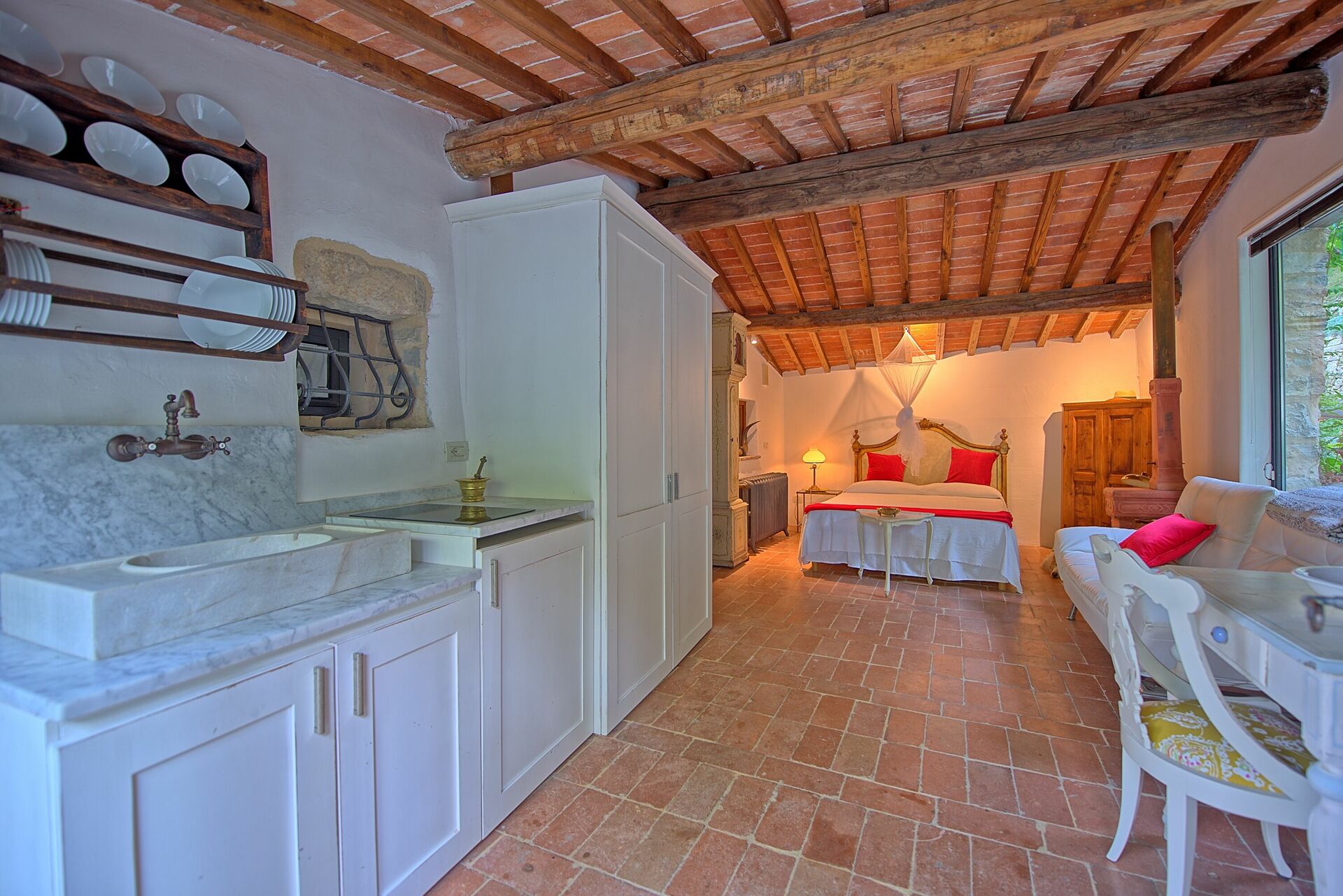 Primo piano: dal soggiorno si accede attraverso una scala a chiocciola ad una camera matrimoniale con aria condizionata (aperta sul soggiorno sottostante) con bagno privato con vasca. Da questa camera si accede ad una seconda camera matrimoniale che è accessibile anche direttamente dall'esterno: chiudendo la doppia porta tra le due camere si ottengono due camere completamente indipendenti; nella seconda camera è presente (oltre al letto matrimoniale) un divano letto matrimoniale, un piccolo angolo cottura con tavolino e un piccolissimo bagno di servizio (wc e lavandino).