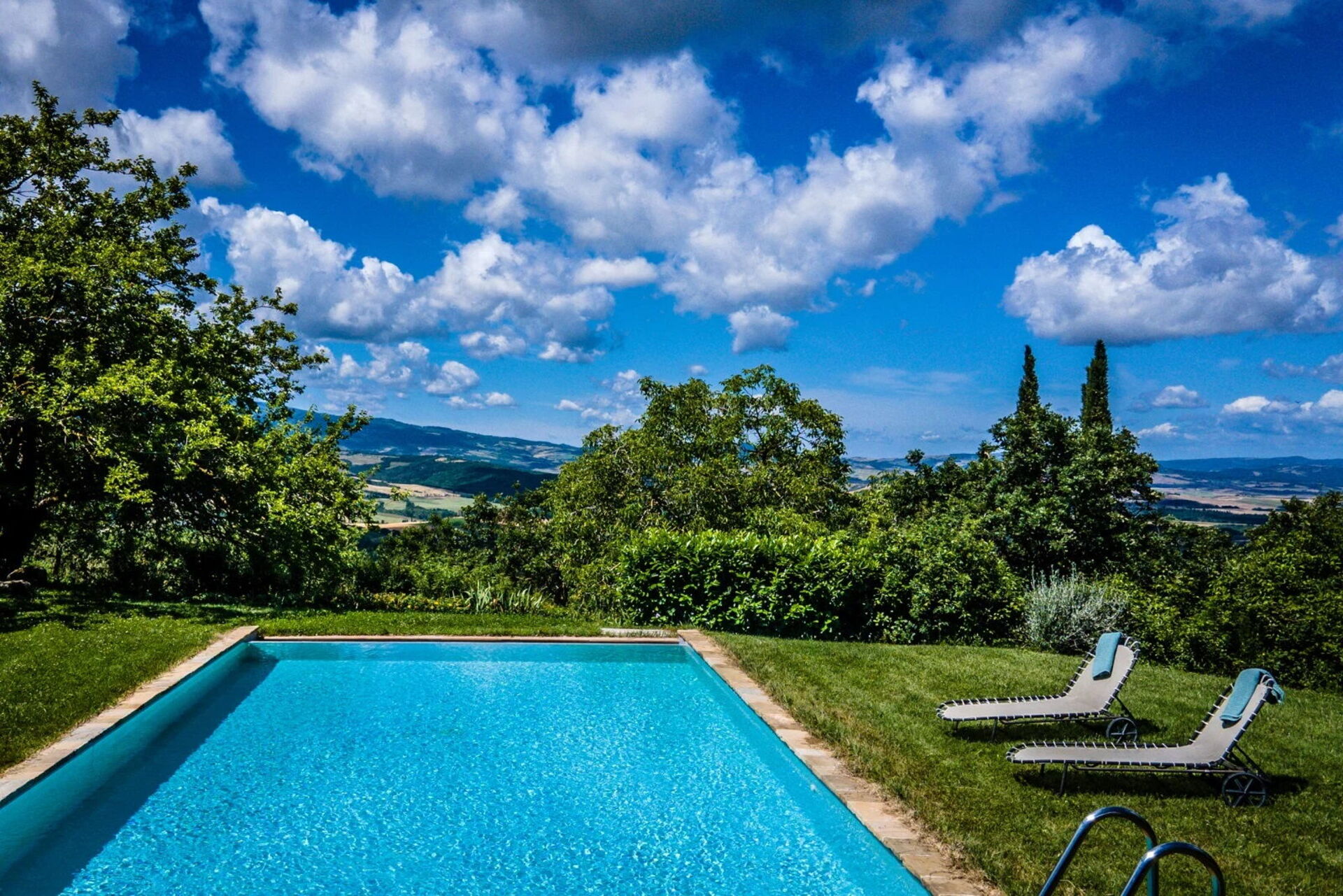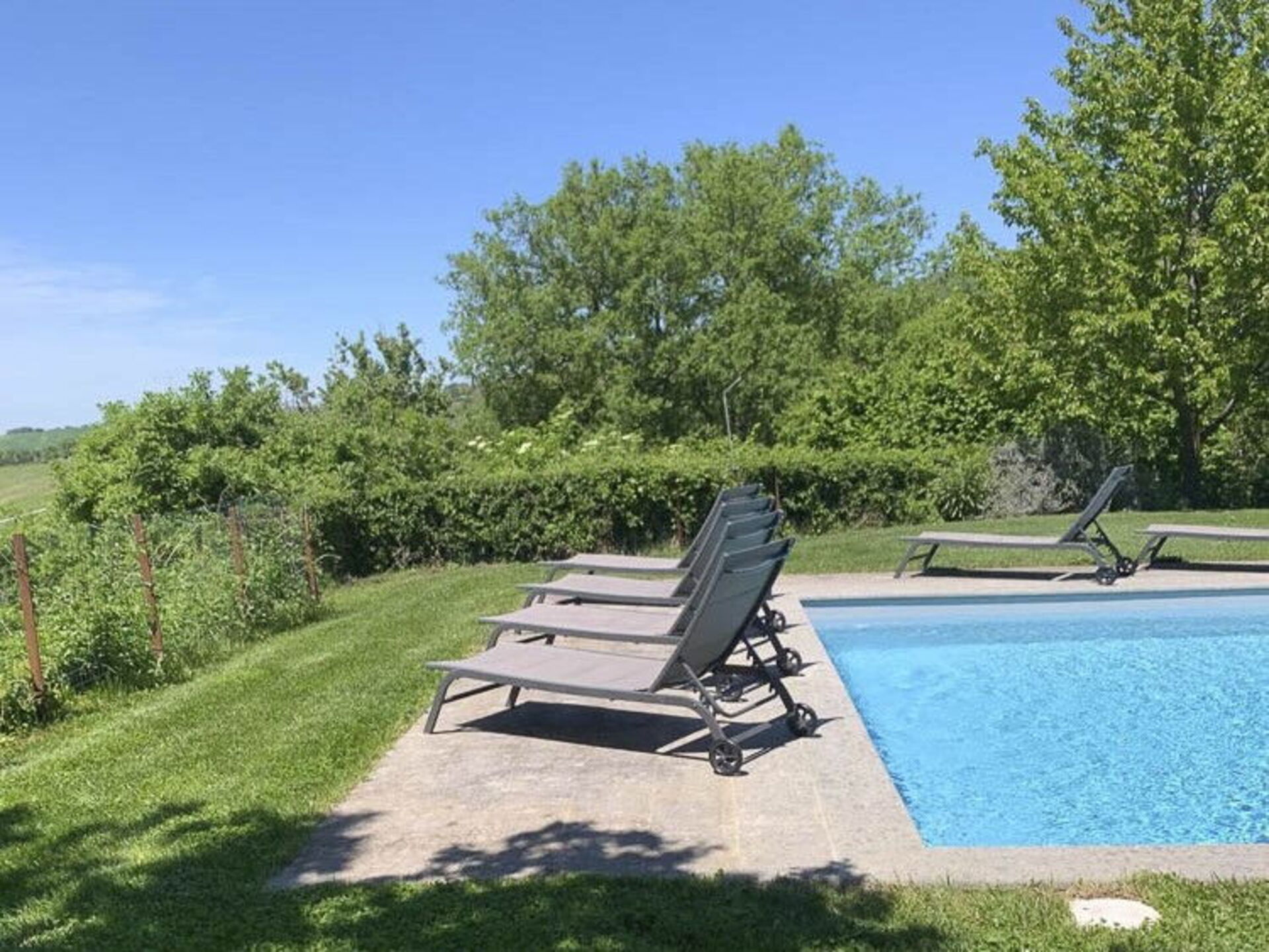 All'esterno un ben curato giardino ospita la piscina privata (recintata) che si trova in posizione panoramica: è dotata di lettini e ombrelloni per trascorrere lunghe ore rilassandosi e rinfrescandosi in compagnia di amici e familiari.
