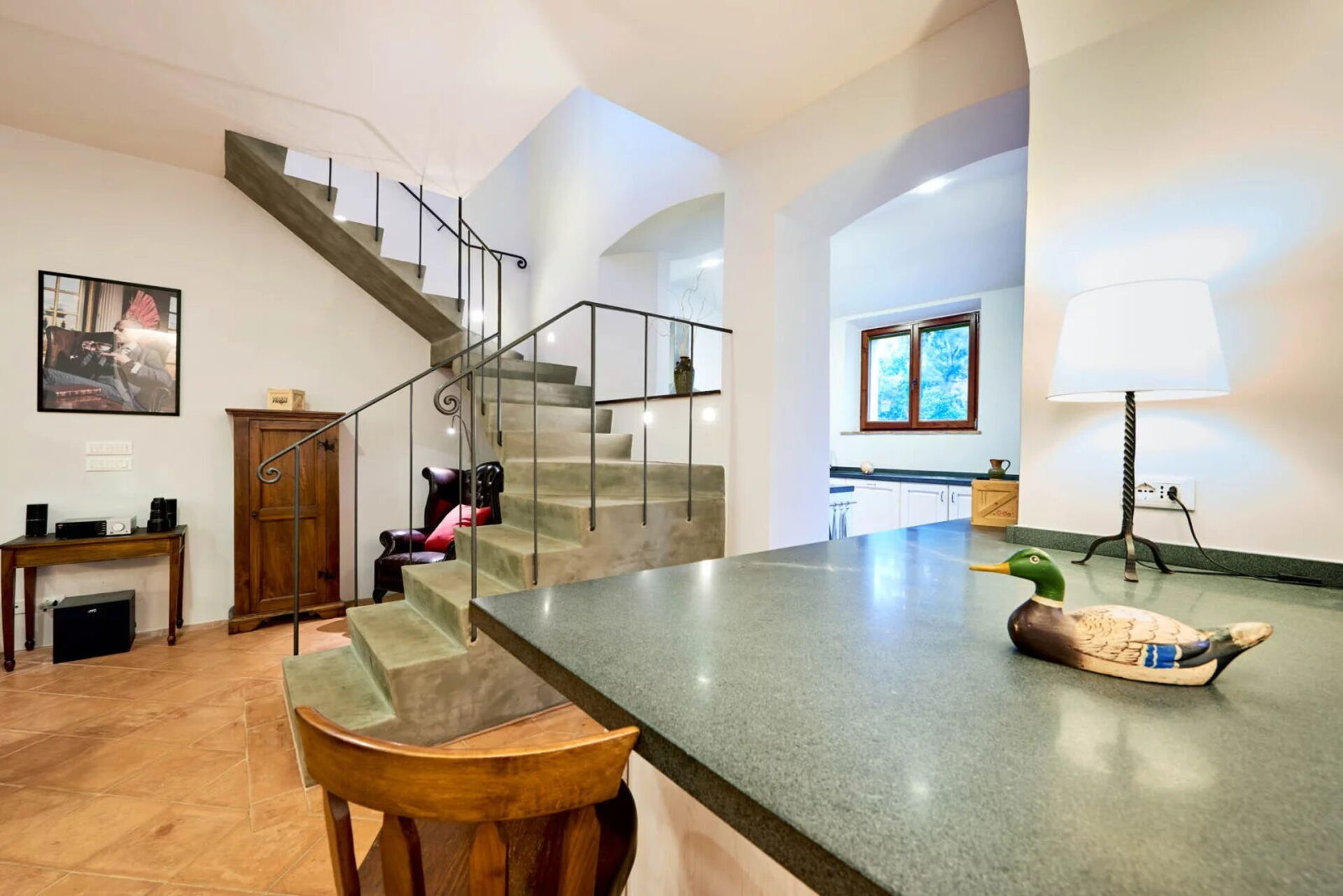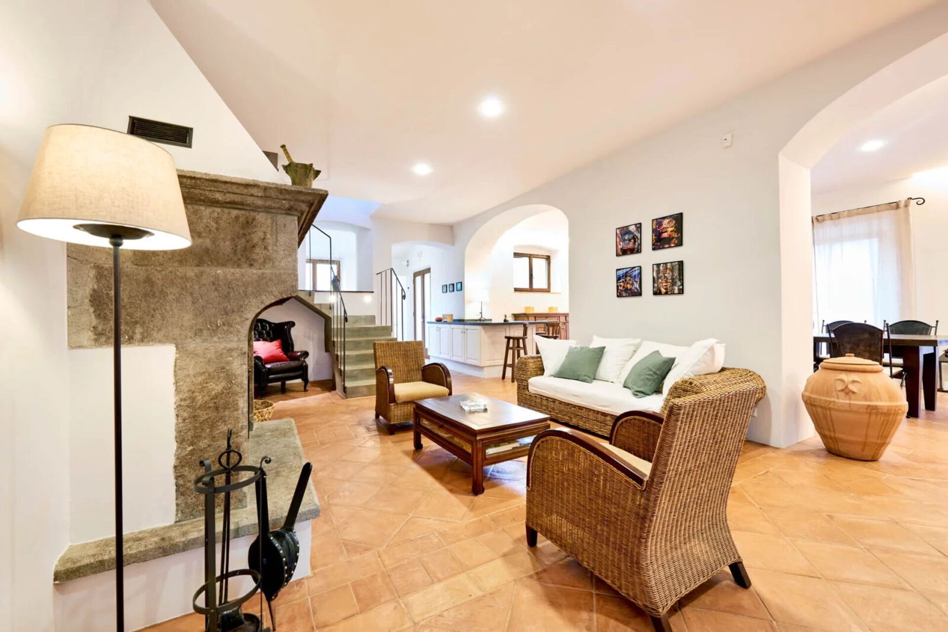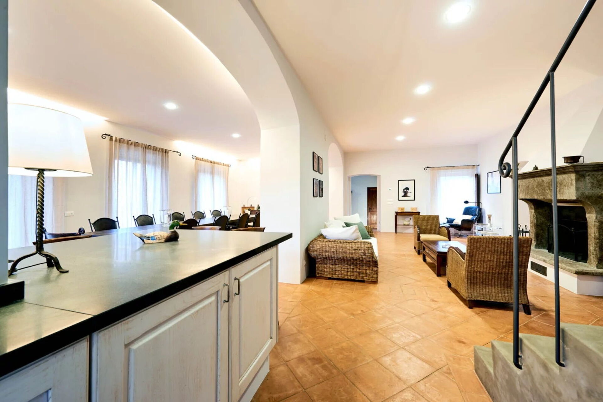 Piano terreno: ampio soggiorno con zona pranzo e uscita sulla panoramica terrazza attrezzata per mangiare all’aria aperta, cucina (piano cottura, forno, frigorifero, freezer, lavastoviglie, tostapane, macchina da caffè espresso), wc, lavanderia con lavatrice e asciugatrice.