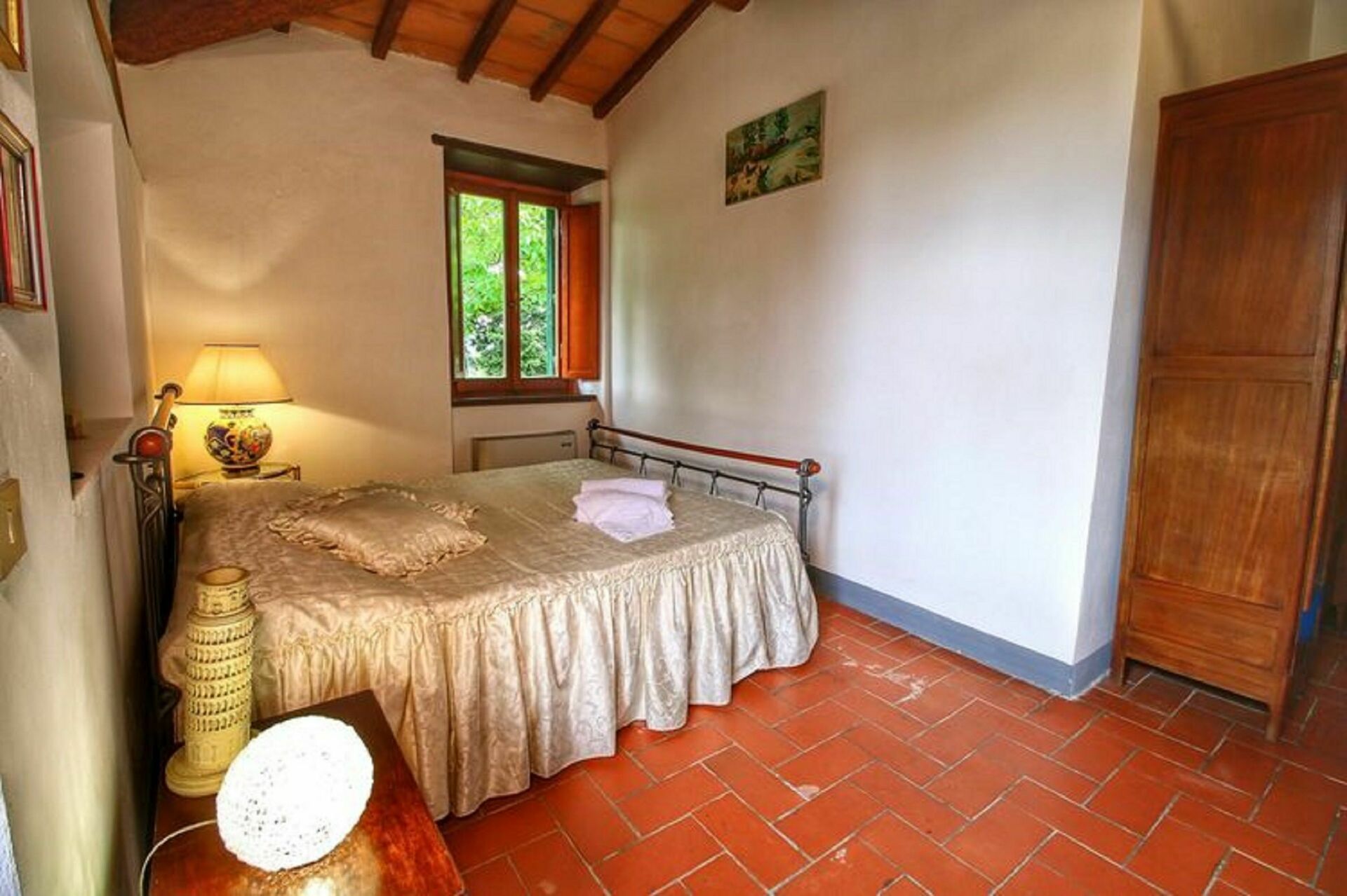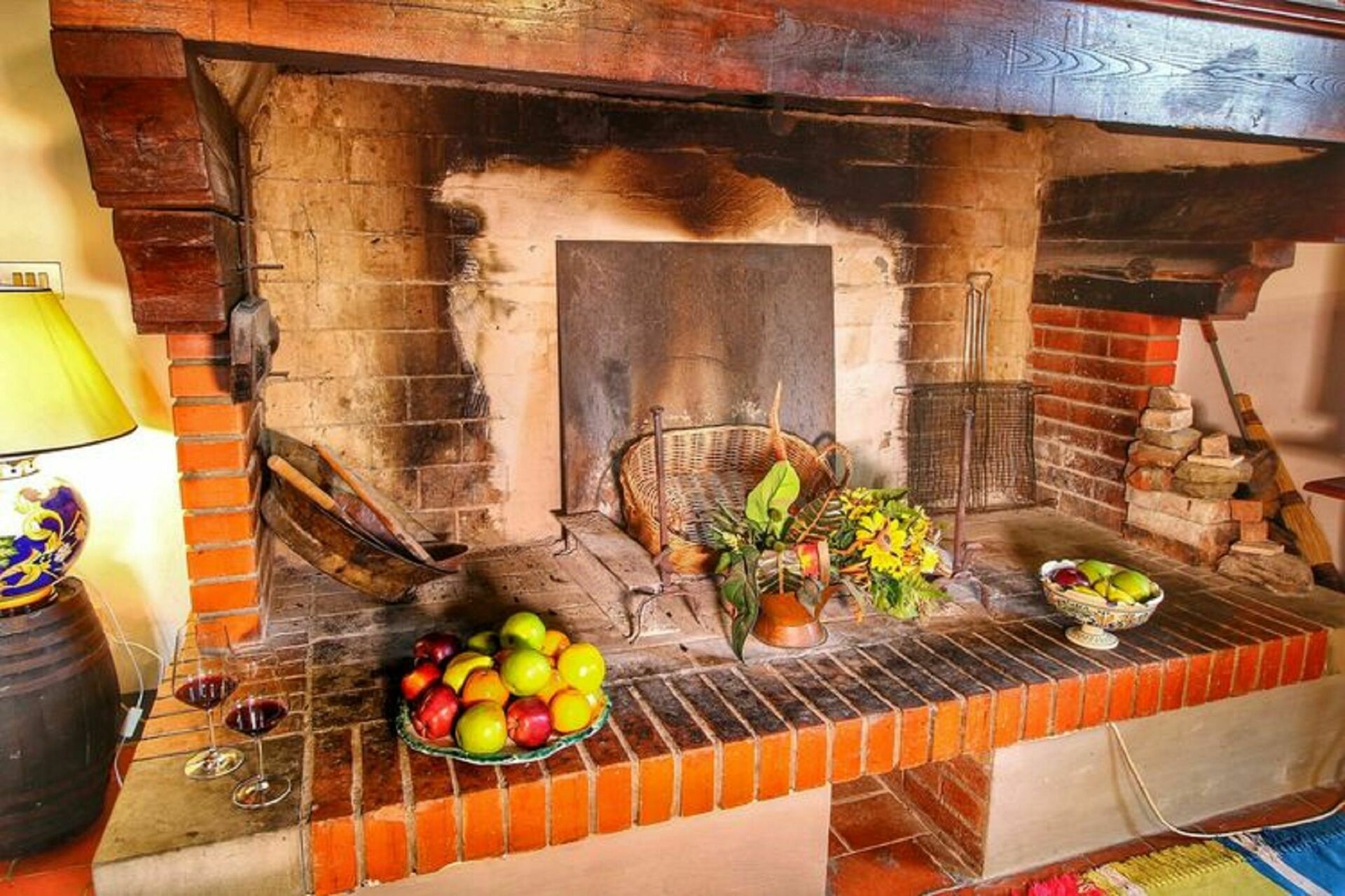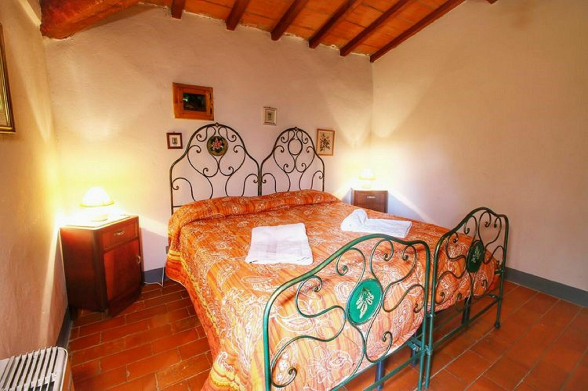 Piano terreno: ampio soggiorno (TV) con camino, zona pranzo e angolo cottura (forno, freezer, lavastoviglie), camera matrimoniale, camera con 2 letti singoli e camino (non funzionante).