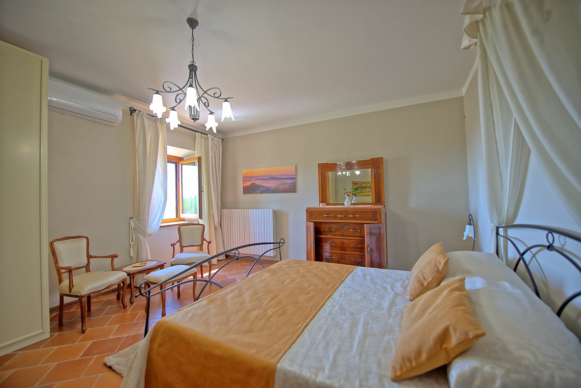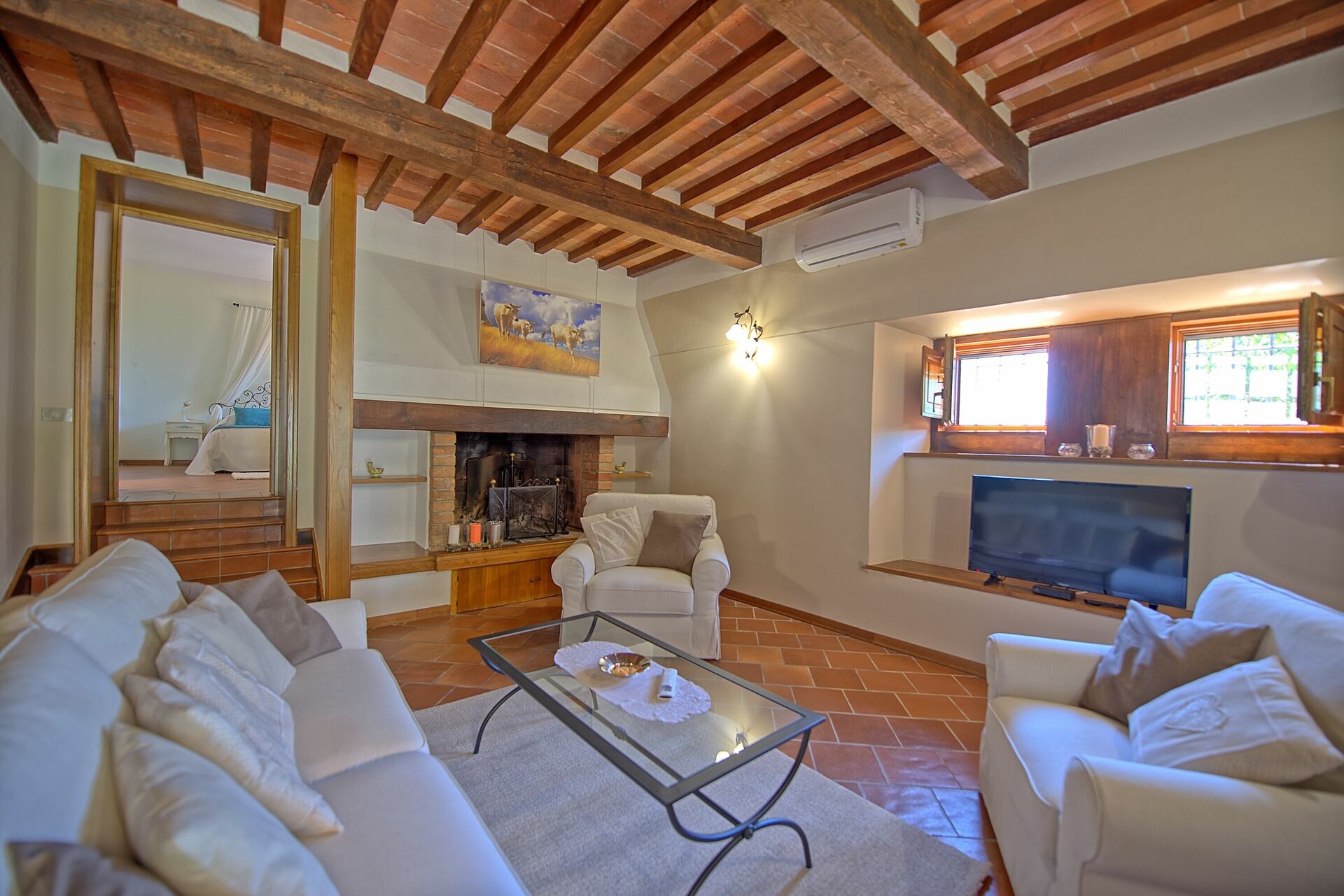 Primo piano: sala con camino (non utilizzabile) e accesso sull'esterno, camera matrimoniale (aria condizionata) con bagno privato con doccia).