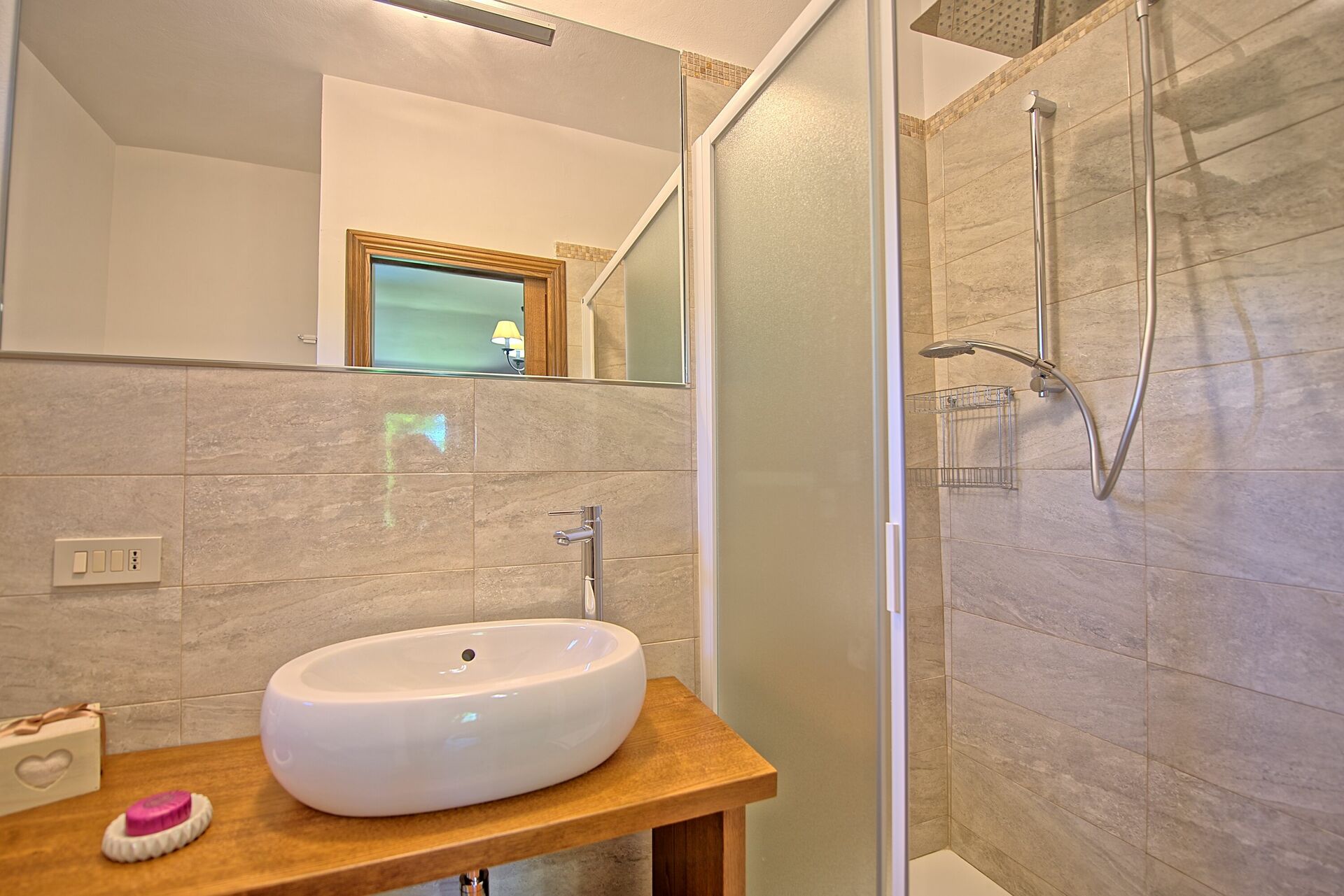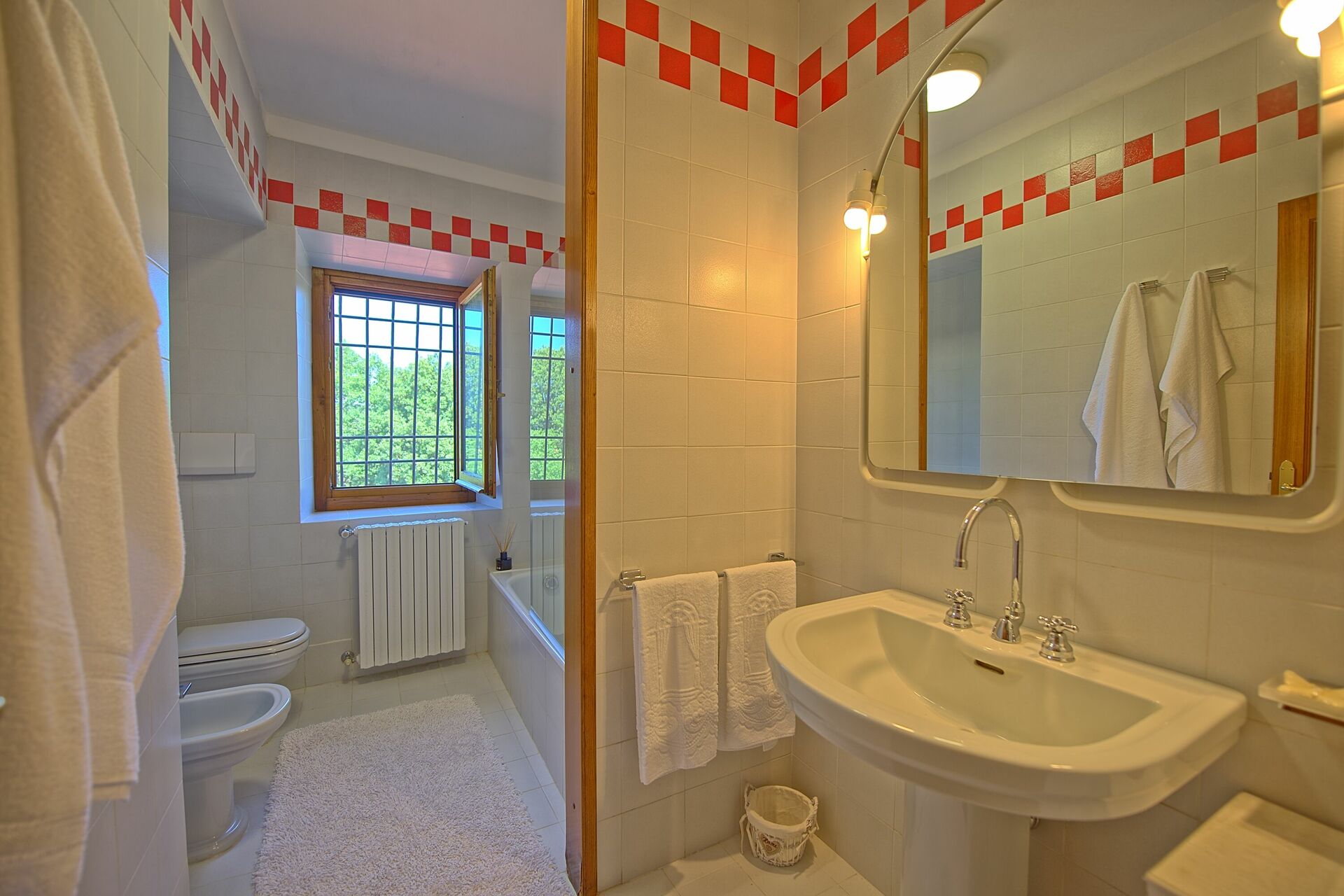 4 gradini più in alto (dalla sala): camera di passaggio con un letto singolo, bagno con vasca e doccia, camera matrimoniale (aria condizionata).
