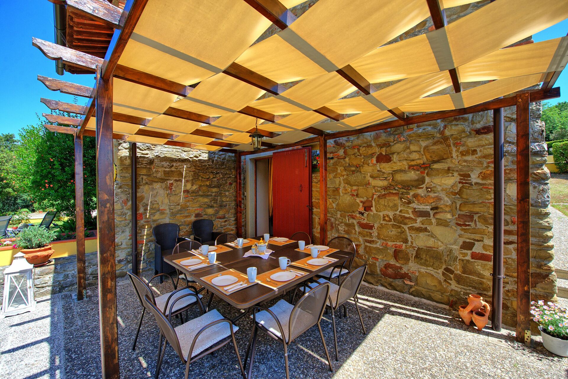 All'esterno un'ampia terrazza davanti alla villa e un grande giardino offrono privacy e relax a contatto con la natura.