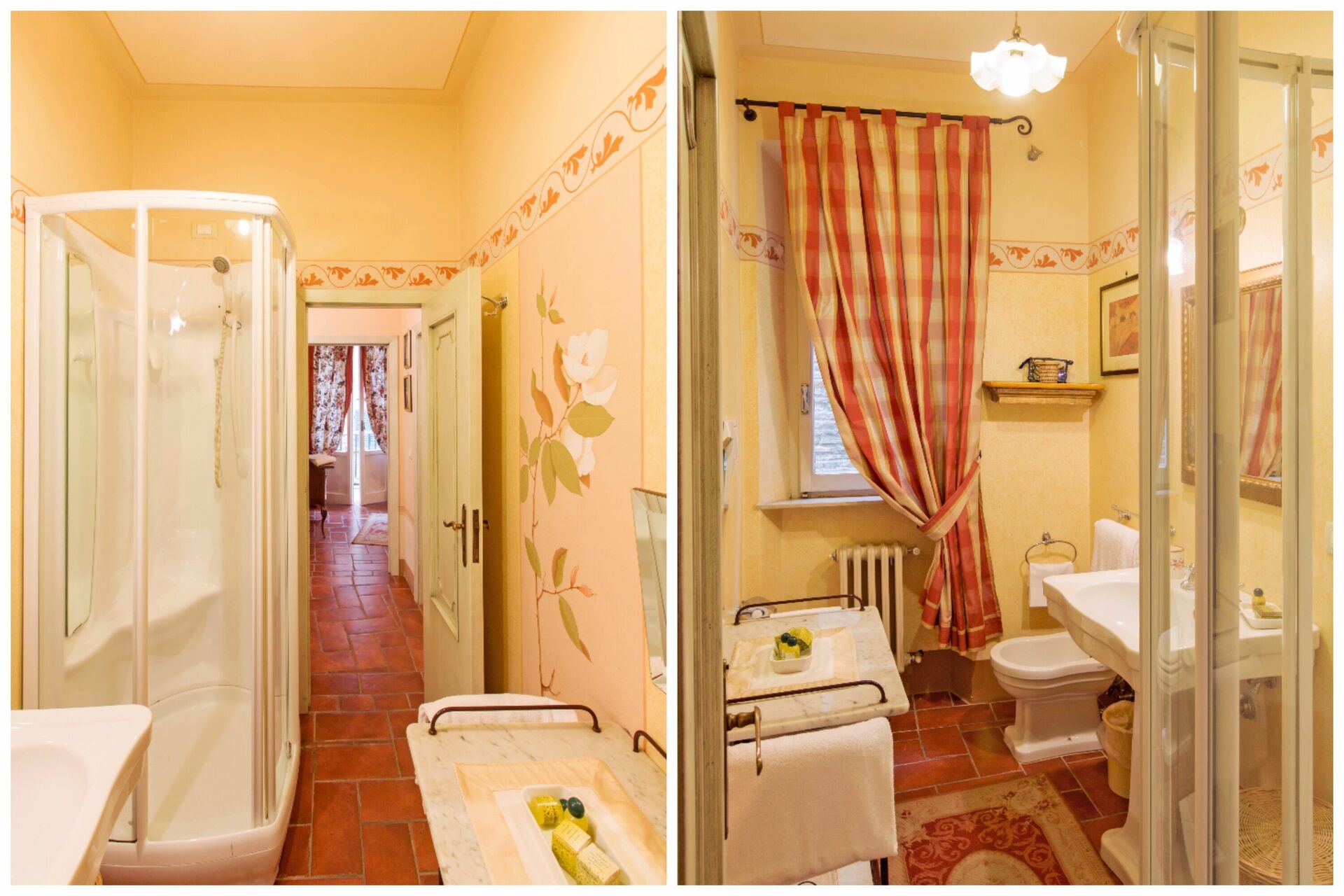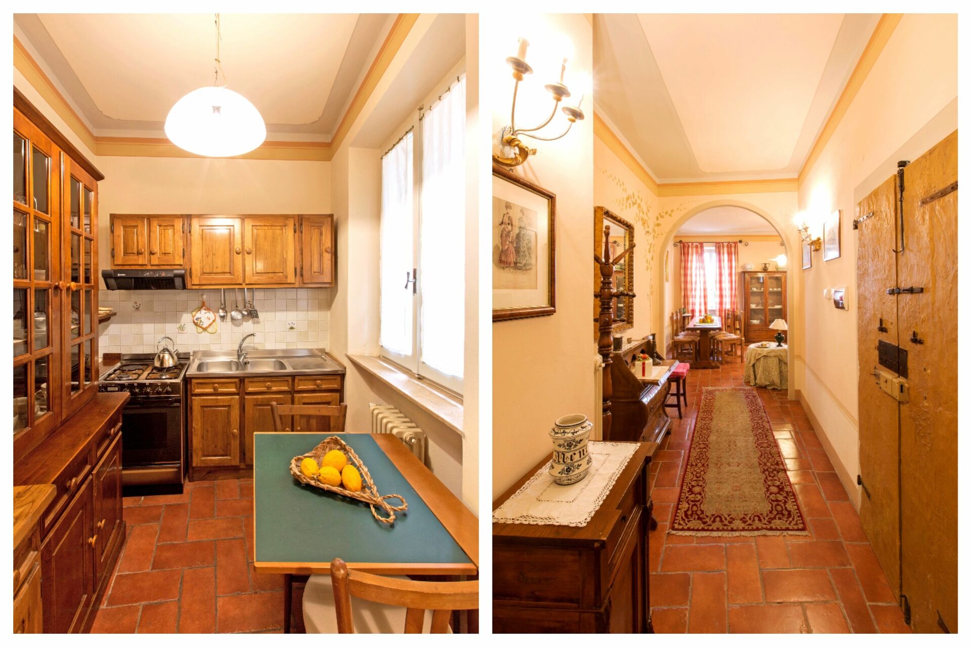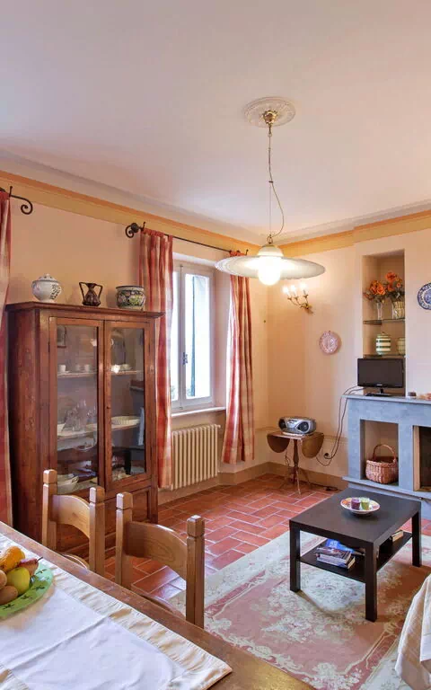 1° Piano: ingresso su soggiorno con zona pranzo e angolo cottura (forno, freezer, tostapane, spremiagrumi, macchina da caffè americano), camera matrimoniale, camera con 2 letti singoli e accesso ad una piccola terrazza con vista sulla corte interna del palazzo, bagno con doccia idromassaggio. Santo Agostino 1 gode di una bellissima vista sulla vallata sottostante e dalle sue finestre è possibile vedere fino al Lago Trasimeno. L’appartamento è dotato di aria condizionata, lavatrice, asse e ferro da stiro.