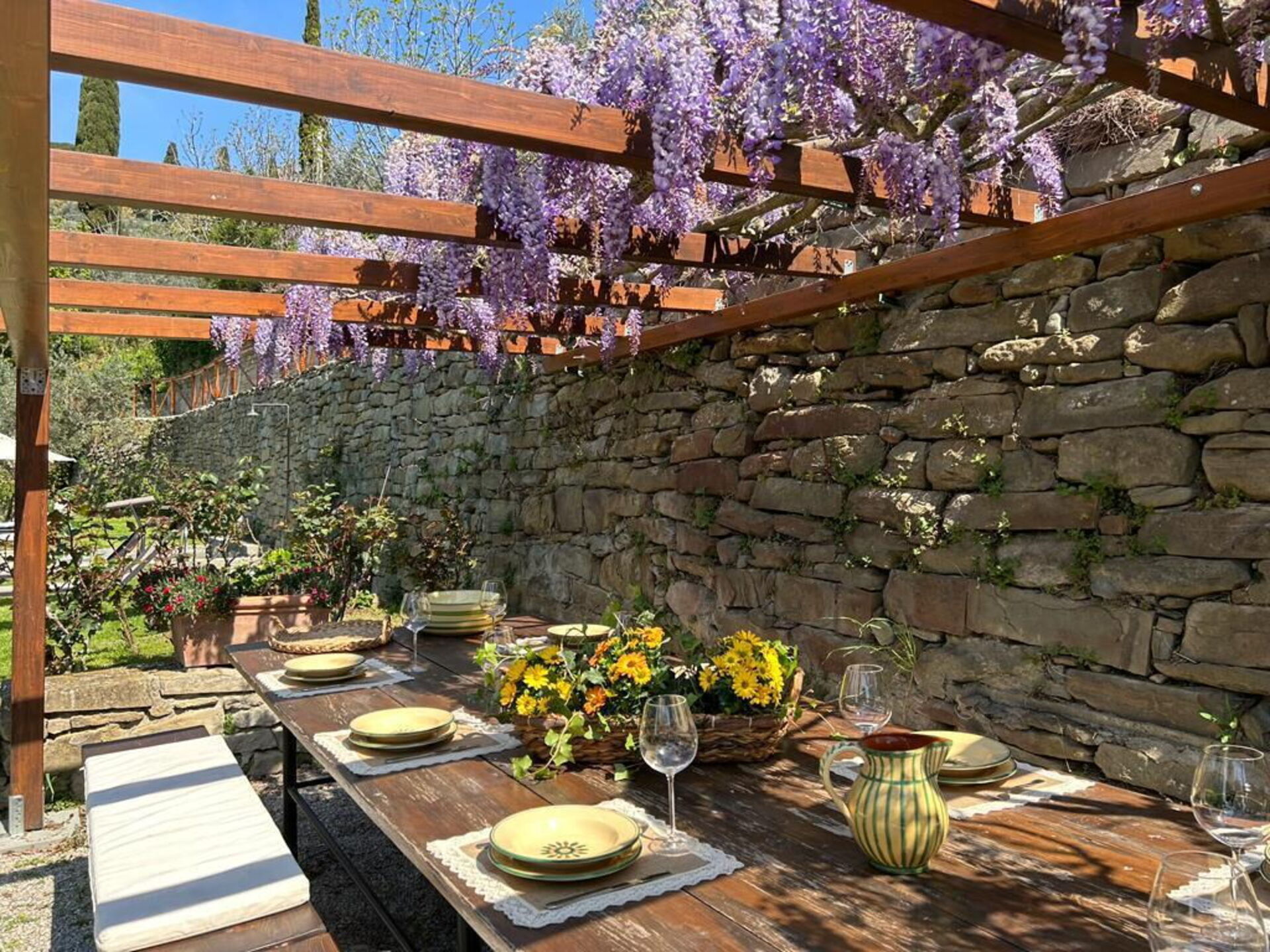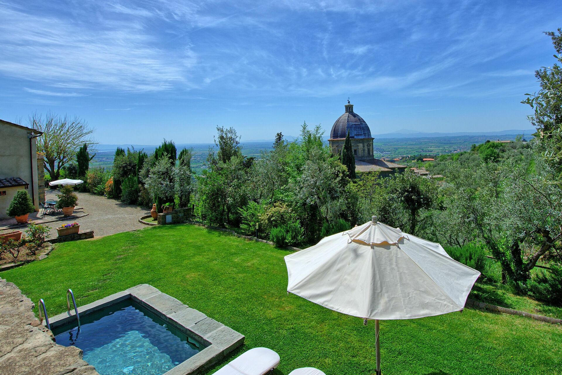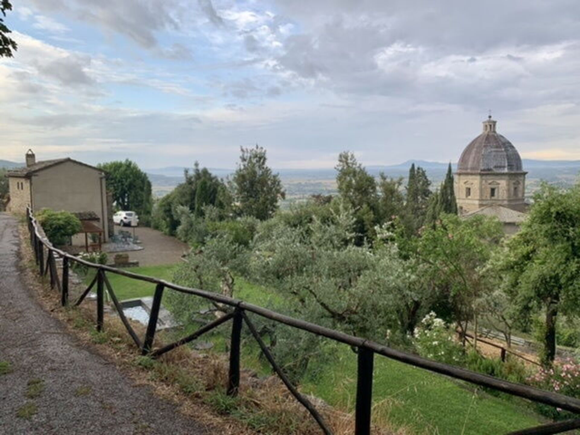 This villetta is perfect if you are looking to stay near a village with views of the countryside. There are olive groves that surround the property making it easy to go for a small walk nearby. The accommodations are typical and comfortable. The owner was very accommodating providing help when we needed it. The gardens are beautiful and the view from the property of the iconic church is unmatched. The sunrise and sunset from the villa are fabulous. The property is so close to Cortona that you can really feel a part of the community staying here with easy access to the village. Grocery stores are easily accessible as well down below the property in nearby Camucia. The villa was perfect for 4 people but could easily handle another 2 with one person sleeping on the couch. The single bedroom is much smaller than anticipated, but has a small sitting room near it that helps with space. The road in and out of the property is quite narrow and oncoming traffic can be hard to see. There are mirrors for exit, but you need to listen for traffic and it helps to have another person for another set of eyes. The stone walls on the side of the road to access the property are narrow and close as mentioned. Anything larger than a mid-size car would be too big. Overall, we had a fabulous stay here at Villa Calinaio. The views, classic old world rustic charm, and the gardens with pool make this a fantastic choice for a small group staying near Cortona.