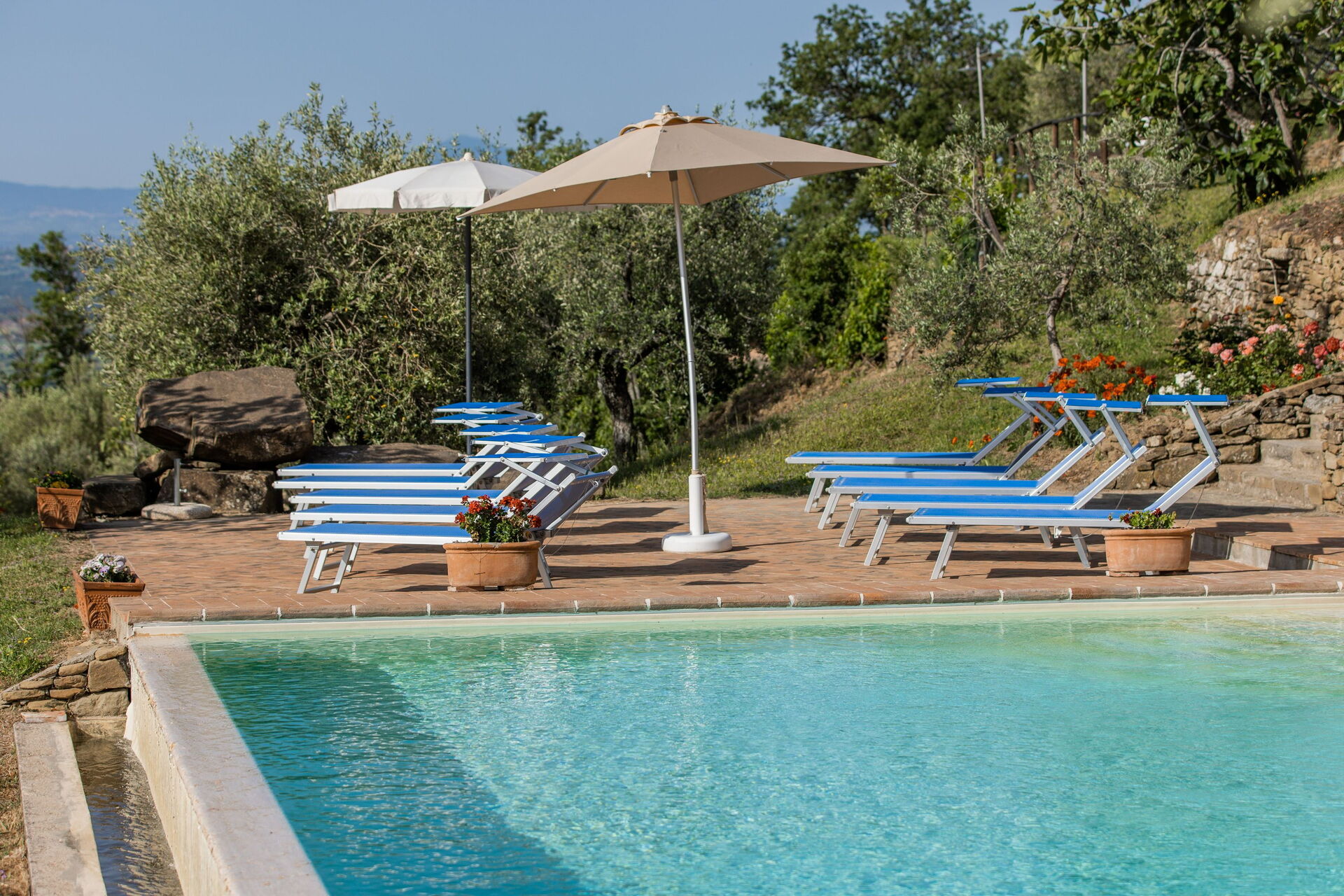 Questo bellissimo casale in affitto per vacanze è immerso in un paesaggio collinare caratterizzato da campi coltivati, boschi e olivete; ha un bellissimo giardino curato personalmente dai proprietari ricco di piante, fiori e che ospita una bella piscina riservata all'uso esclusivo degli ospiti. Un panoramico solarium dotato di lettini prendisole sarà un luogo perfetto in cui trascorrere lunghe ore sotto il sole della Toscana e per rilassarsi. Una grande area attrezzata con barbecue, forno a legno, tavolo e sedie è a disposizione degli ospiti che potranno organizzare deliziosi pranzi e cene da mangiare all'aria aperta godendosi la pace della campagna toscana e ammirando le sue bellissime colline famose in tutto il mondo.