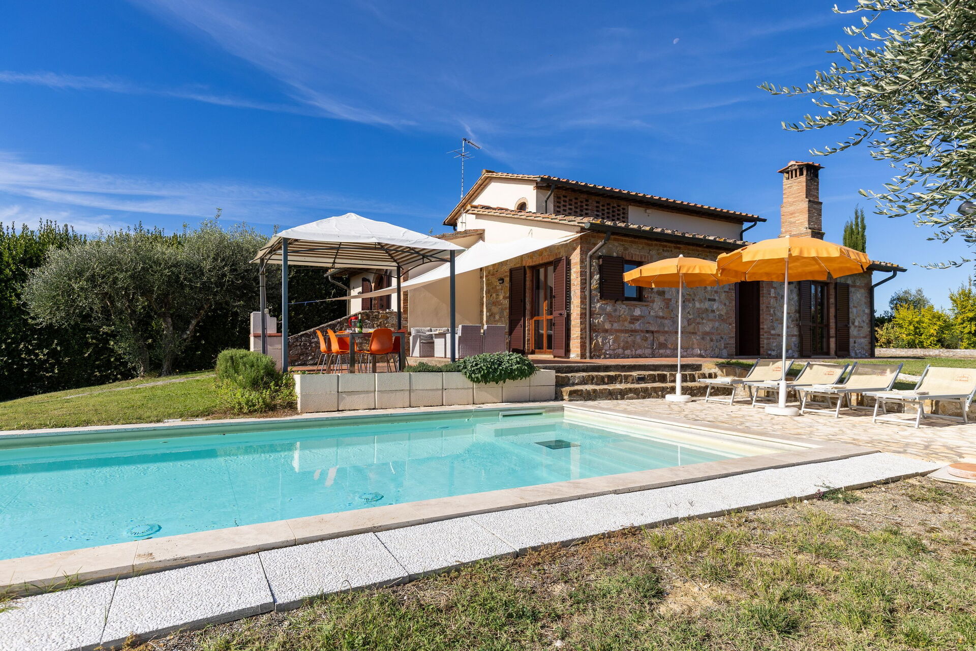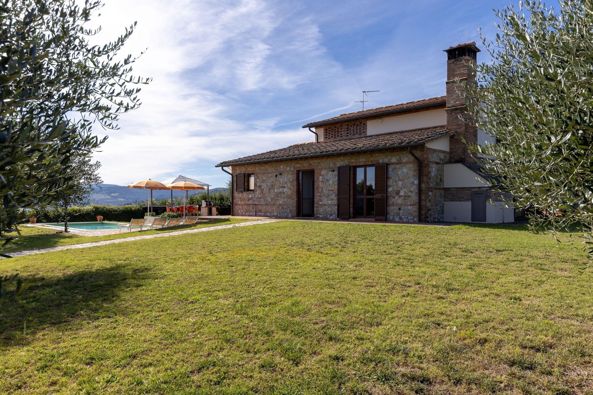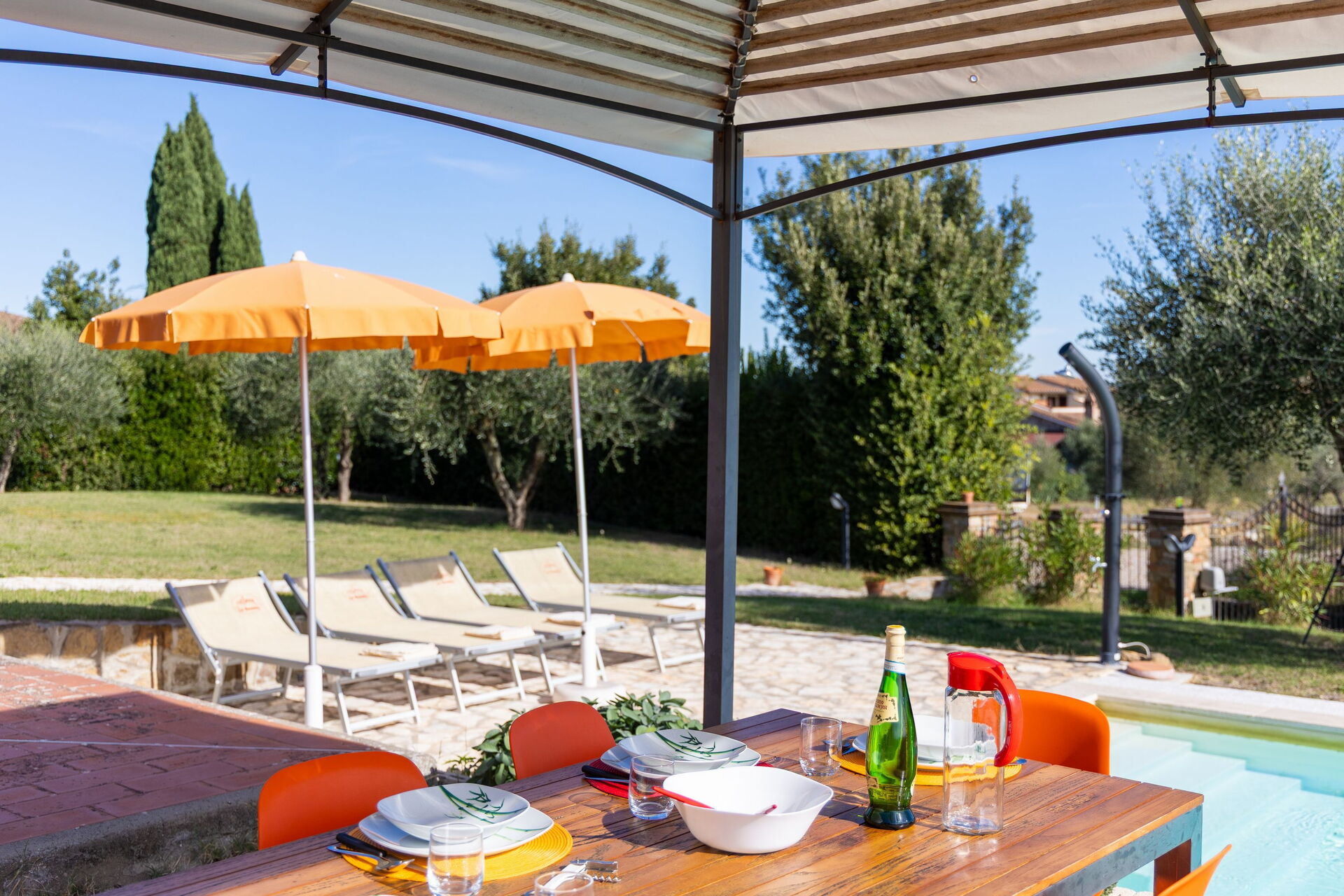 Esternamente gli ospiti possono usufruire di un giardino e di una nuovissima piscina (con scala romana e zona relax con geyser) che si affaccia sulla campagna e sulle famosissime torri di San Gimignano. Una zona attrezzata con gazebo, tavolo, sedie e barbecue si trova tra la piscina e la casa, esattamente in prossimità della cucina della villa.