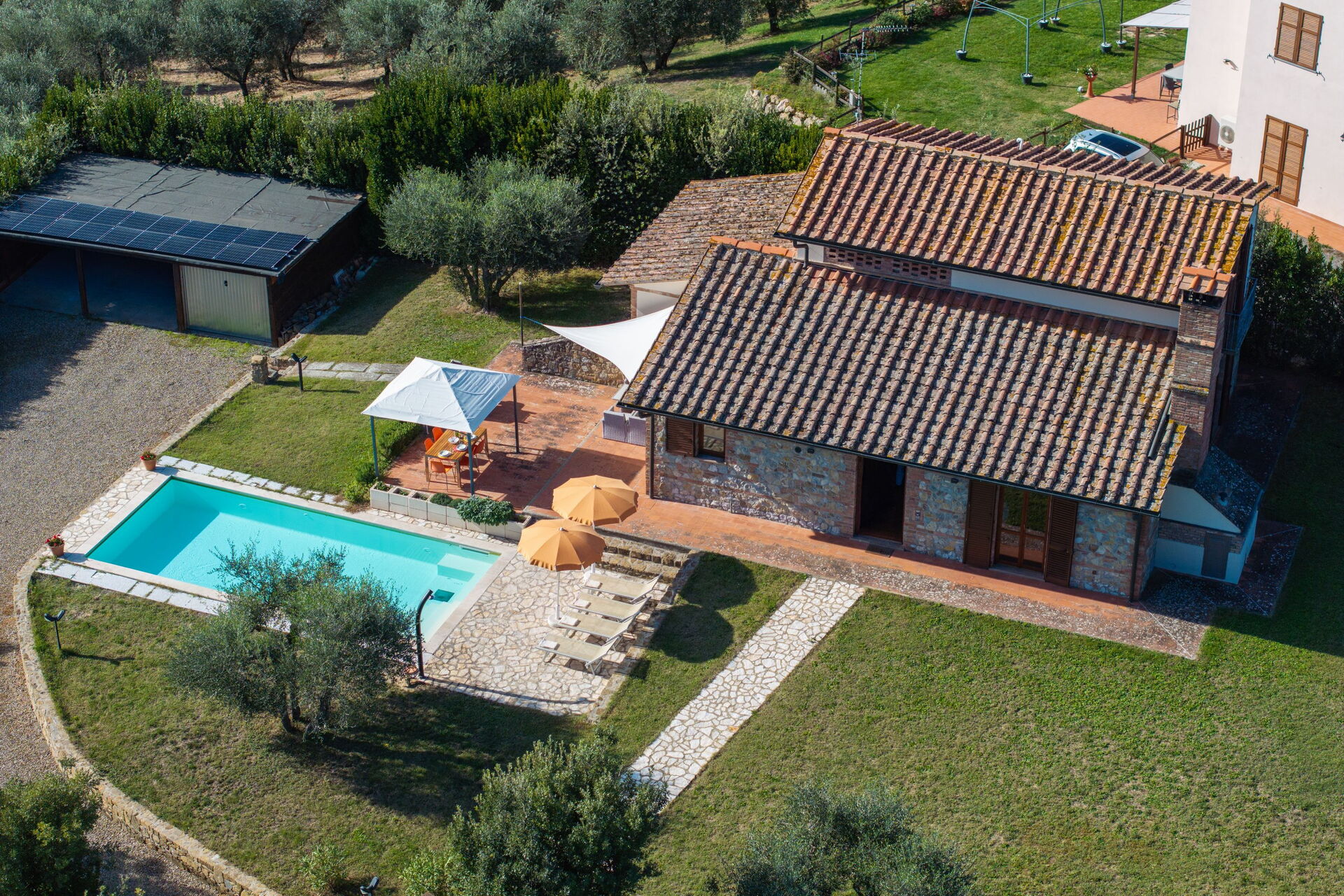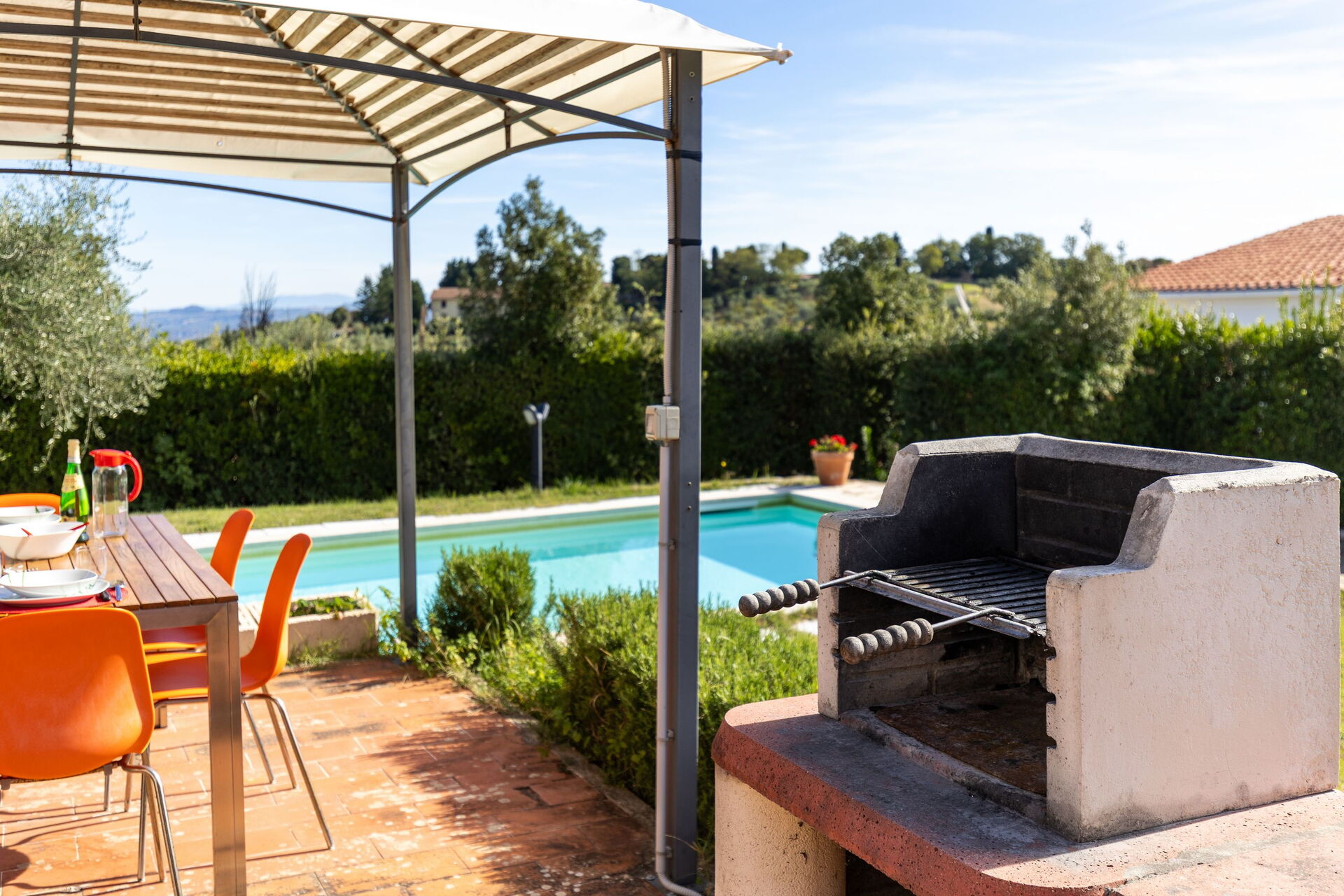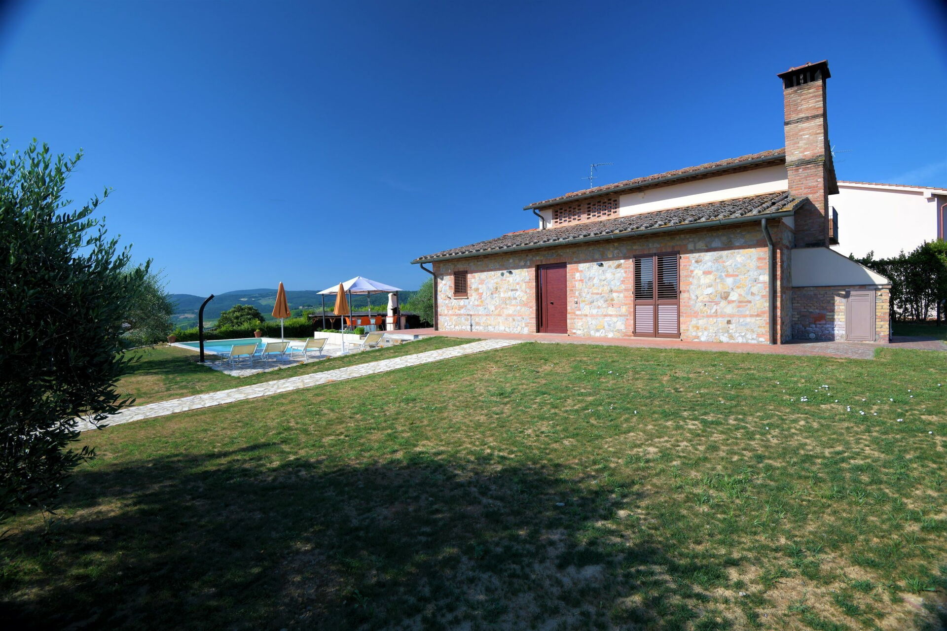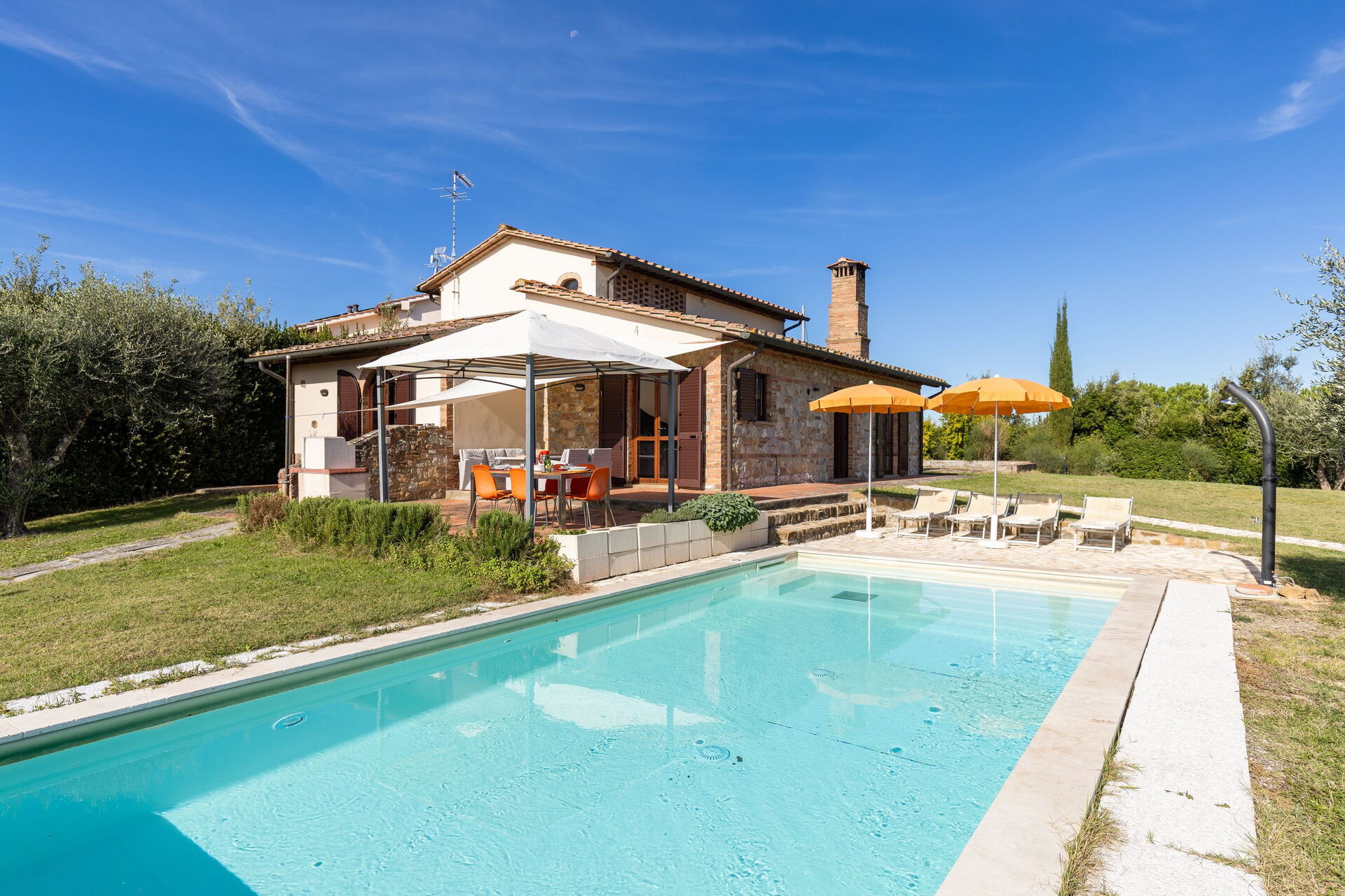 Esternamente gli ospiti possono usufruire di un giardino e di una nuovissima piscina (con scala romana e zona relax con geyser) che si affaccia sulla campagna e sulle famosissime torri di San Gimignano. Una zona attrezzata con gazebo, tavolo, sedie e barbecue si trova tra la piscina e la casa, esattamente in prossimità della cucina della villa.