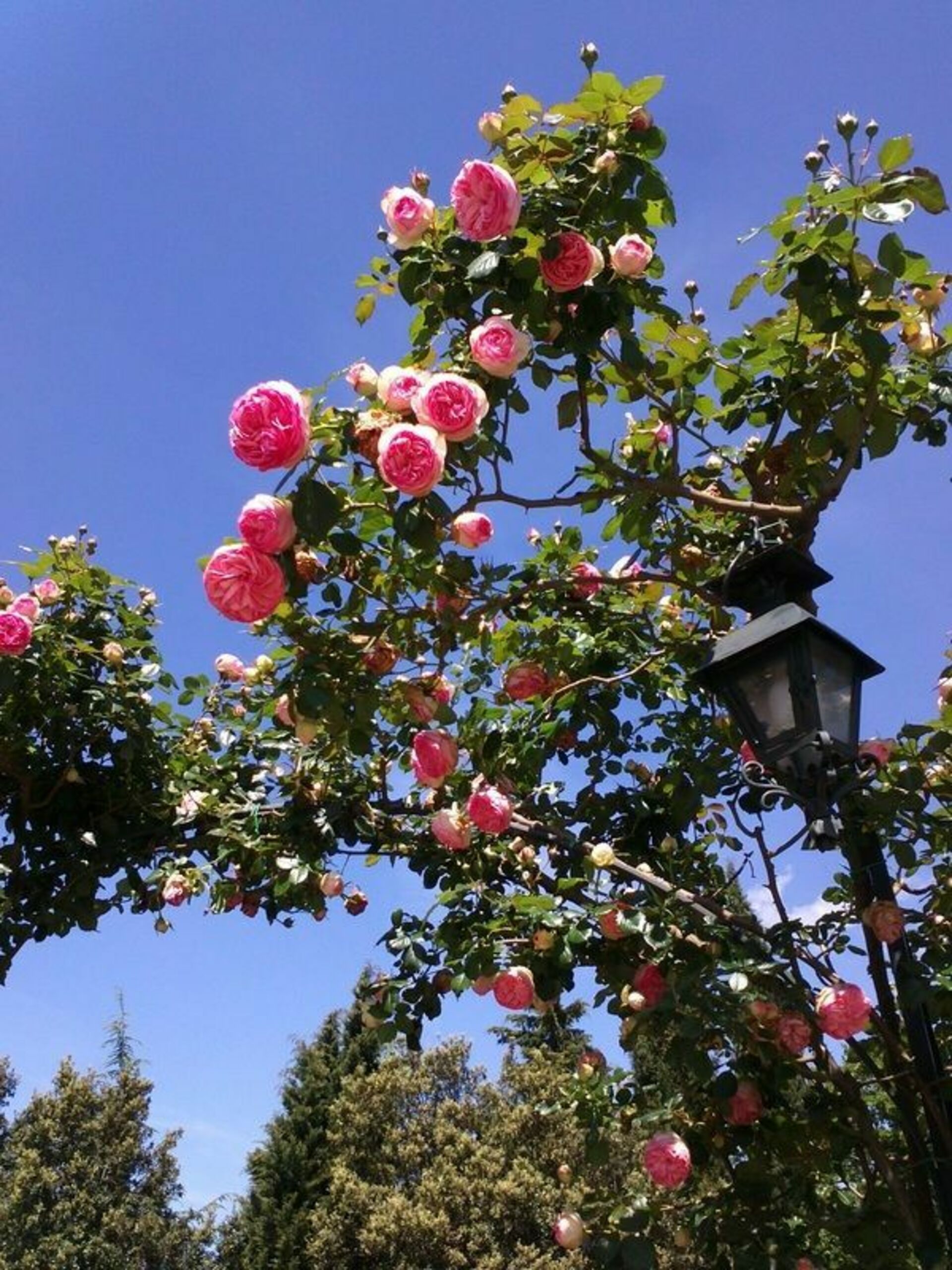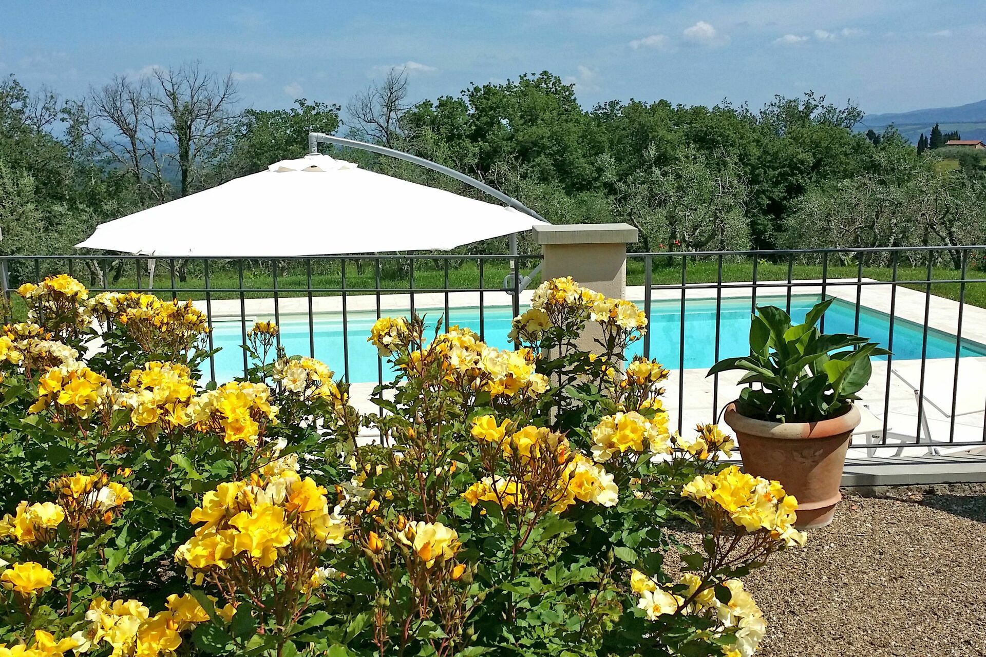 Un giardino ricco di piante e rose caratterizza questa villa con piscina privata in affitto nel Chianti.