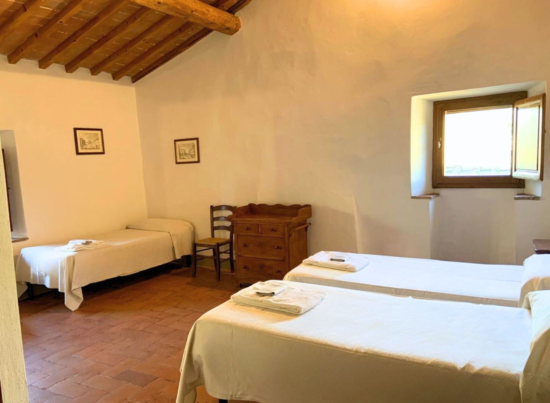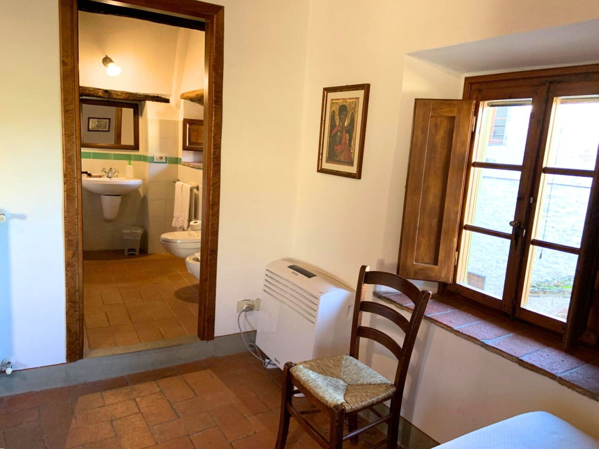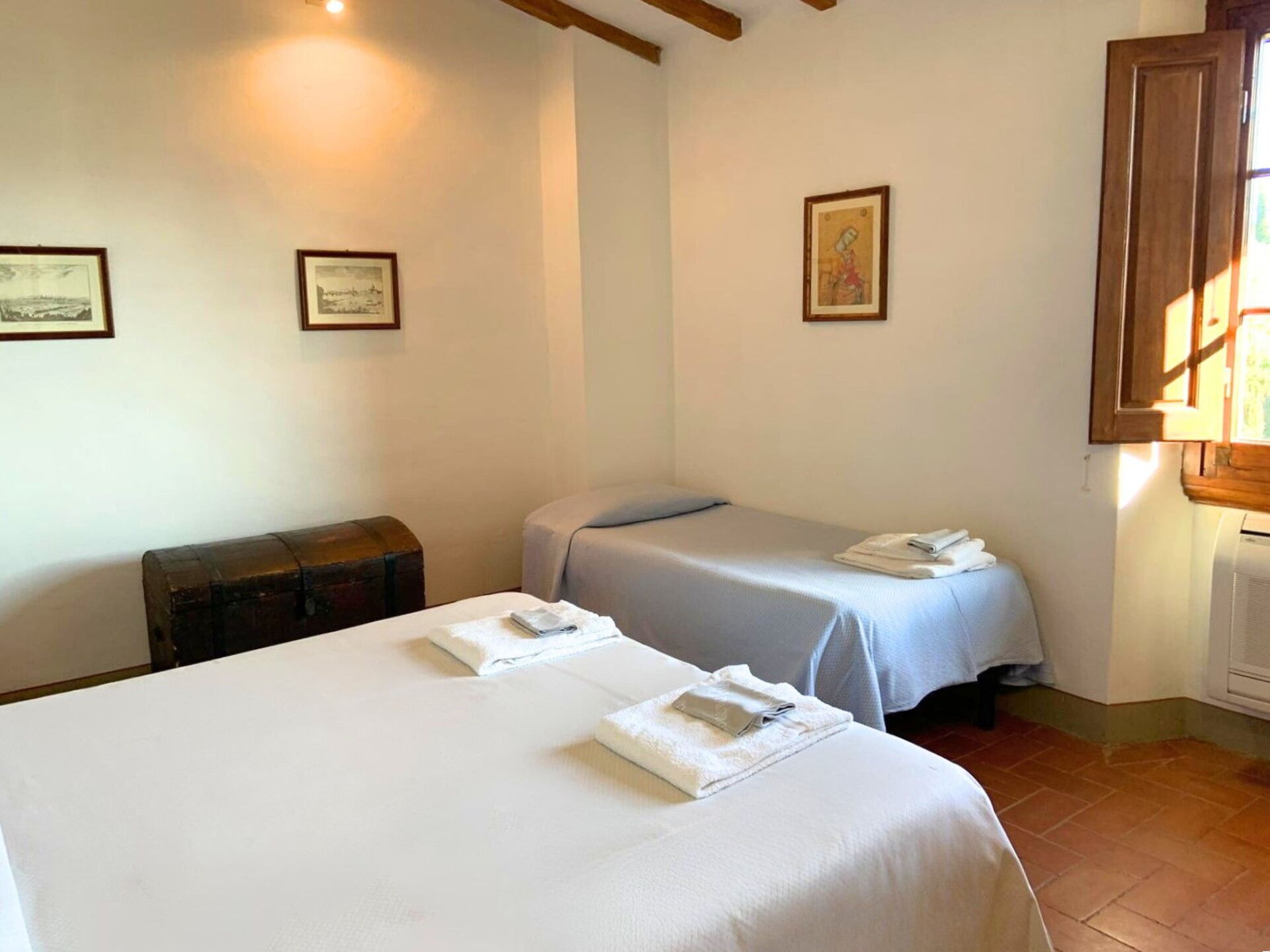 1° Piano: camera matrimoniale (aria condizionata) e bagno privato con doccia, camera con 2 letti singoli (aria condizionata) e bagno privato con doccia,