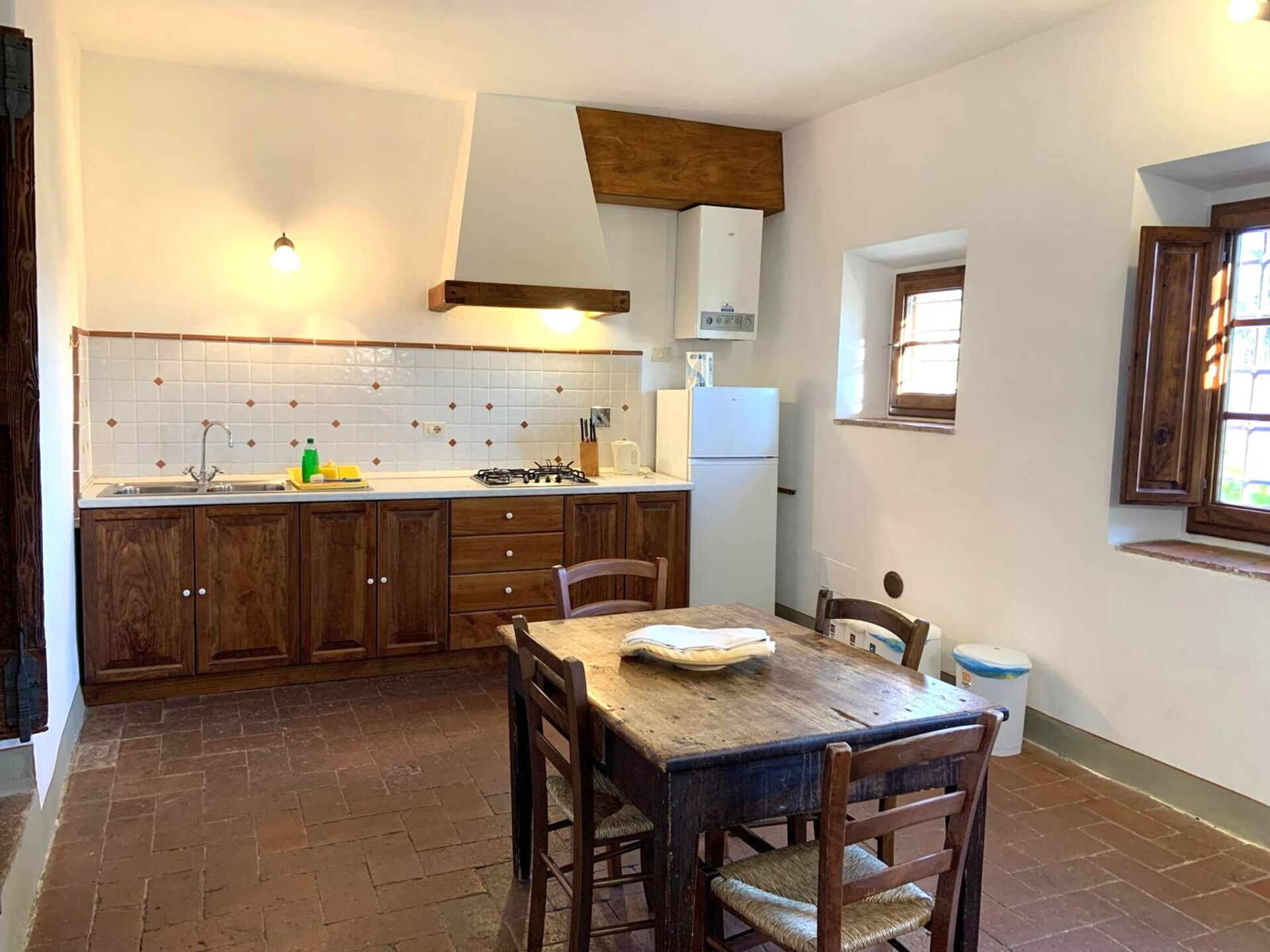 2 gradini più in basso: cucina (freezer, forno elettrico) con zona pranzo e accesso sull’esterno.