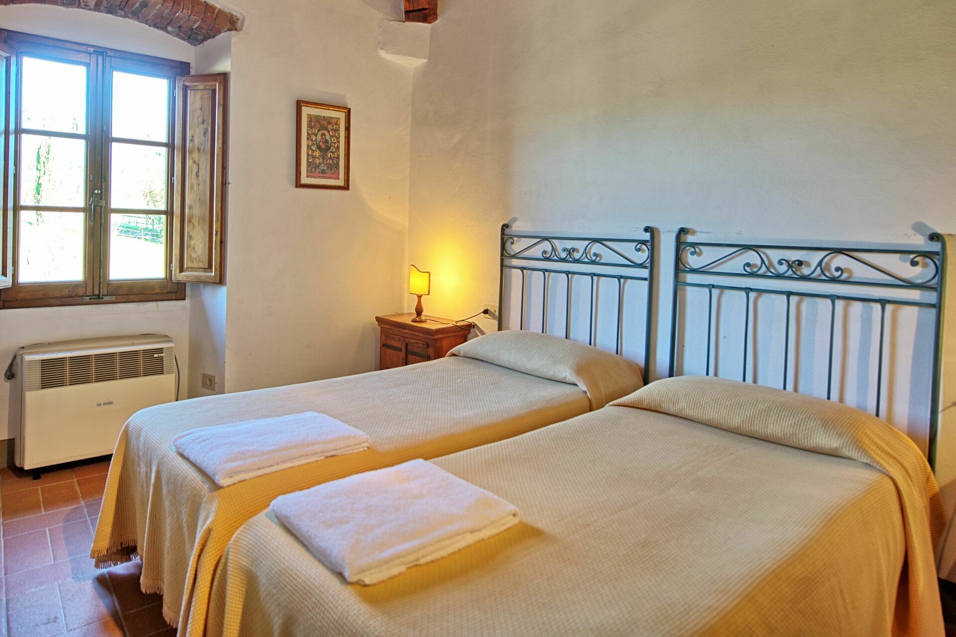 1° Piano: camera matrimoniale (aria condizionata) e bagno privato con doccia, camera con due letti singoli (aria condizionata) e bagno privato con doccia.