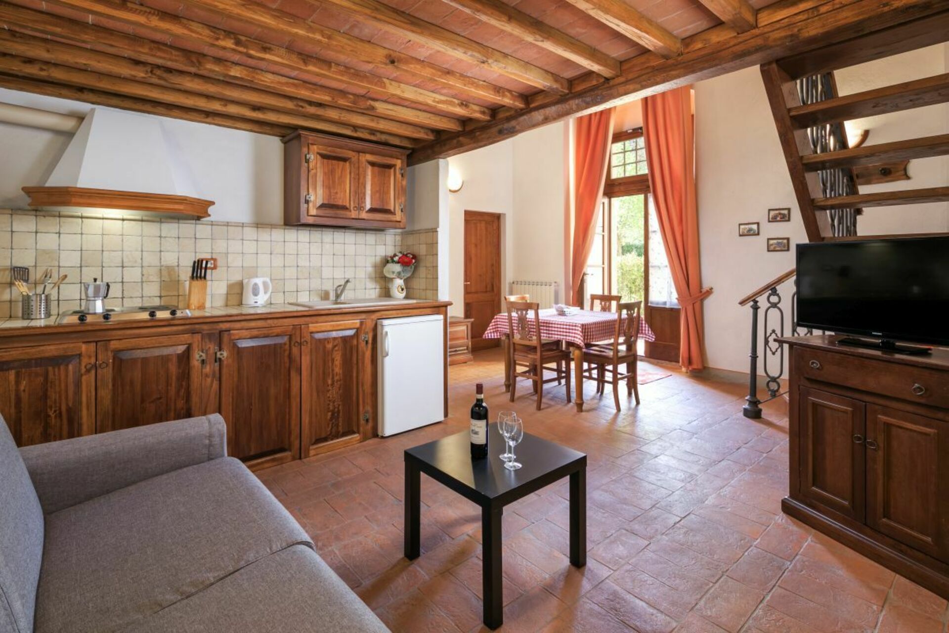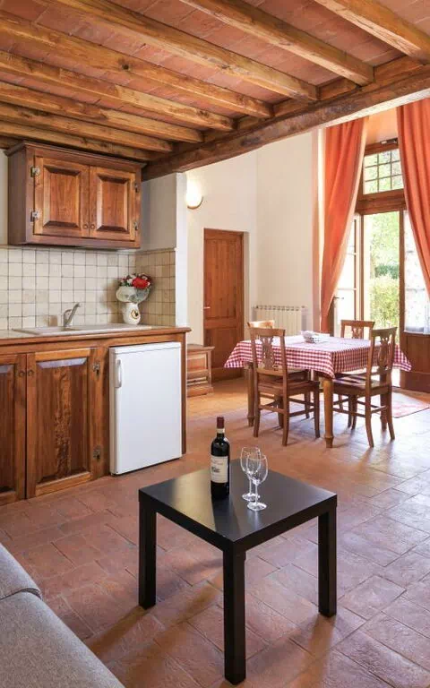 Piano terreno: soggiorno con zona pranzo e angolo cottura, bagno con doccia.