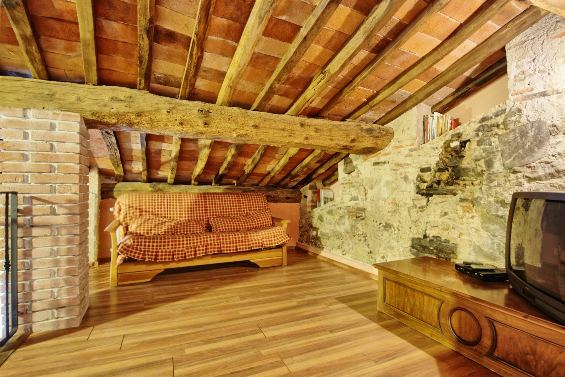 Soppalco: soggiorno con divano letto matrimoniale, camera matrimoniale.
