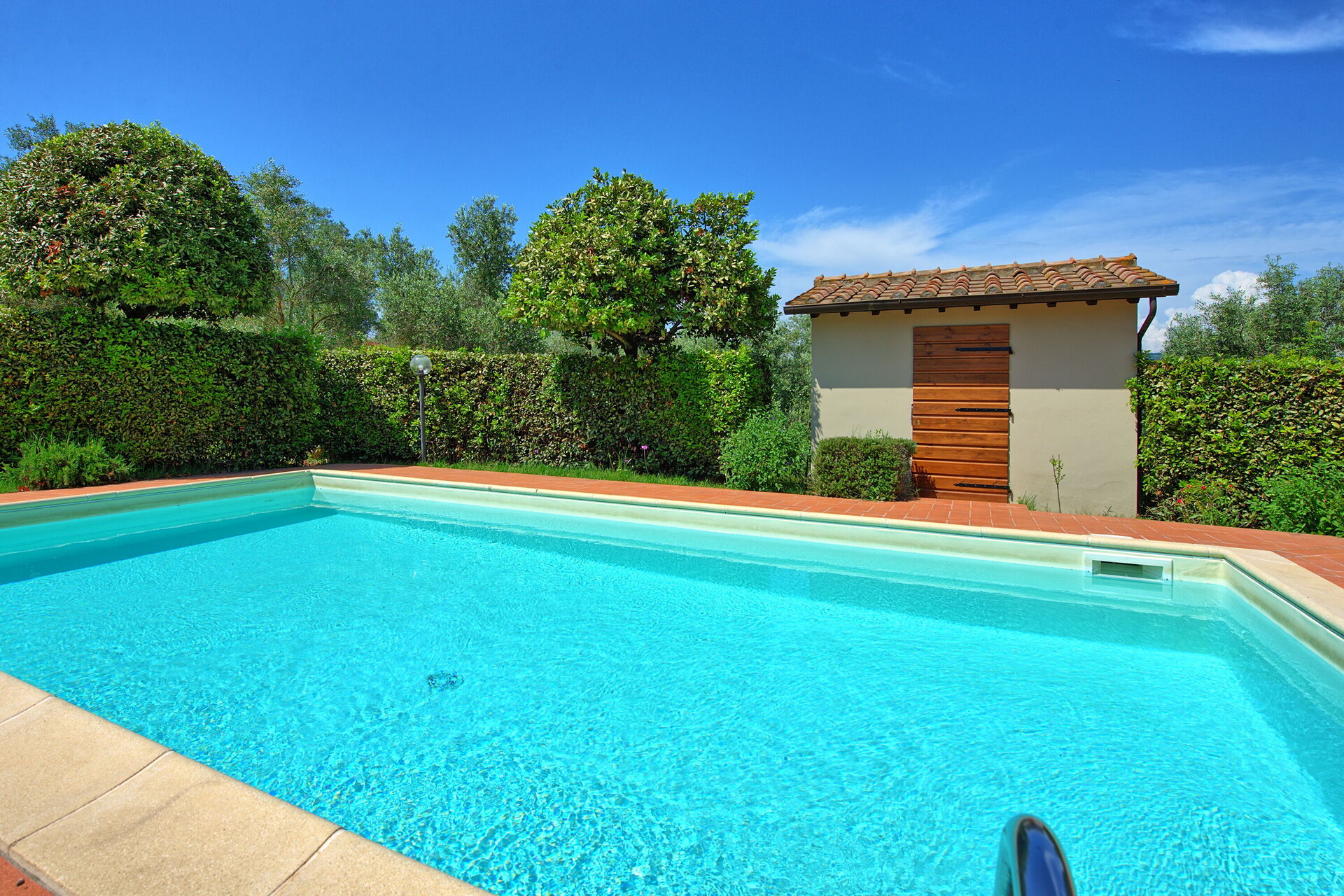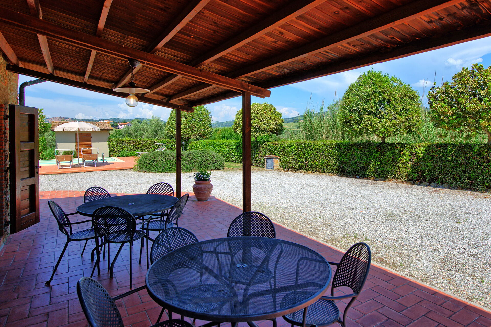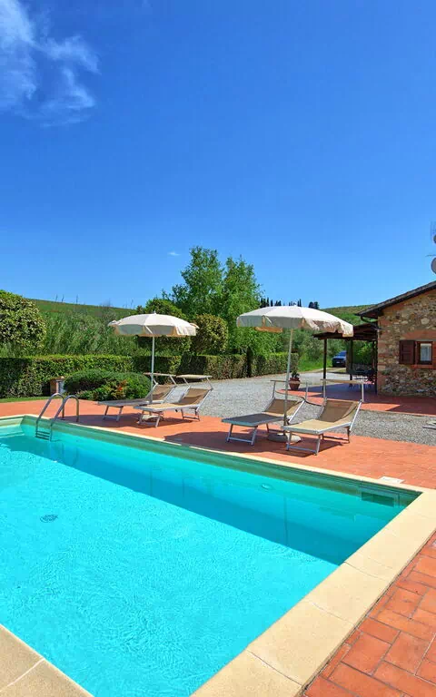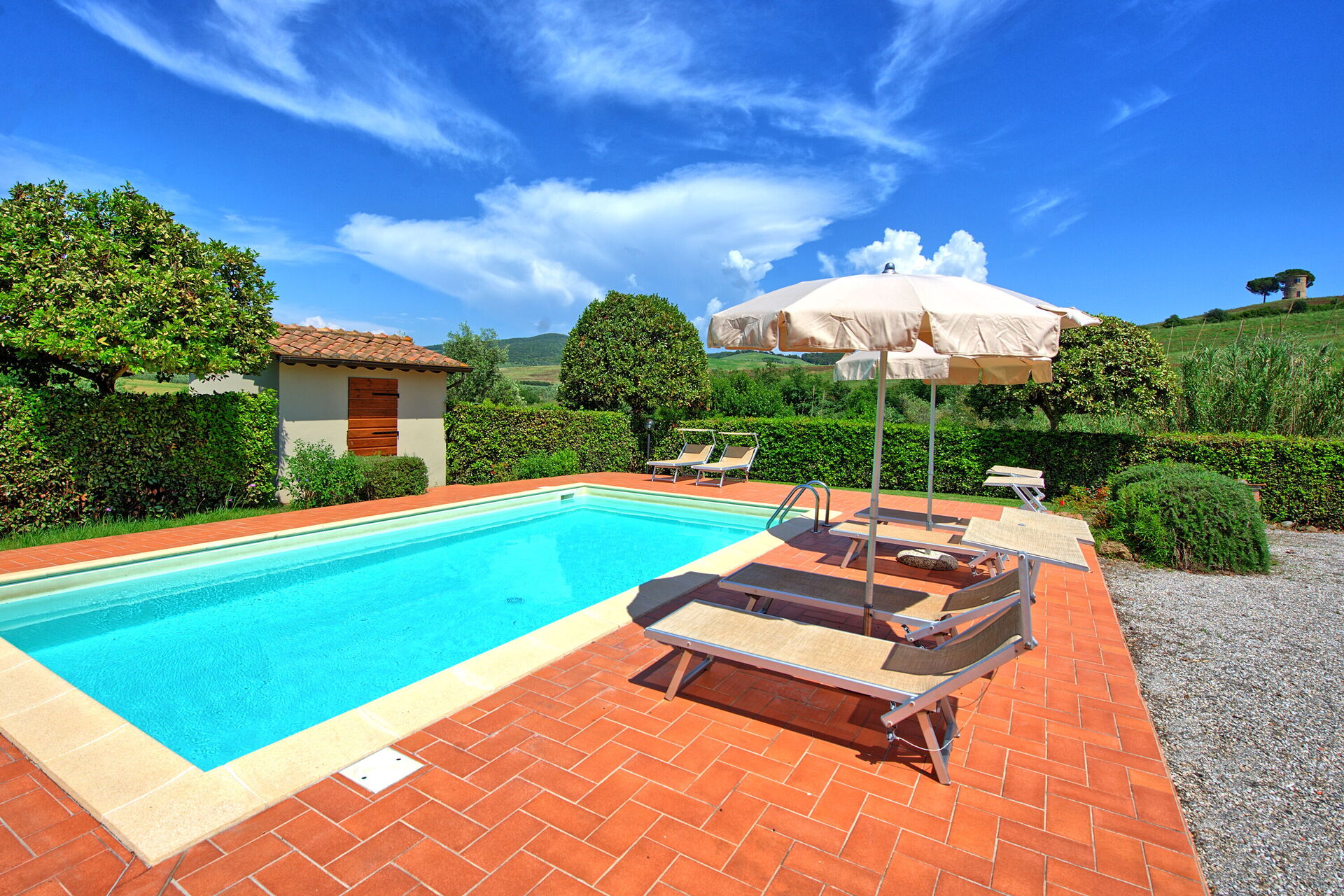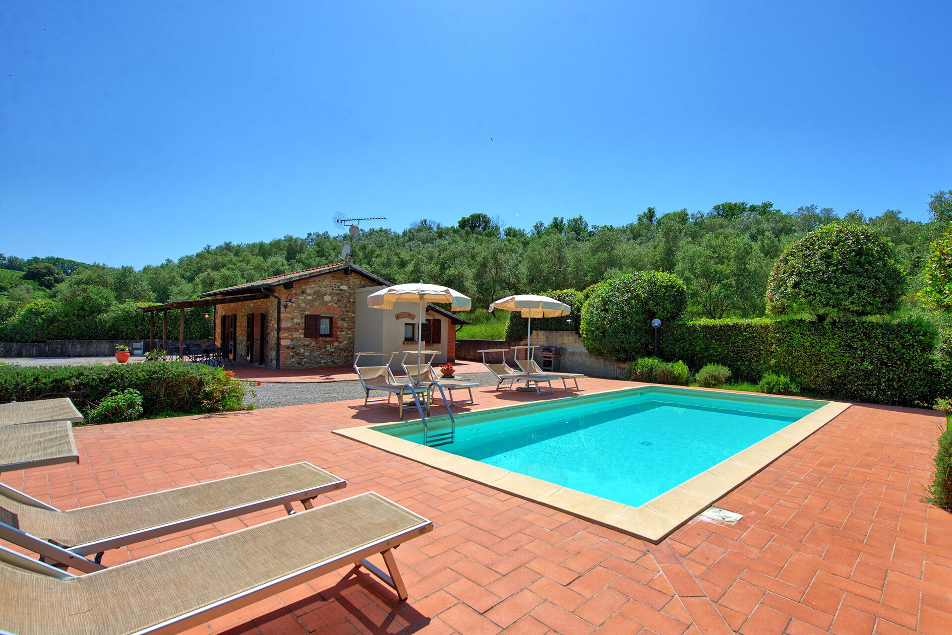 All'esterno, una giardino curato e in parte terrazzato offrono una bella piscina privata e un'area barbecue attrezzata con tavolo e sedie per poter comodamente organizzare i propri pasti all'aperto. Da qui potrete godere di una fantastica vista sulla campagna e sulla natura circostante.