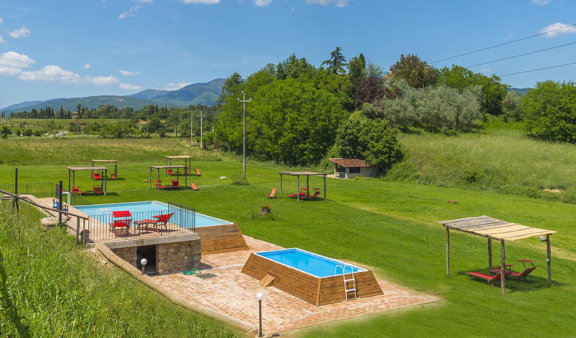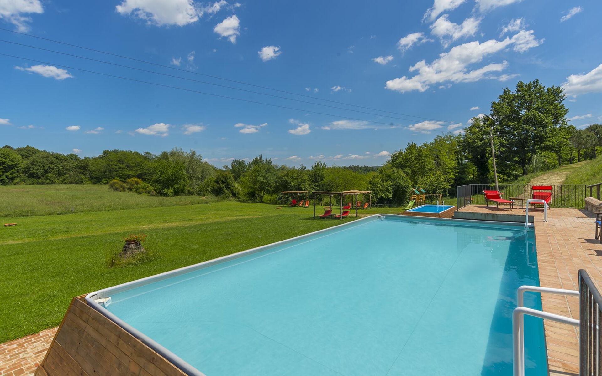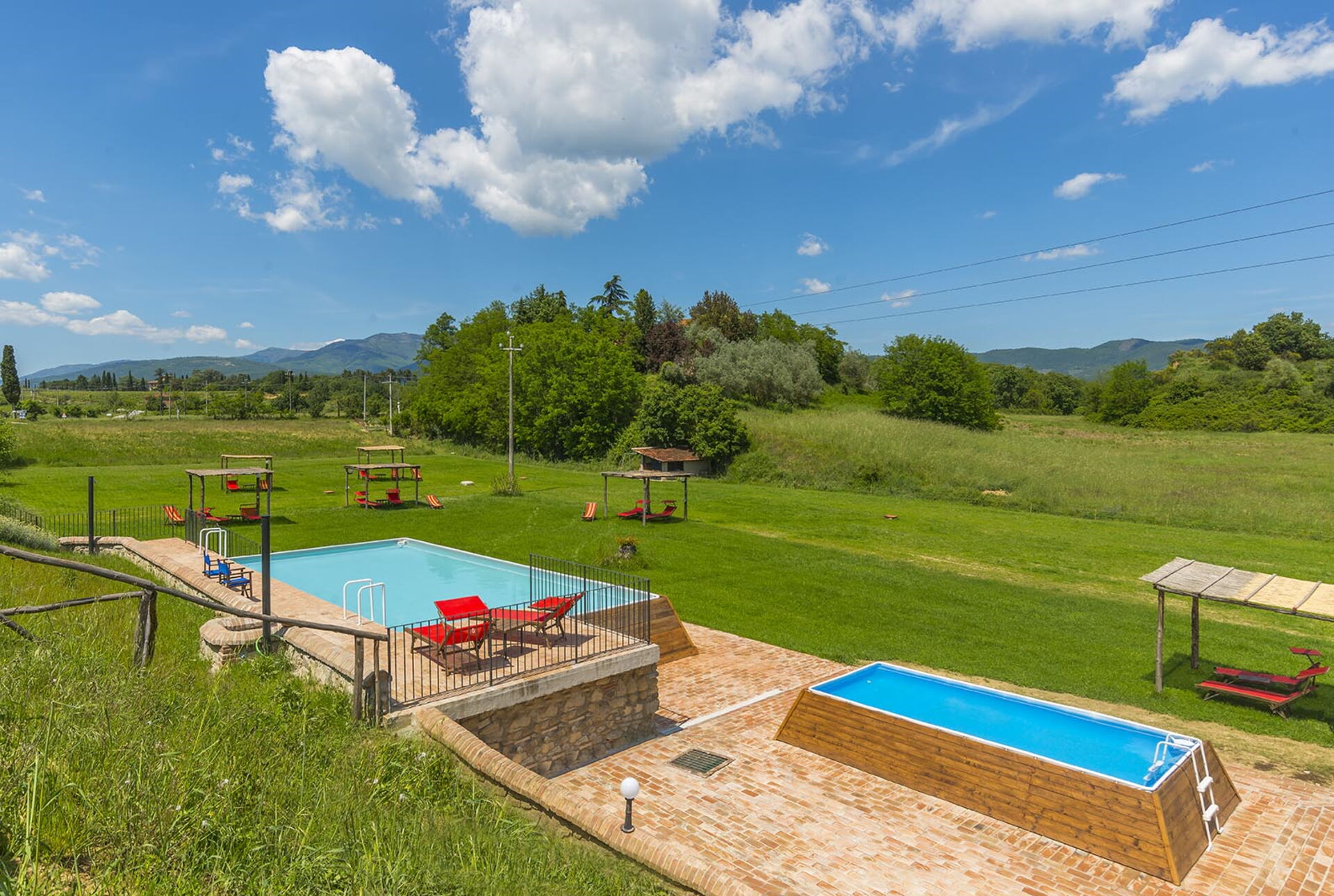 - 2 piscine fuori terra a uso condiviso: piscina per adulti (12 x 6 m - massima profondità 1,4 m); piscina per bambini (4 x 3 m - massima profondità 0,8 m);