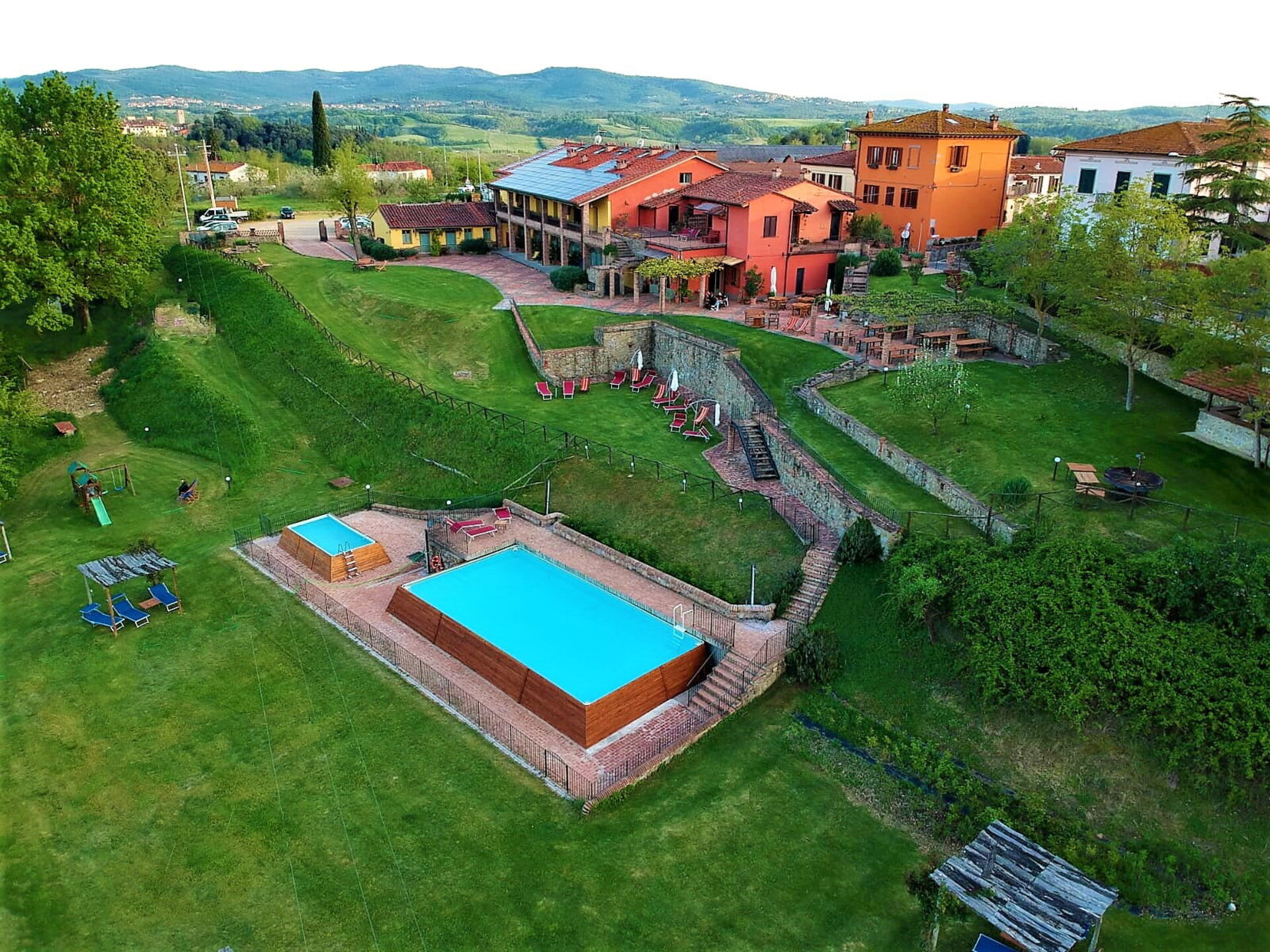 All'esterno, Le Fornaci offre ai propri ospiti un ampio, panoramico e ben curato giardino che ospita 2 piscine, di cui una per i più piccoli, ad uso condiviso tra tutti gli ospiti del complesso; intorno alle piscine ci sono lettini prendisole, ombrelloni e ampi spazi versi in cui trascorrere lunghe e rilassanti giornate sotto il sole della Toscana. Una grande area comune con barbecue permette di organizzare allegre grigliate in compagnia.