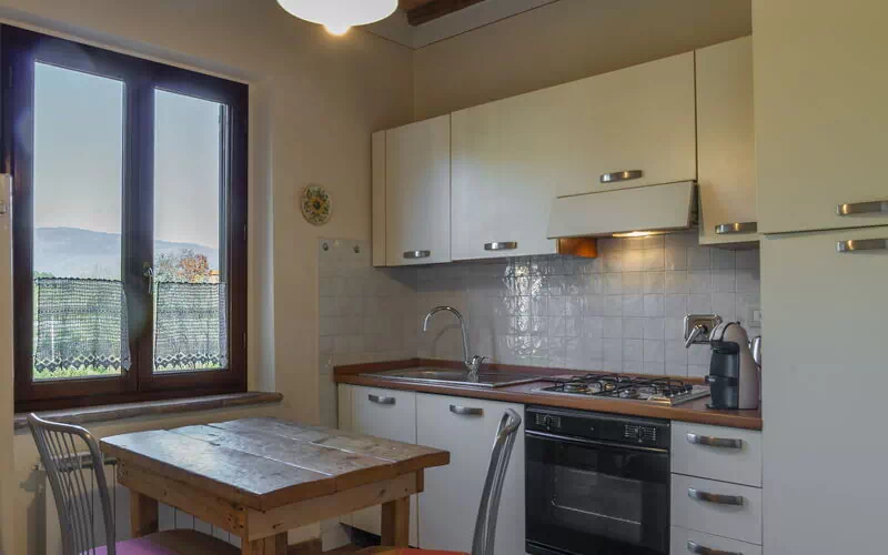 Primo piano: zona giorno con soggiorno (ventilatore) con camino e zona pranzo con cucina (lavastoviglie, forno, frigo, piano cottura a induzione, macchina da caffè), camera matrimoniale, bagno con doccia.