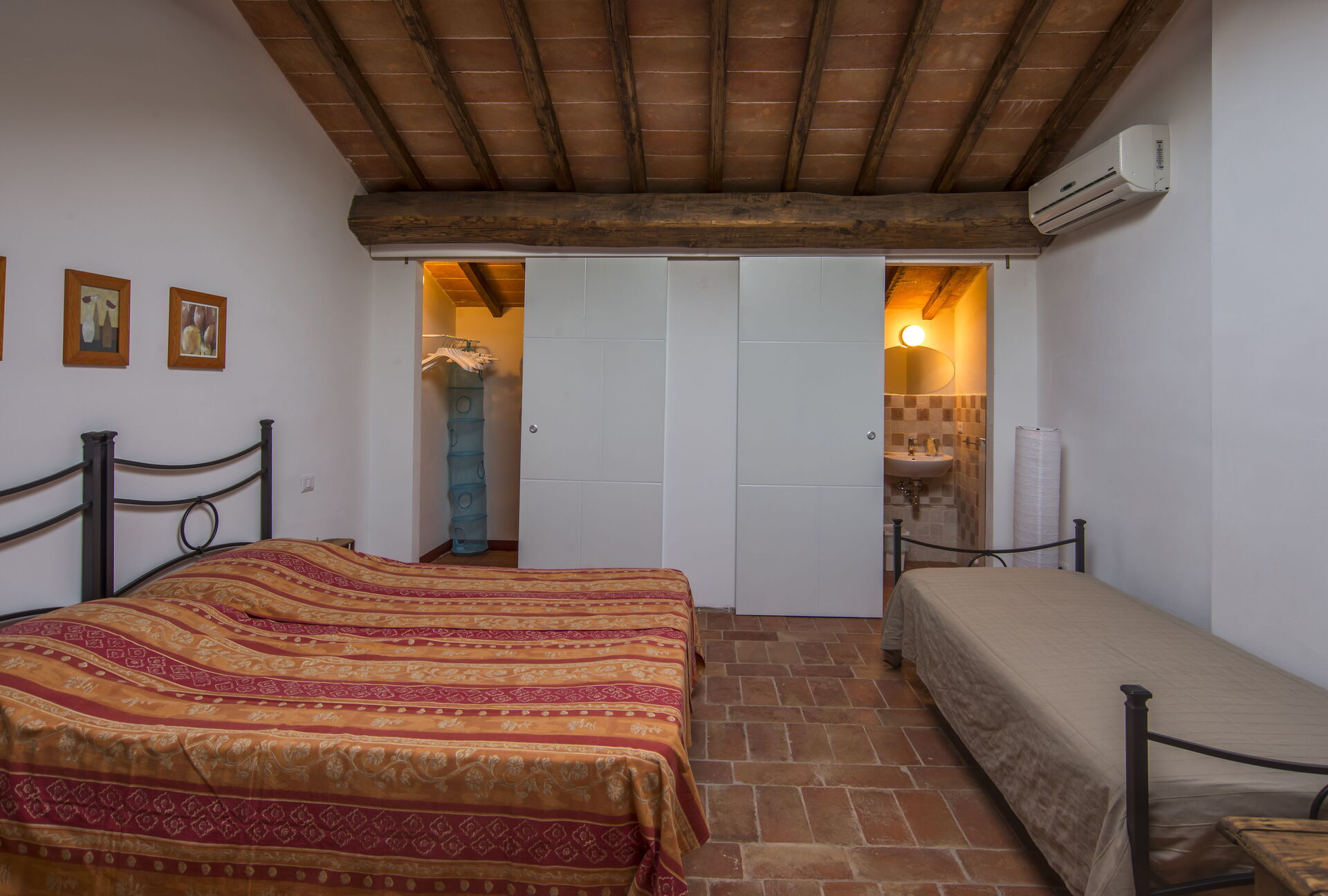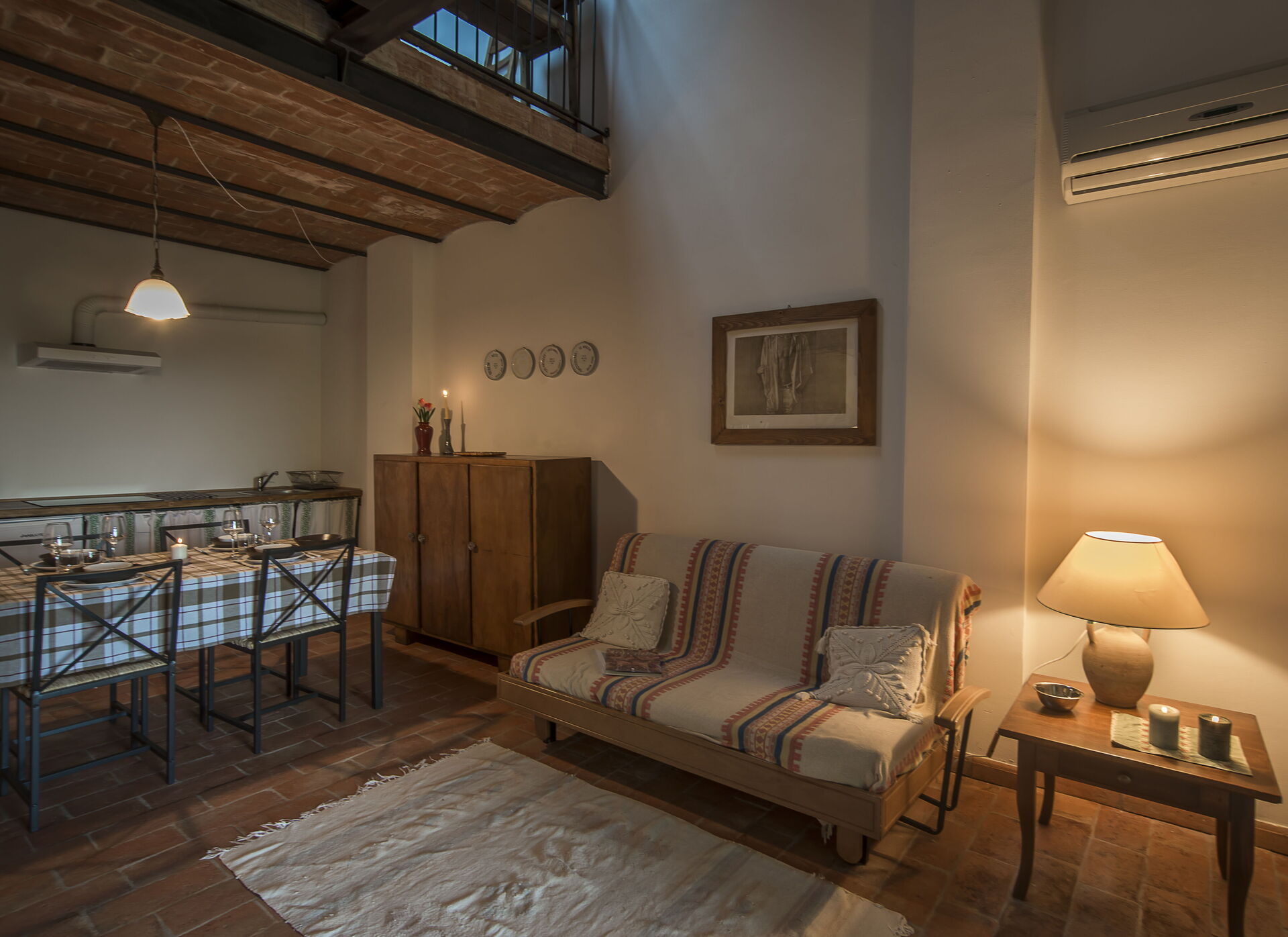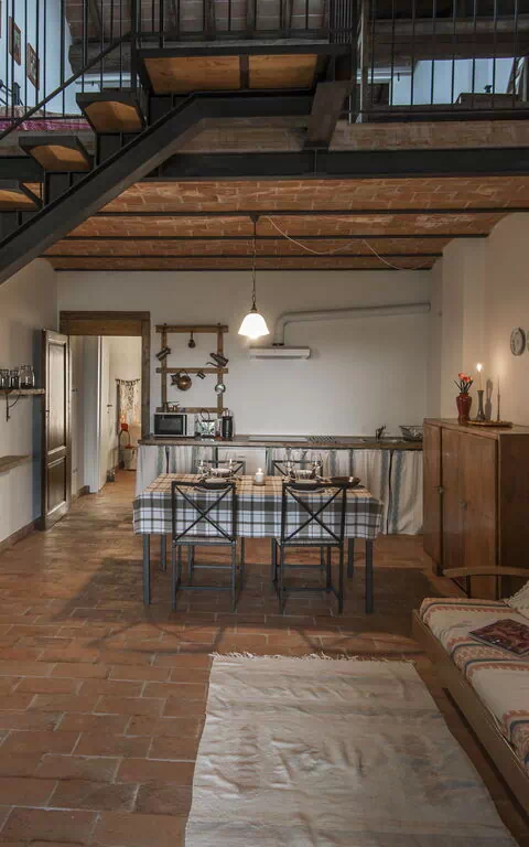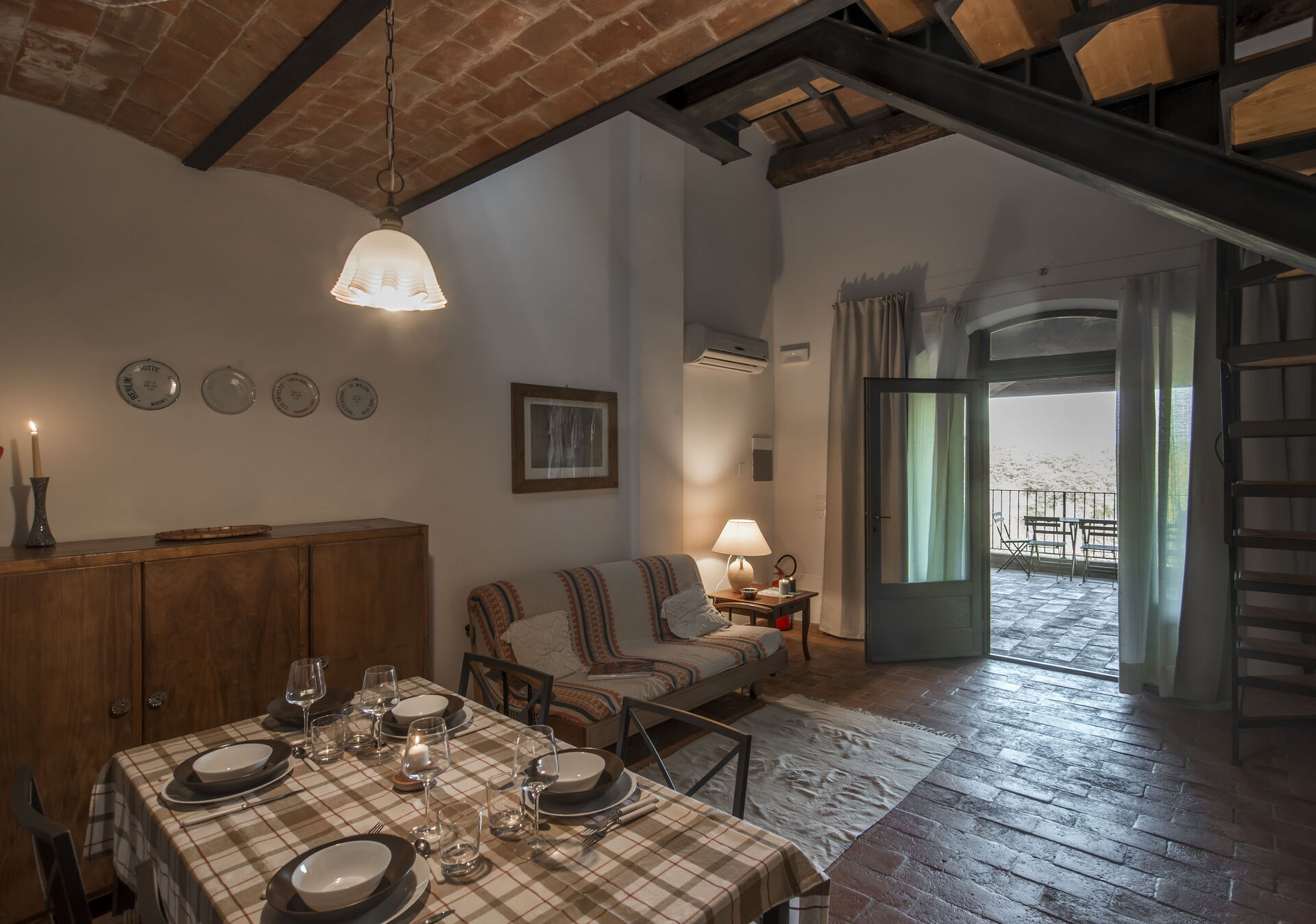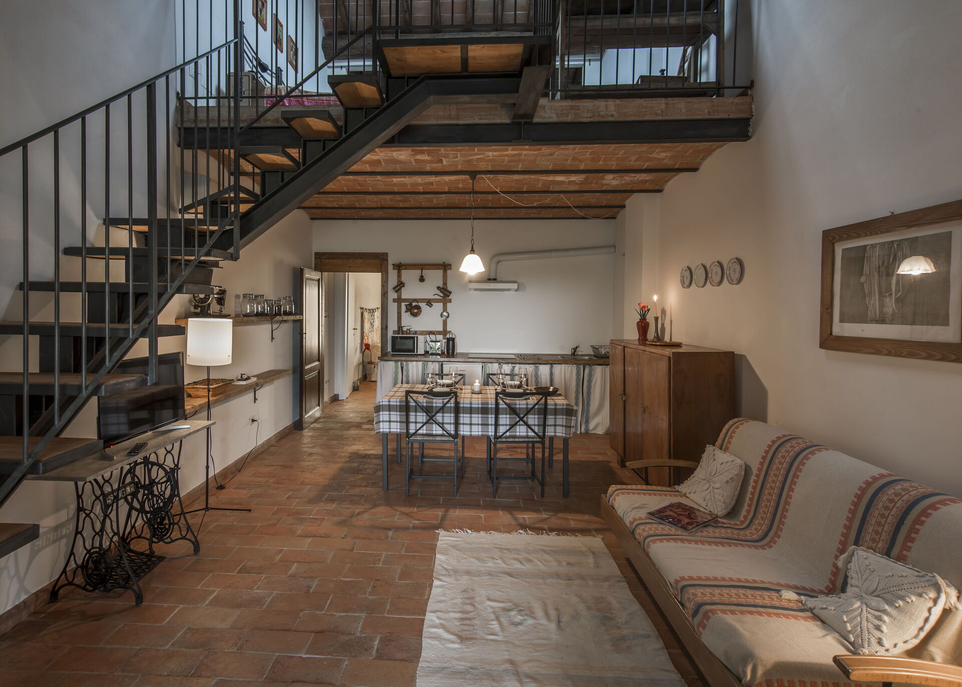 Primo piano: ampia zona giorno con soggiorno (con divano letto matrimoniale extra e su richiesta) e con accesso ad un soppalco con letto matrimoniale (trasformabile su richiesta in 2 letti singoli) e un letto singolo e un bagno con doccia; zona pranzo con cucina (lavastoviglie, forno, frigo, piano cottura a induzione, microonde, macchina da caffè, ventilatore), camera matrimoniale, bagno con doccia.