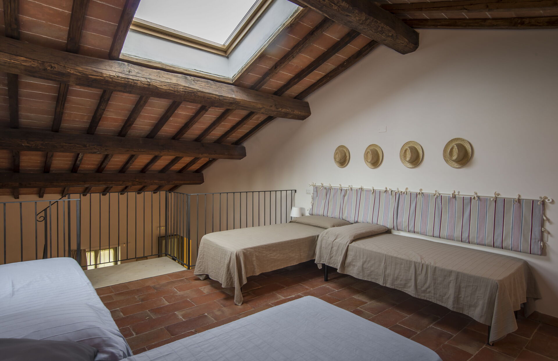 Primo piano: ampia zona giorno con soggiorno (con divano letto matrimoniale extra e su richiesta) e con accesso ad un soppalco con camera con 4 letti singoli e un bagno con doccia; zona pranzo con cucina (lavastoviglie, forno, frigo, piano cottura a induzione, microonde, macchina da caffè, ventilatore), camera matrimoniale, bagno con doccia.