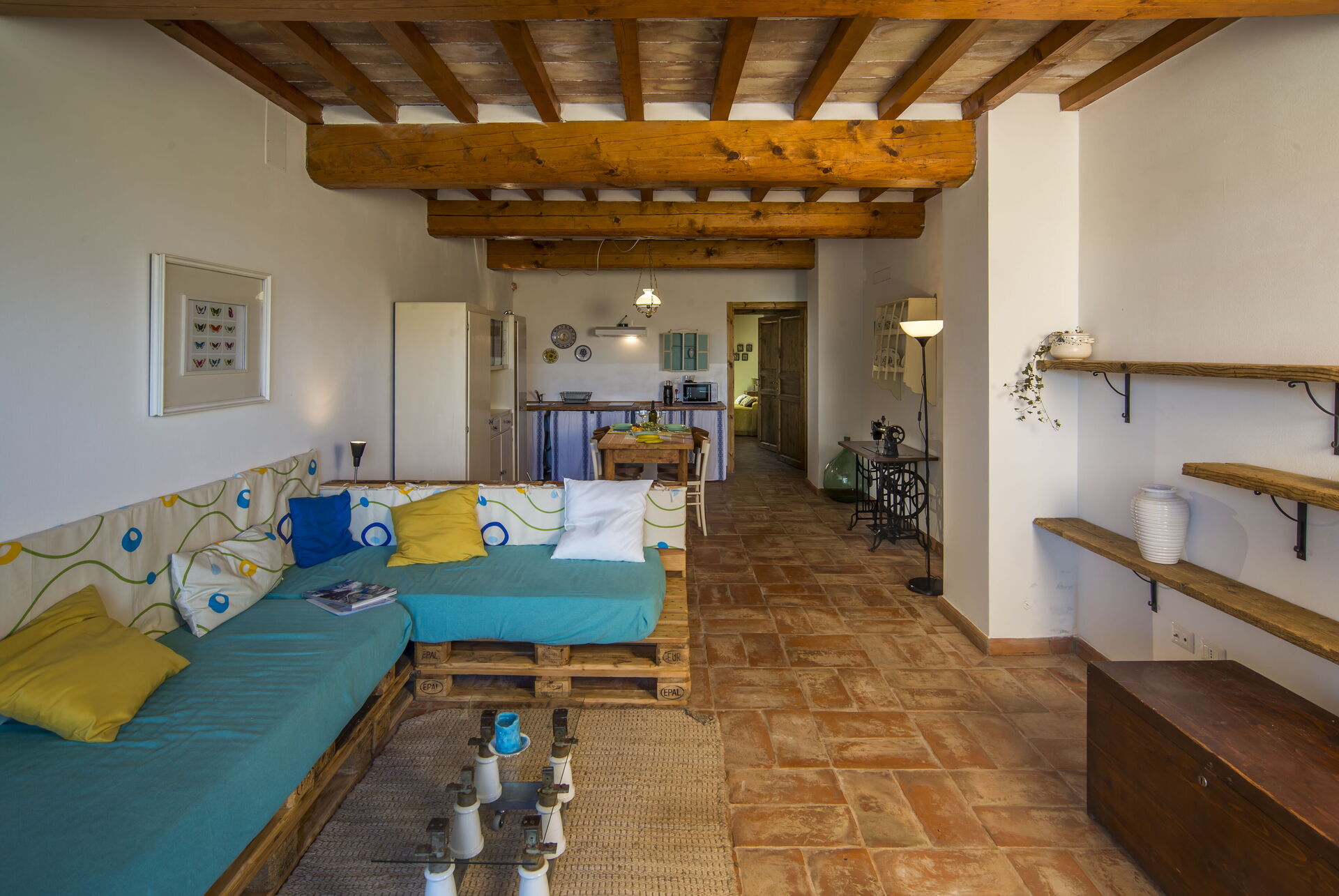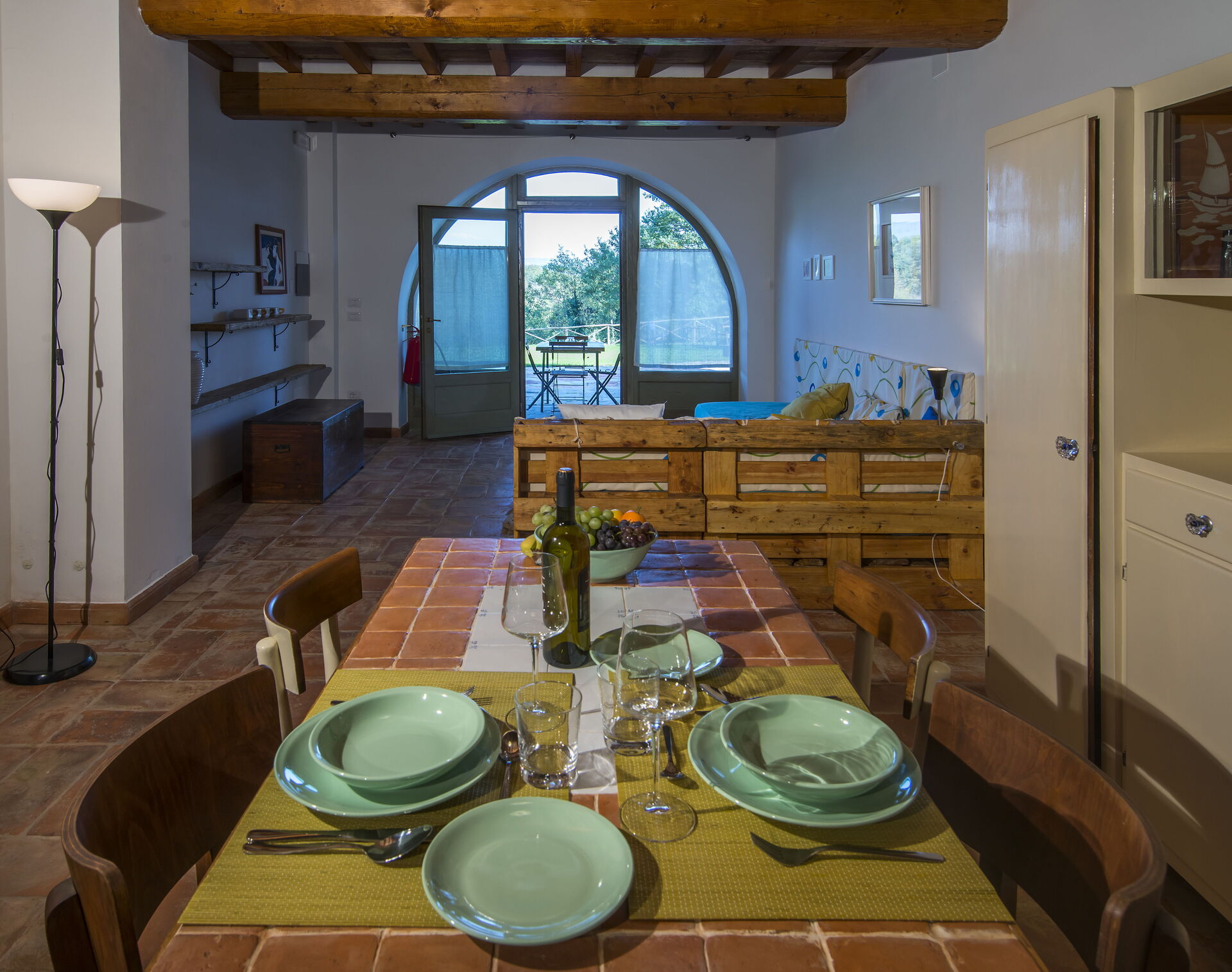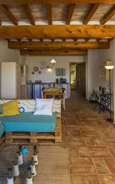 Piano terra: zona giorno con soggiorno (con 2 divano letto singoli extra e su richiesta) e zona pranzo con cucina (lavastoviglie, forno, frigo, piano cottura a induzione, microonde, macchina da caffè, ventilatore), camera matrimoniale, bagno con doccia.
