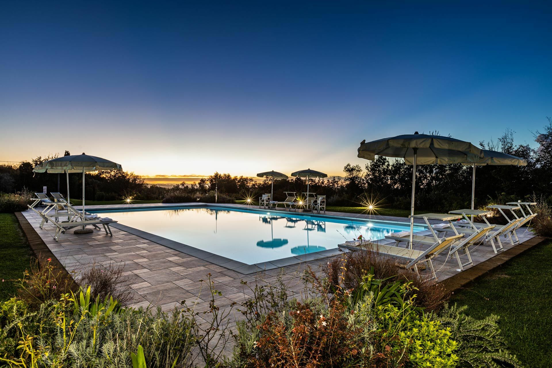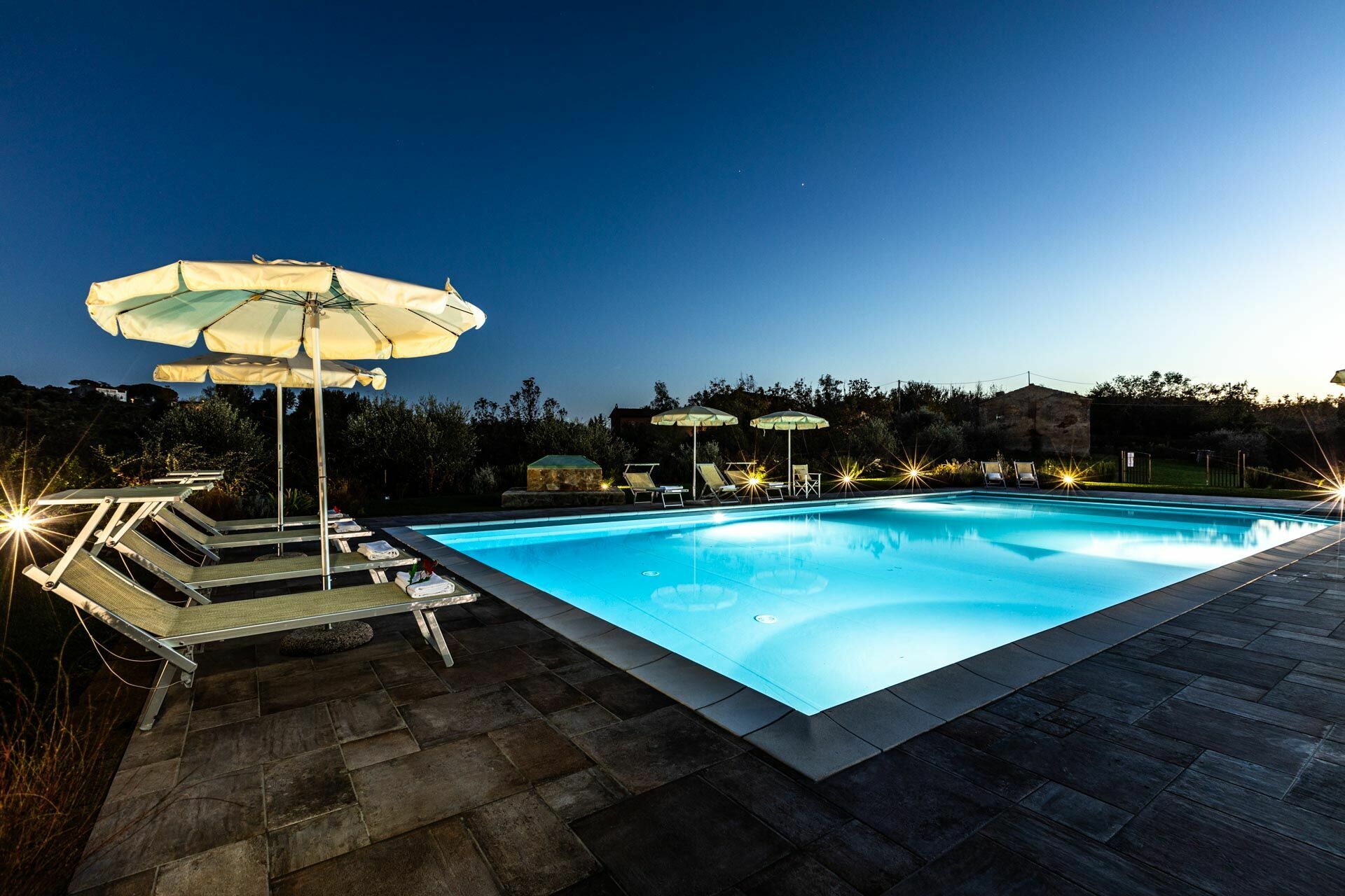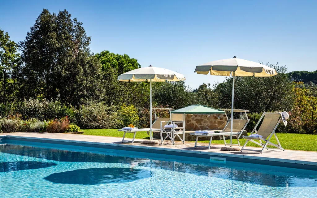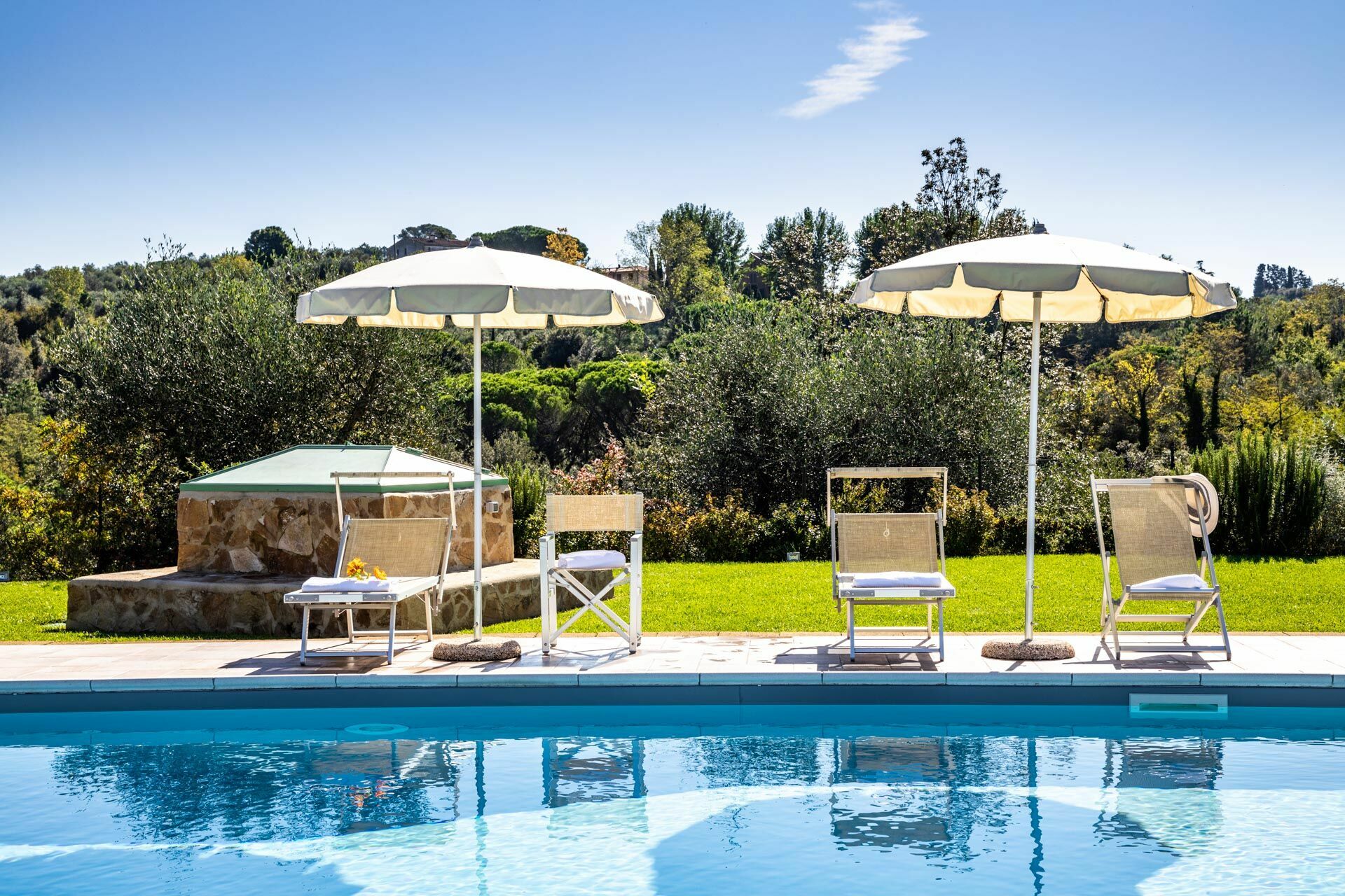 La villa in affitto è avvolta dalla natura e dallo splendido paesaggio collinare che caratterizza le campagne in Toscana. Un giardino curato circonda Villa Bonriposo, garantendo la totale privacy. A 100 metri dall'entrata della casa si trova la bella piscina privata, dotata di solarium con lettini e sedie: è il luogo ideale per trascorrere lunghe giornate nella stagione più calda, rilassandosi e rinfrescandosi in compagnia di amici e familiari e ammirando la favolosa vista panoramica sul paese di Montefoscoli che offre questa esclusiva location.
