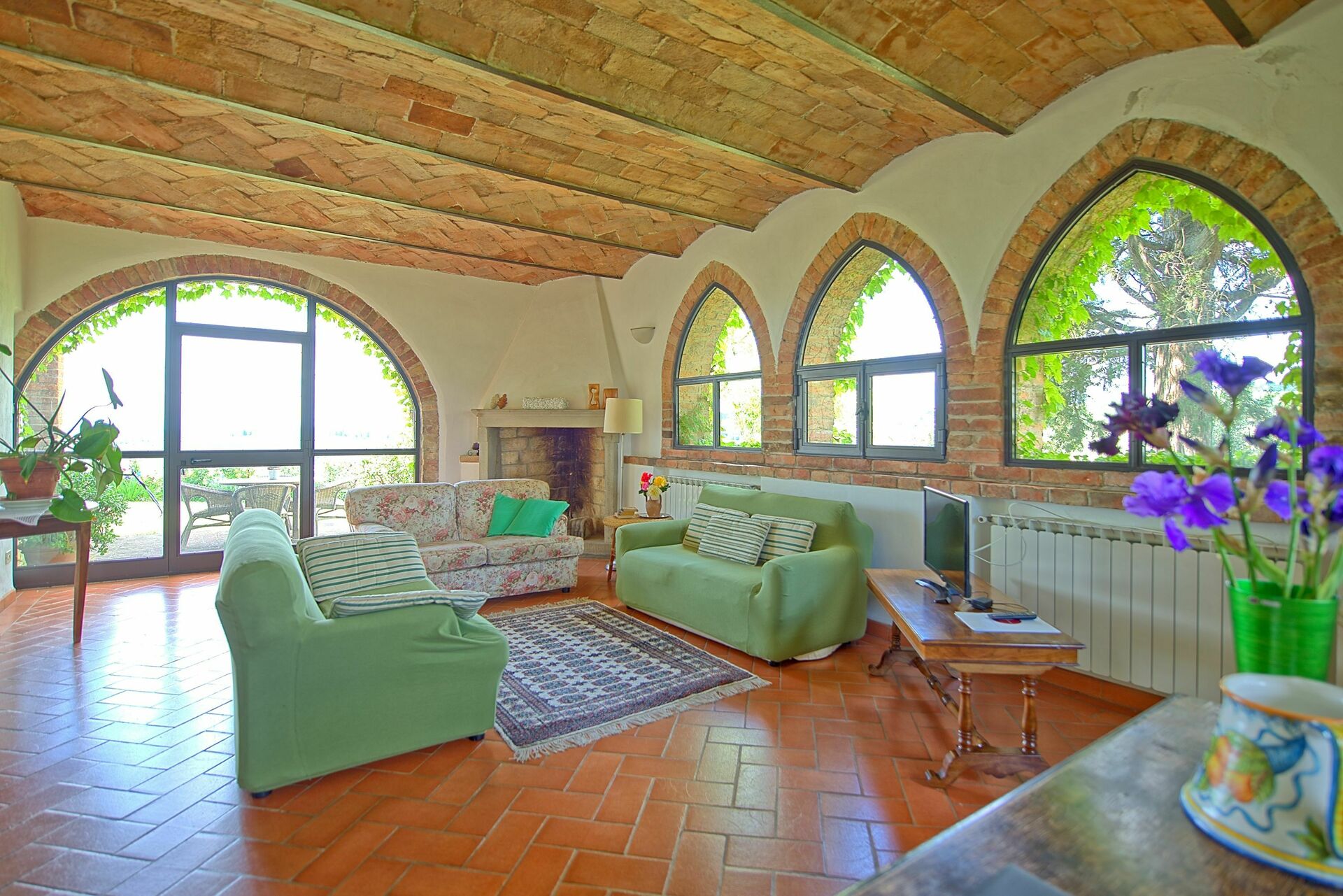 2 gradini sotto: luminoso soggiorno (TV) con accesso sull'esterno (il camino non è utilizzabile)