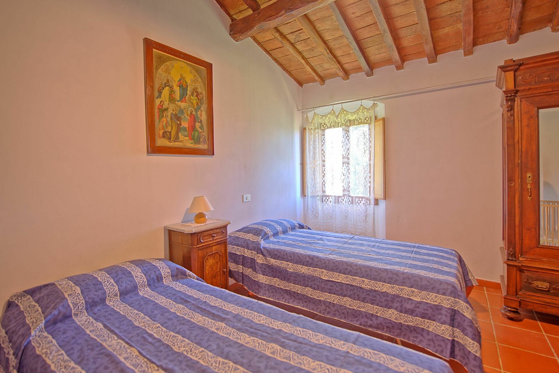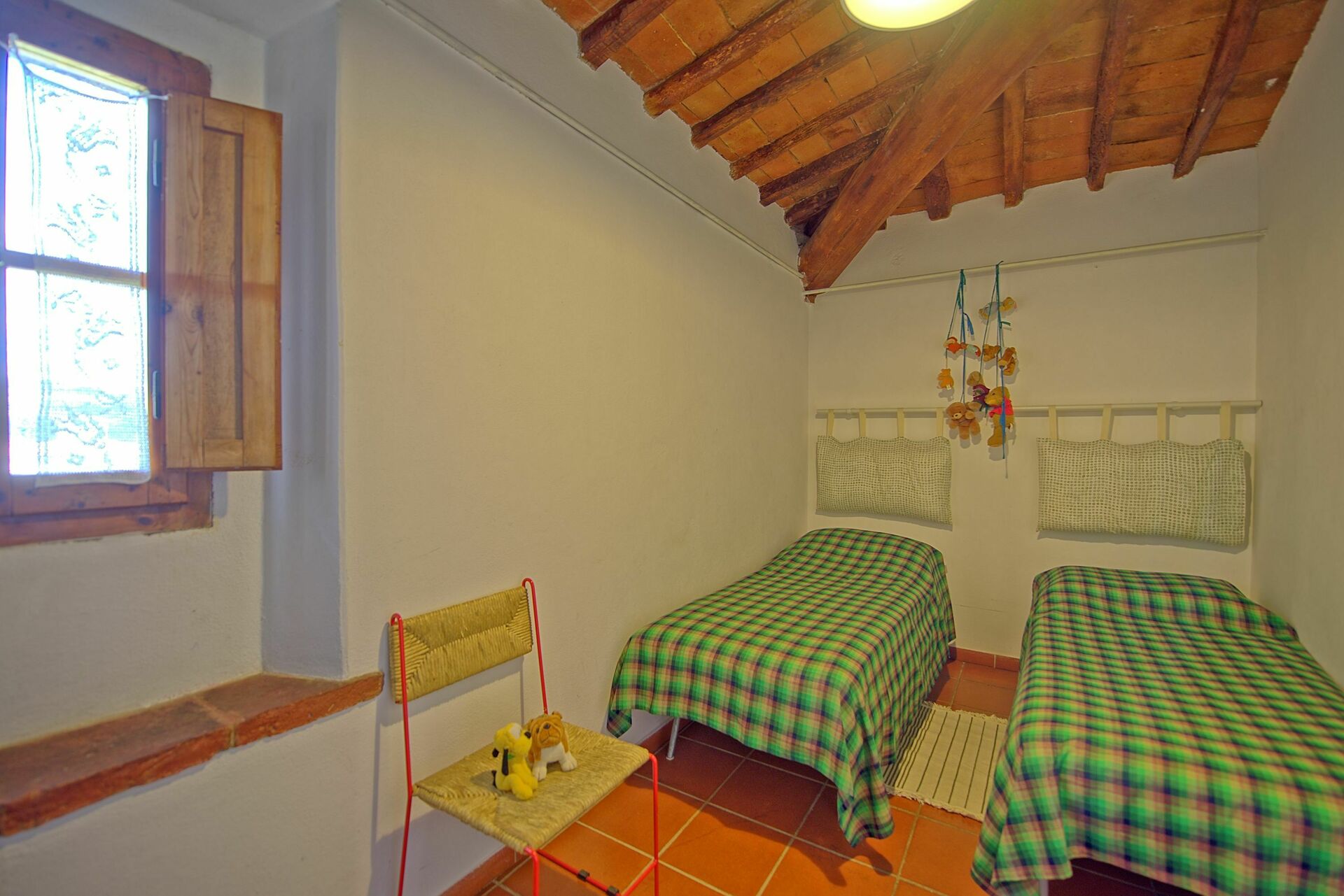 6 gradini sotto: camera matrimoniale, camera con 2 letti singoli, bagno con doccia.