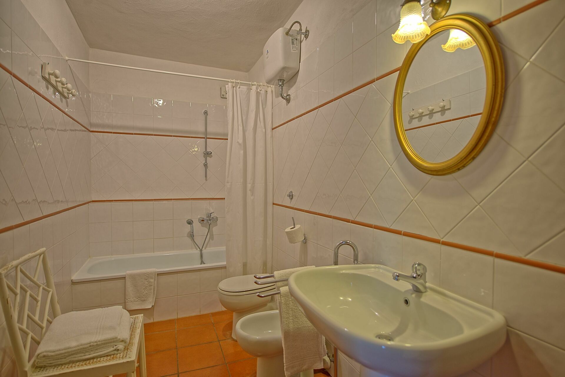 Primo piano: camera matrimoniale con bagno privato con vasca e attacco doccia (senza finestra), 2 camere entrambe con 2 letti singoli, bagno con doccia (senza finestra).