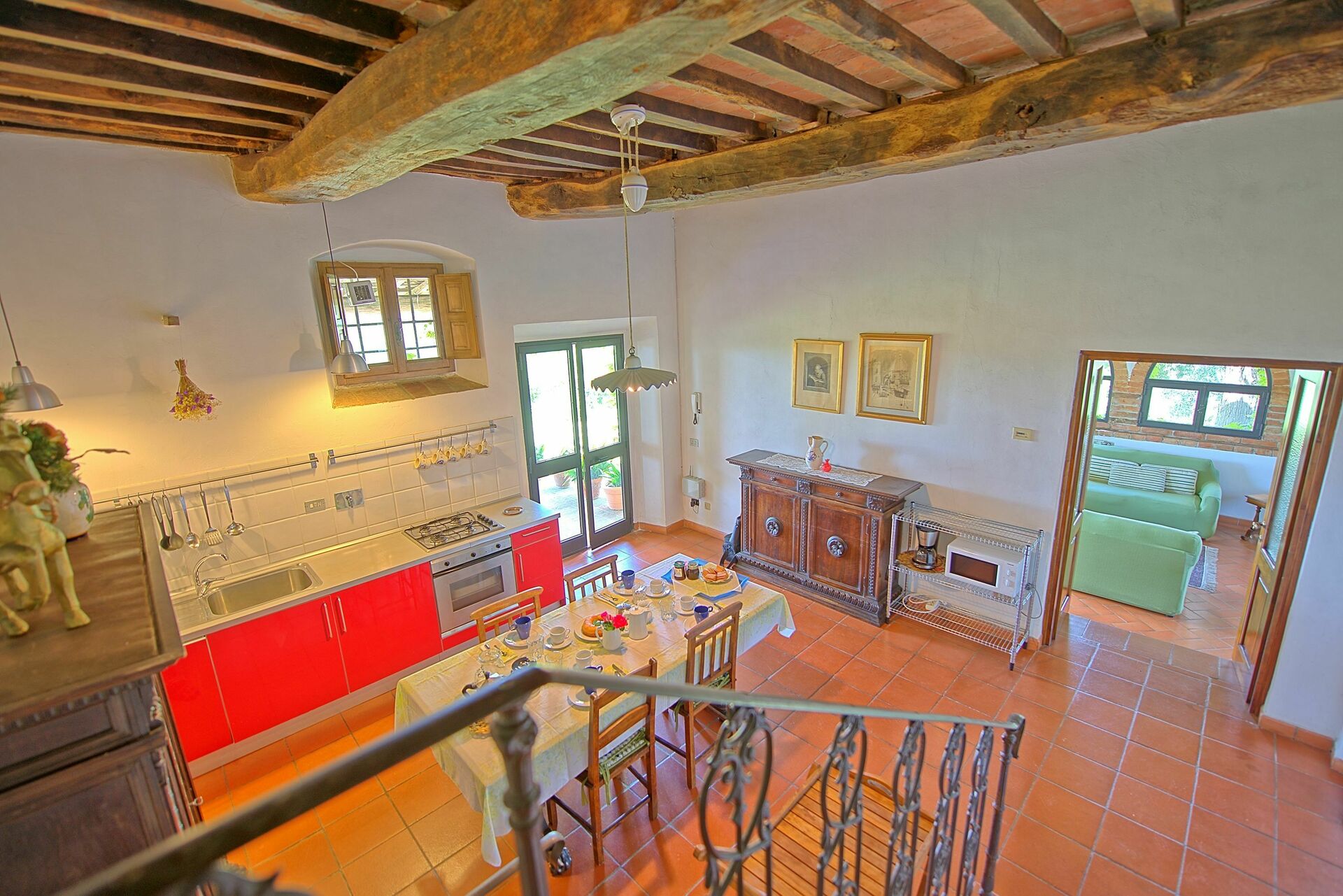 Piano terreno: zona pranzo con cucina (forno, freezer, microonde, 4 fuochi, macchina da caffè americano)