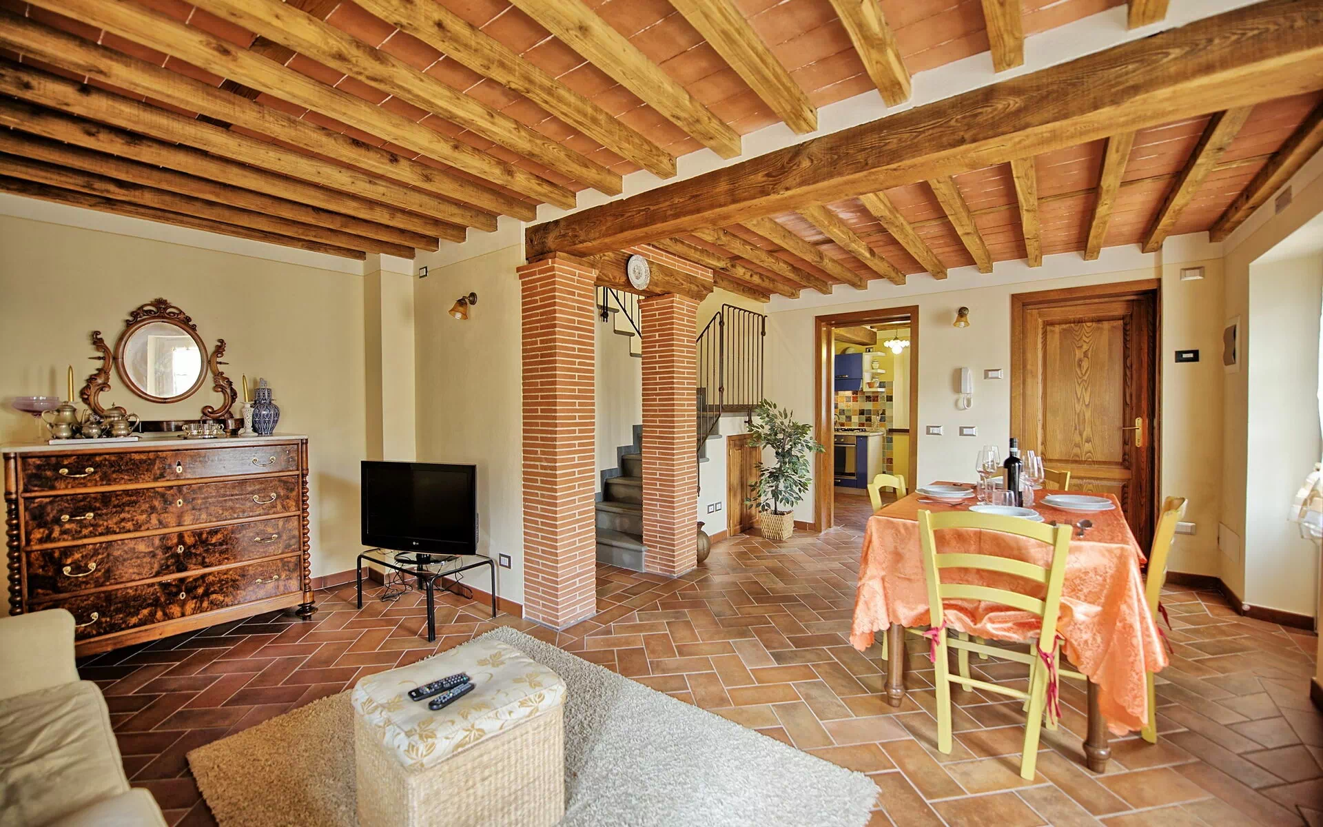 Die Wohnung hat in der ersten Etage ein Wohn-/Esszimmer, eine sehr gut ausgestattete Küche mit einem Gasherd, einem großen Kühlschrank, einr Spülmaschine und dem notwendigen Gechirr. Neben der Küche befindet sich ein kleines, modernes Badezimmer mit Dusche und Bidet. In der oberen Etage sind zwei Schlafzimmer und ein Badezimmer.