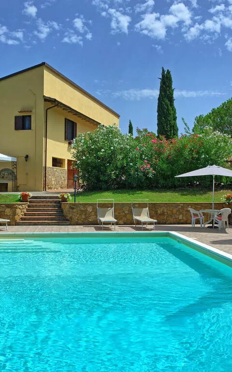 All'esterno, la casa in affitto è avvolta da un enorme giardino curato, ricco di piante e arbusti tipici della regione Toscana. L'area della piscina, totalmente riservata all'uso degli ospiti di Villa Gloria, è circondata da un solarium dotato di lettini , sedie, tavolini ed una doccia esterna: un luogo perfetto per passare lunghe e rilassanti ore sotto al sole o per rinfrescarsi nelle calde giornate estive insieme agli amici o alla propria famiglia.