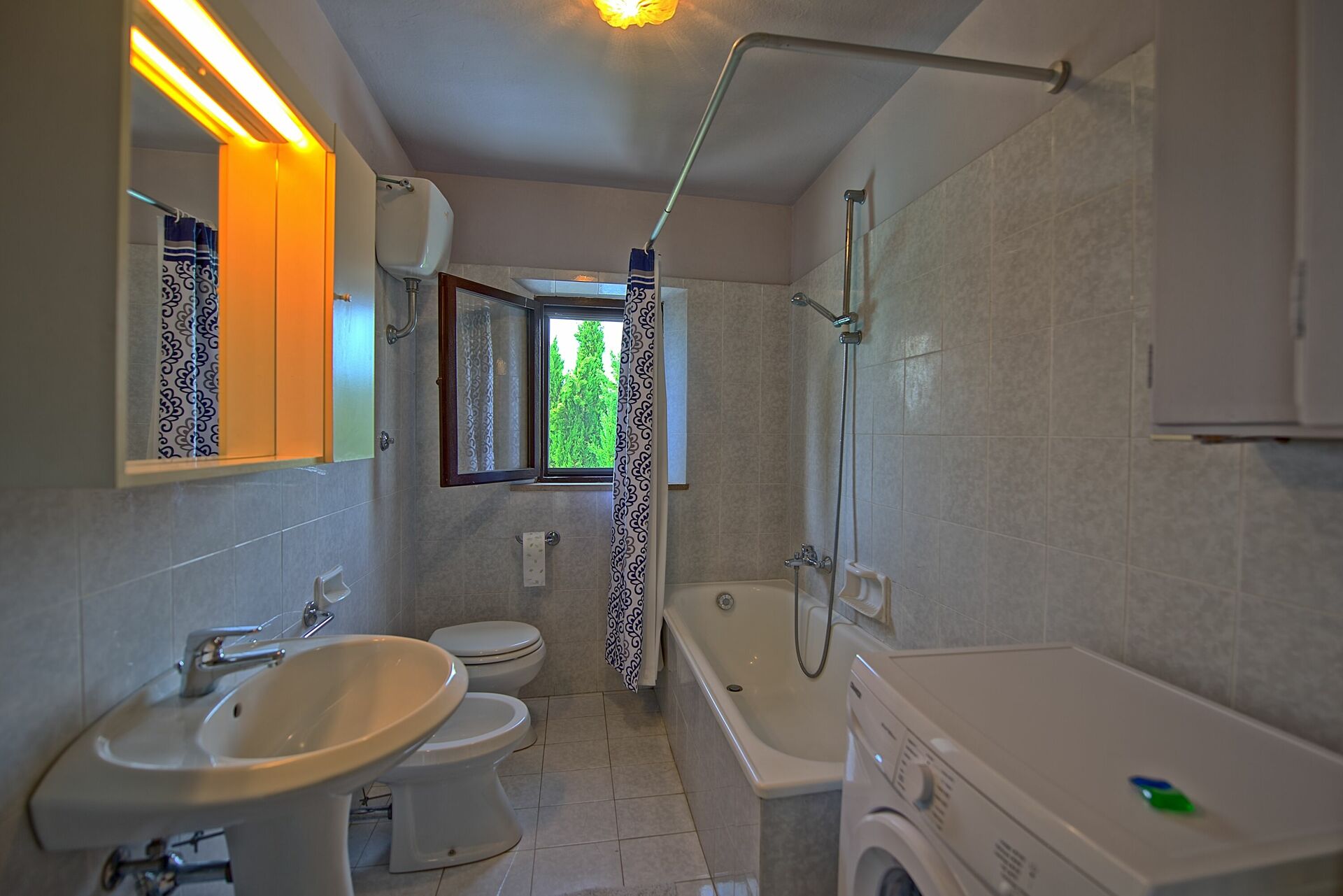 Primo piano (corta rampa di scale): sala da pranzo con angolo cucina (fornello, forno, frigorifero e lavastoviglie) con accesso a una terrazza, salotto (TV satellitare), camera matrimoniale con bagno privato (doccia), camera matrimoniale, bagno con vasca e lavatrice.