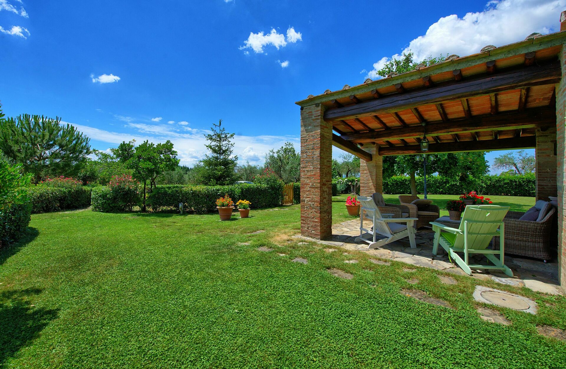 La villa in affitto è stata completamente rimodernata e dallo splendido giardino si gode di una bellissima vista sul tipico territorio del Chianti, ricco di vigneti, oliveti e boschi rigogliosi.