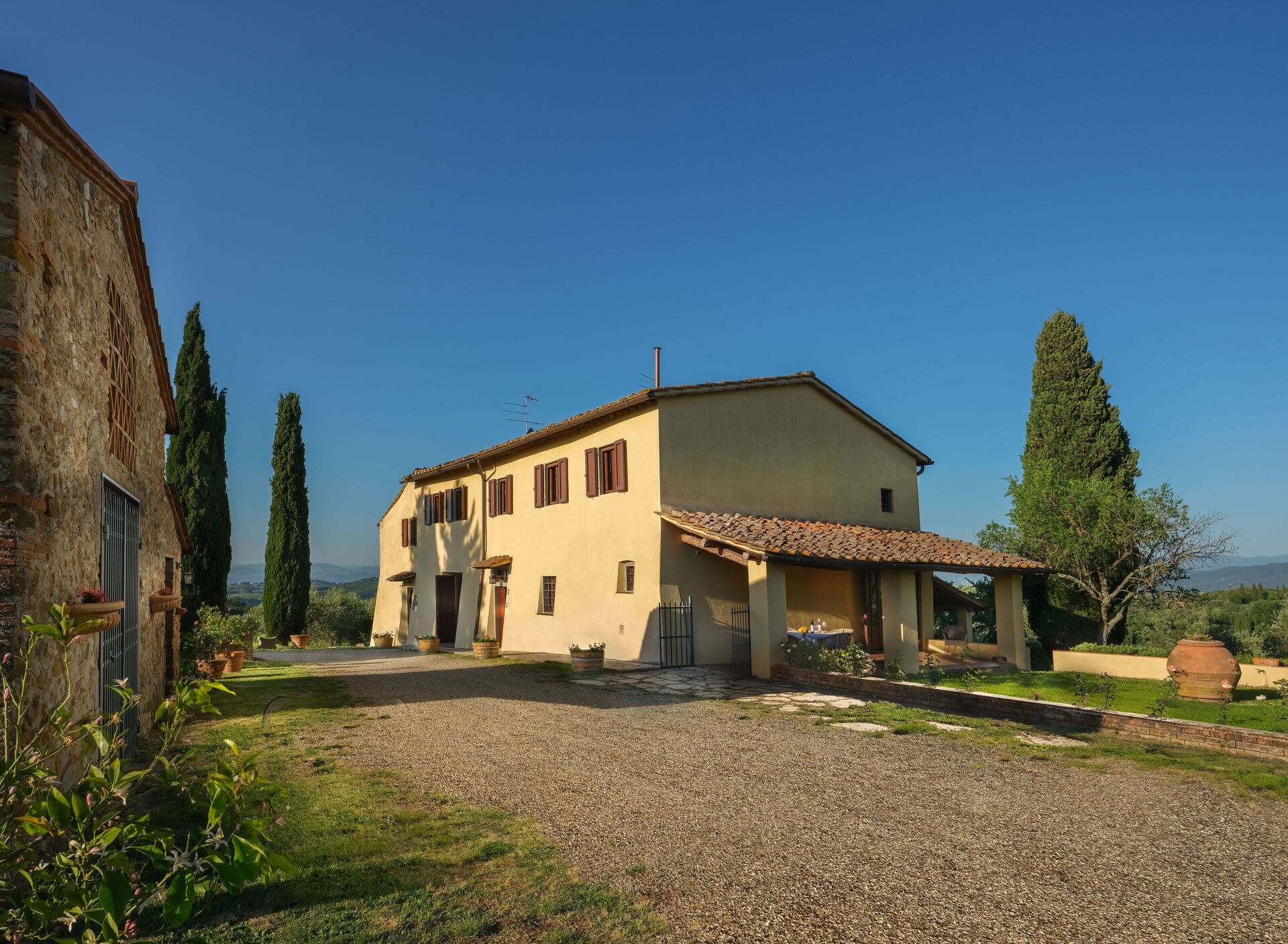 Questa bella casa colonica è situata in posizione tranquilla e panoramica con vista sulle colline del Chianti. La struttura è stata suddivisa in 3 spaziosi e confortevoli appartamenti (di cui uno abitato dai proprietari), arredati con cura e con gusto in stile rustico tipico toscano.