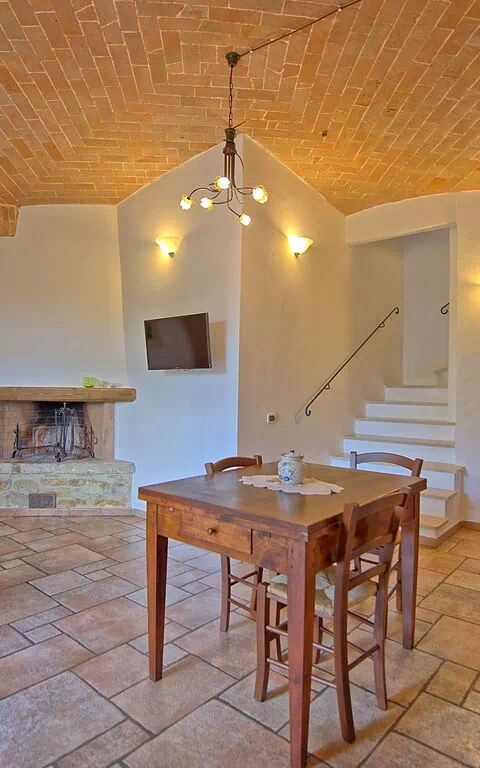 Piano terreno: ingresso su soggiorno (TV) con camino, zona pranzo e angolo cottura (microonde, lavastoviglie, freezer), WC.