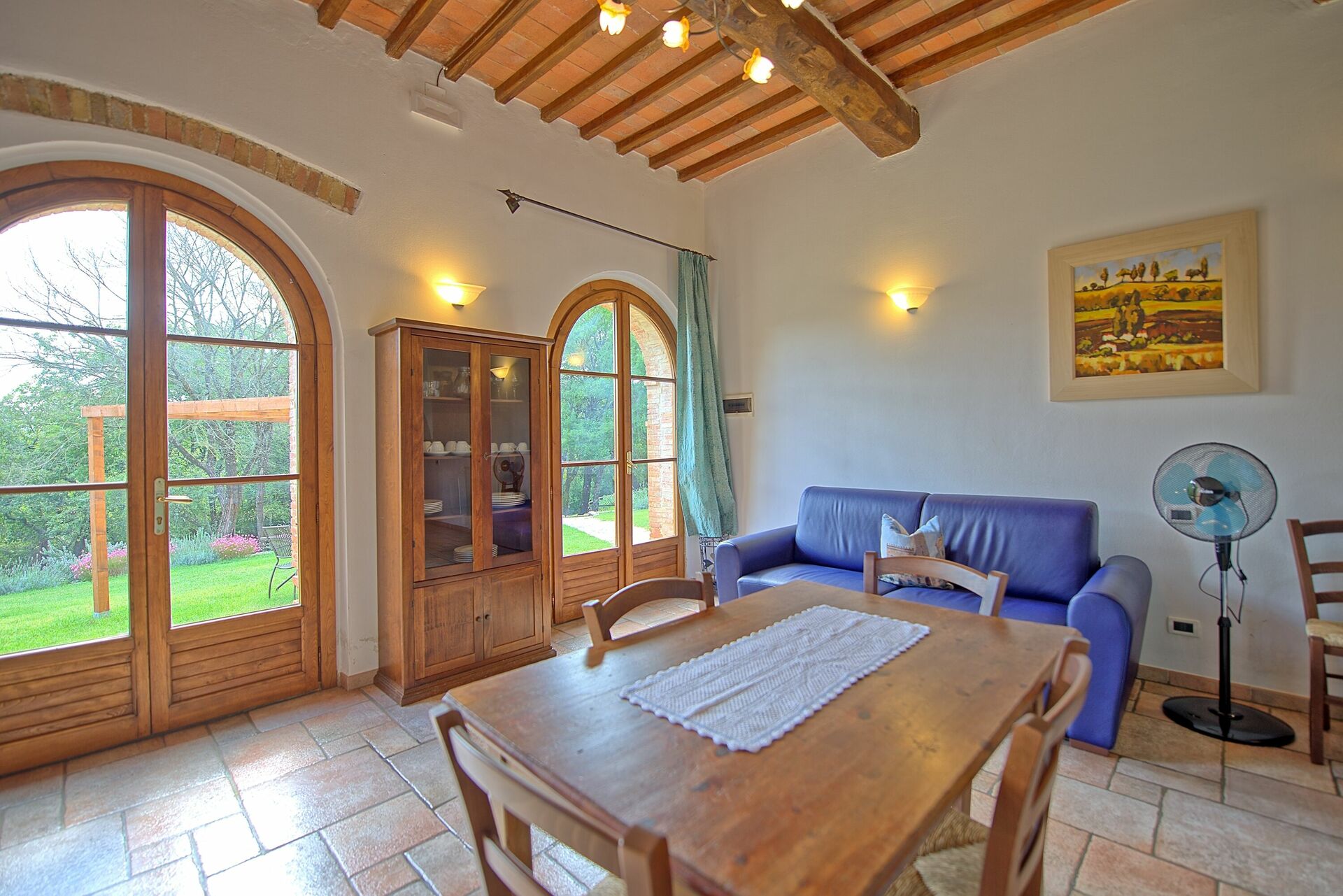 Piano terreno: ingresso su soggiorno (TV) con camino, zona pranzo e angolo cottura (freezer, microonde, lavastoviglie), WC, camera con un letto singolo e accesso sull'esterno, camera matrimoniale con accesso sull'esterno, bagno con doccia.