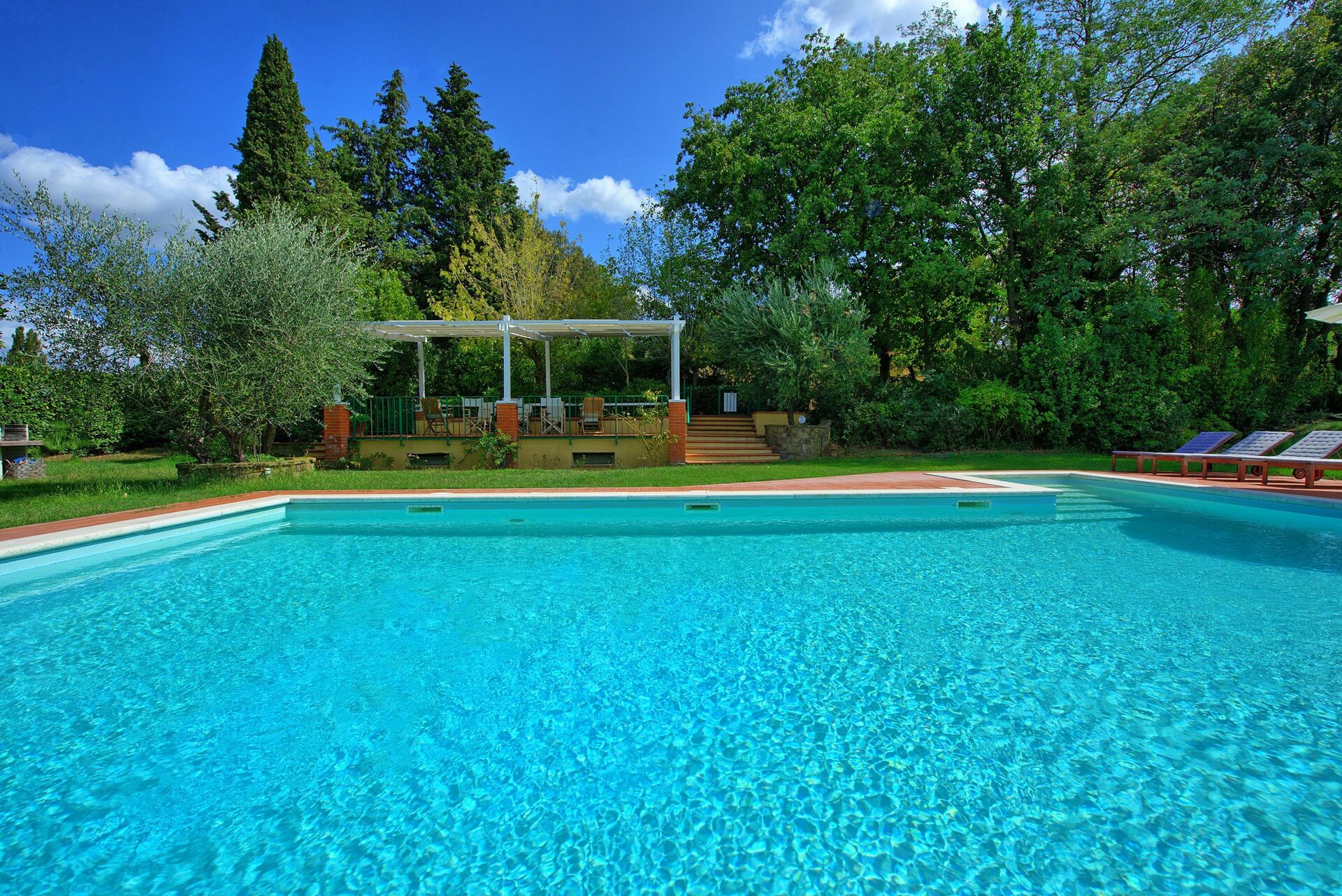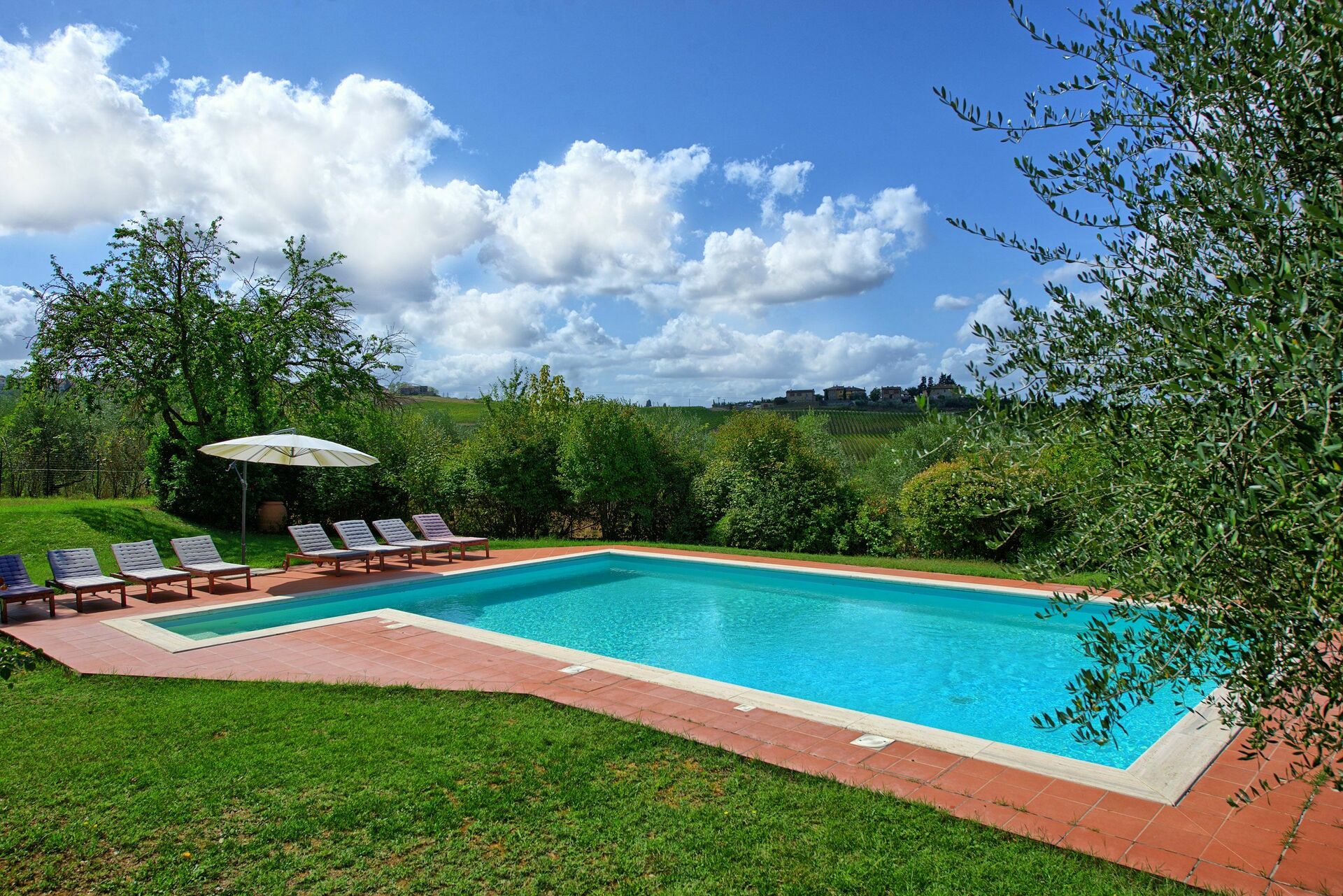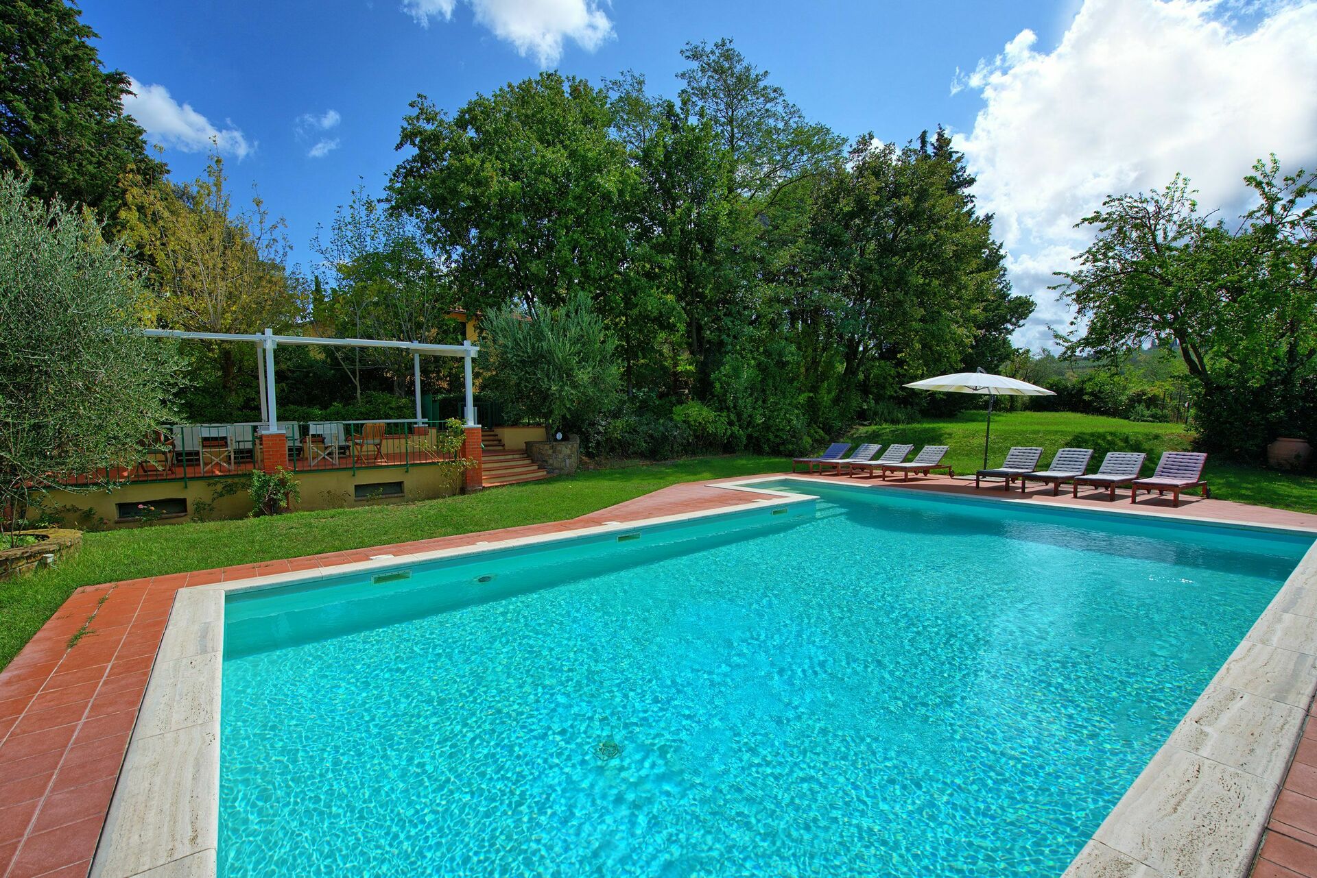All'esterno, la dimora è circondata da un bel giardino curato e da porticati attrezzati per poter mangiare all'aperto ammirando la bellissima vista panoramica sulle favolose colline del Chianti. A pochi metri dalla casa, gli ospiti possono usufruire di una bellissima piscina privata con vista panoramica, circondata da un solarium con lettini prendisole e ombrelloni: il luogo perfetto per passare giornate all'insegna del relax e per rinfrescarsi nelle calde giornate estive insieme alla propria famiglia o un gruppo di amici.
