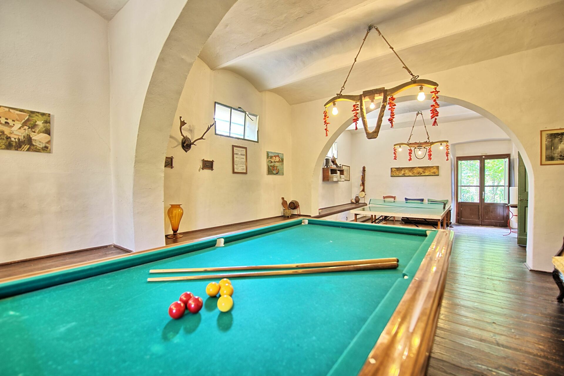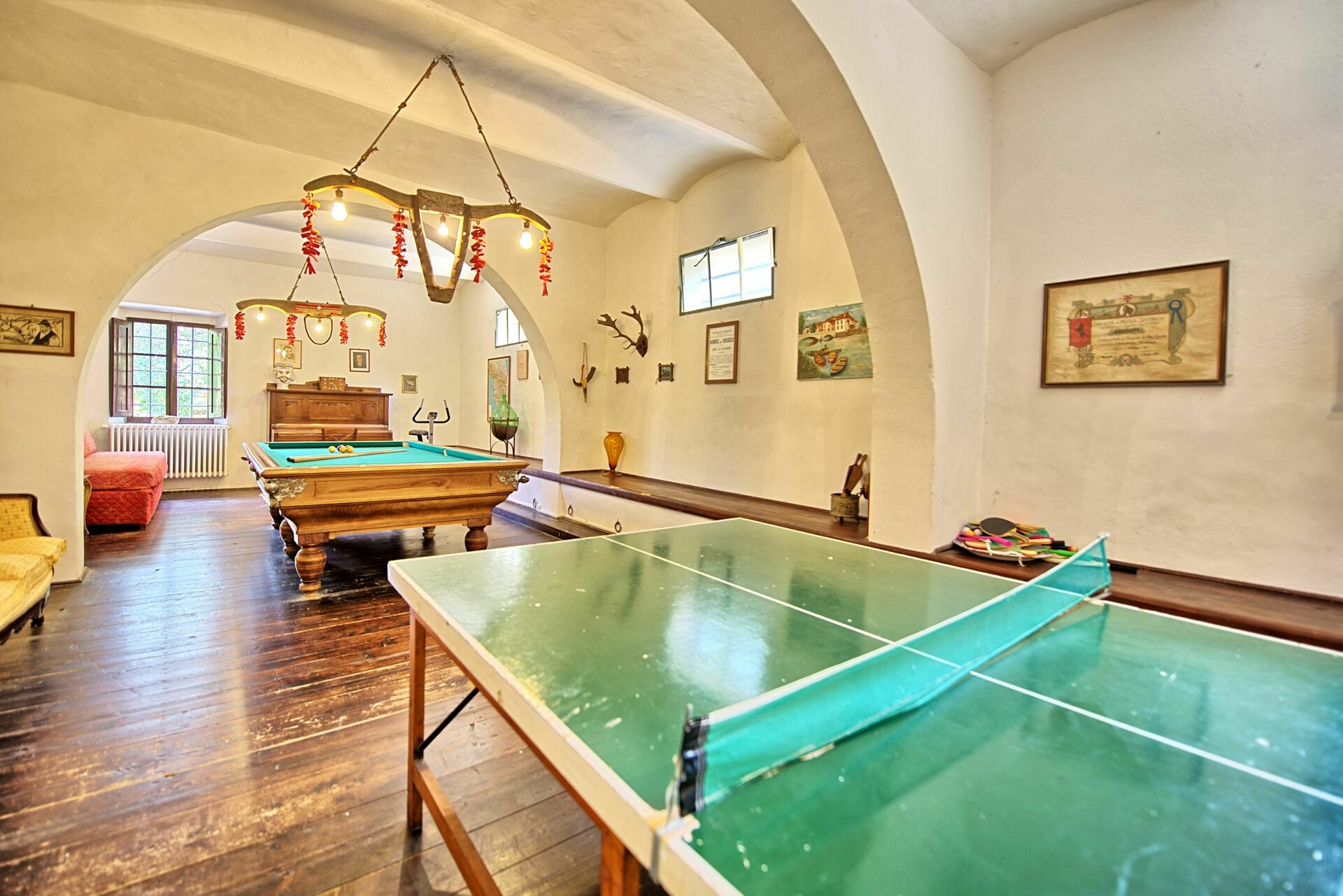 - sala interna (ricavata nella vecchia stalla) attrezzata con tavolo da biliardo, tavolo da ping pong, pianoforte e attrezzi per palestra e fitness: tapis roulant, ellittica